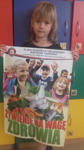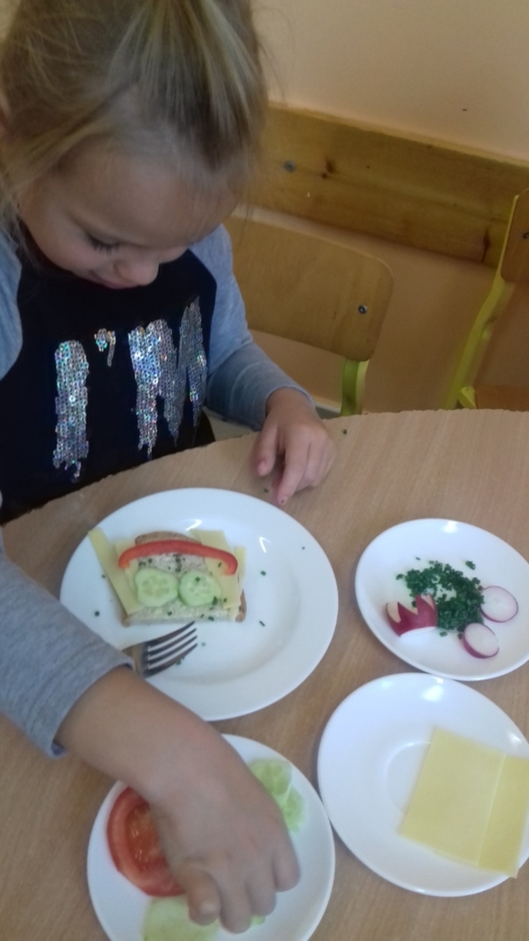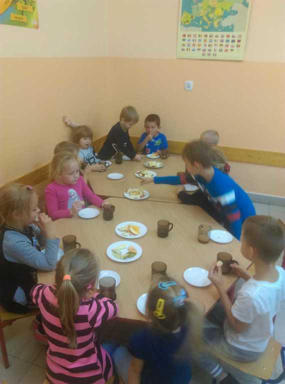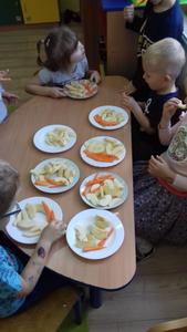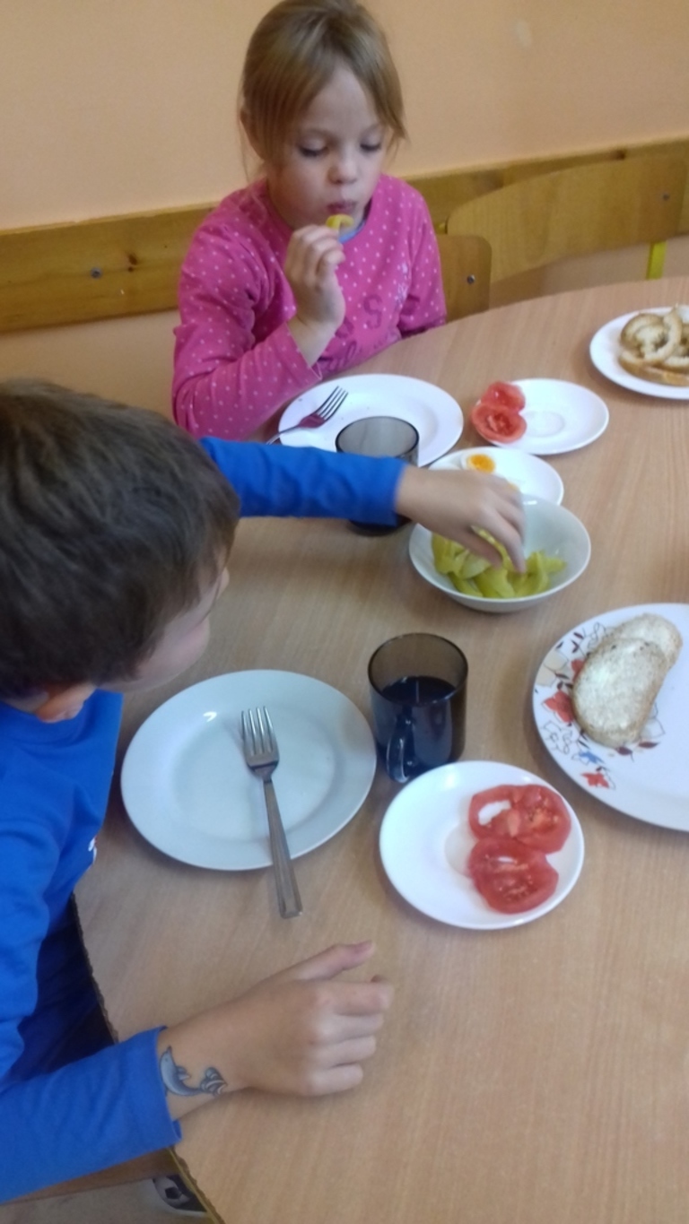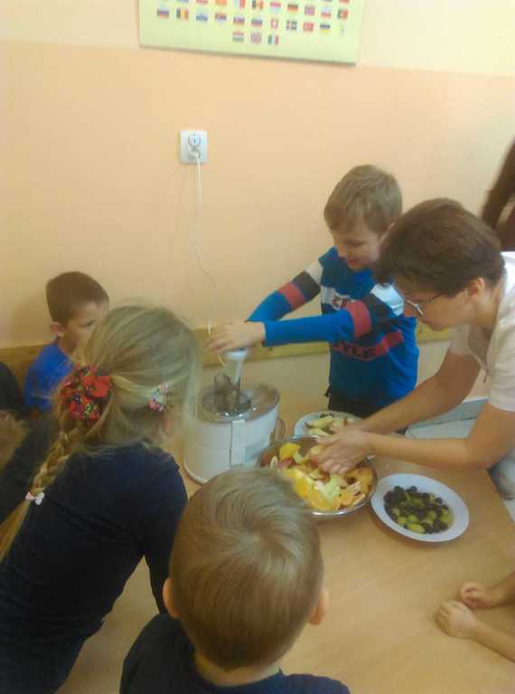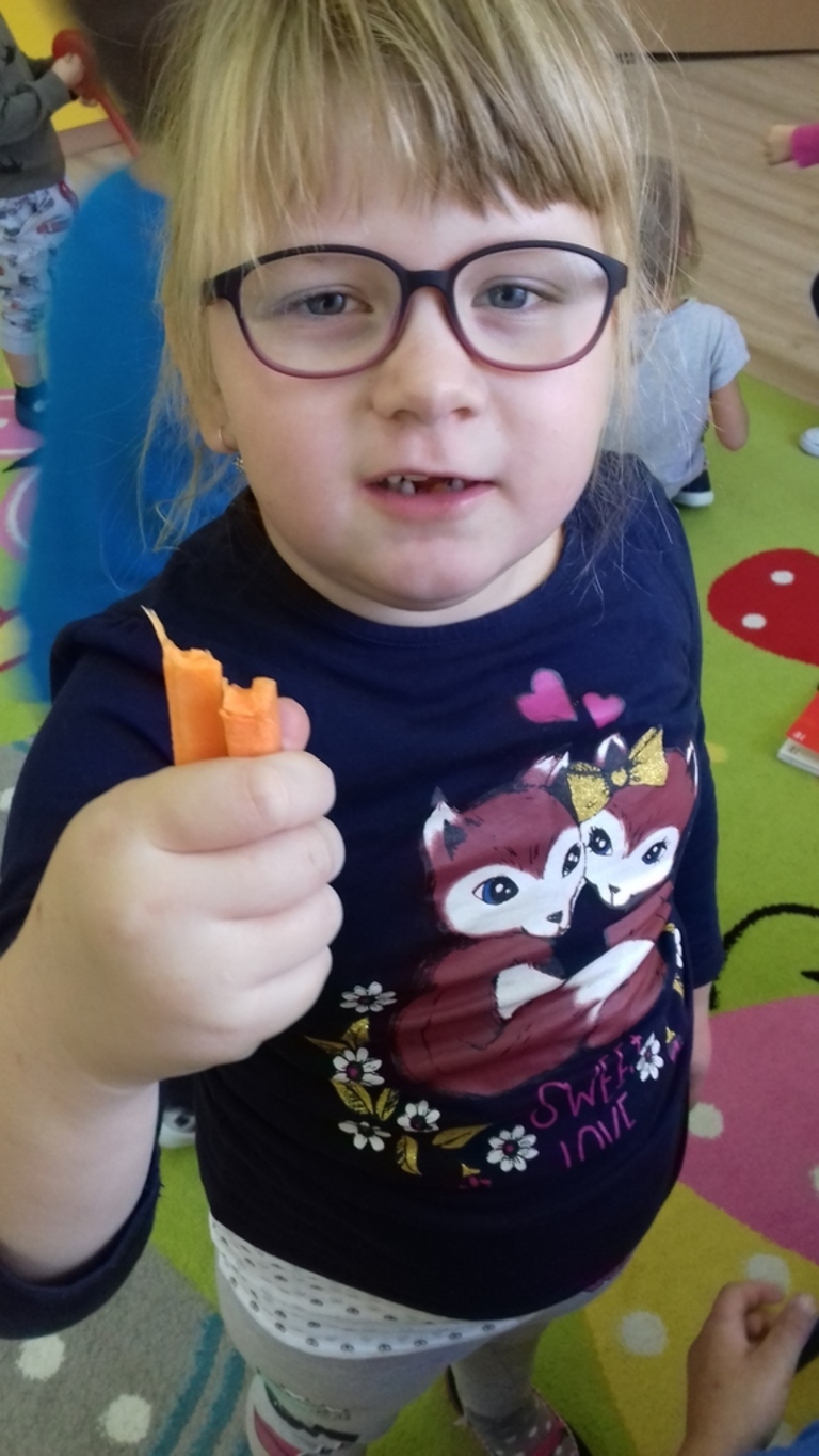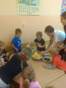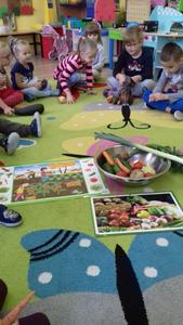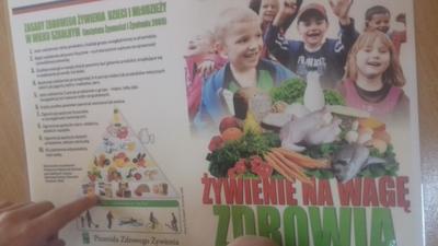 Podczas każdego posiłku zachęcamy dzieci do kosztowania różnych potraw, zwłaszcza ze względu na wartości odżywcze. Mówimy dzieciom o zawartych w nich witaminach. W ostatnim czasie zorganizowaliśmy cykl zajęć dotyczący witamin zawartych w owocach, warzywach oraz mleku i jego produktach. W tym celu odbyliśmy wycieczkę do sklepu spożywczego, aby zapoznać dzieci z wyglądem i nazwą różnych owoców i warzyw. Przedszkolaki przynosiły je również do przedszkola, aby potem zrobić z nich pyszny sok, kolorowe kanapki czy po prostu pochrupać marchewkę na drugie śniadanie. Dzieci chętnie zjadały w przedszkolu jogurt naturalny oraz piły koktajl owocowy, a podczas śniadania domagały się mleka z kakao. Przedszkolaki chętnie śpiewały piosenkę "Owoce i warzywa", obejrzały film edukacyjny "Zdrowe warzywa", a także z zainteresowaniem wysłuchały słów pani higienistki, która wyjaśniła im czego dotyczy Piramida Zdrowego Żywienia oraz zachęcała do zjadania warzyw i owoców ze względu na zawarte w nich witaminy.Bernadeta PłaczekMarta Godawa