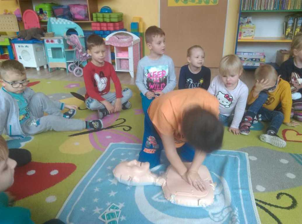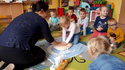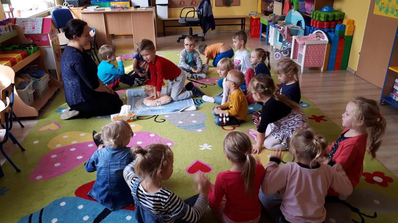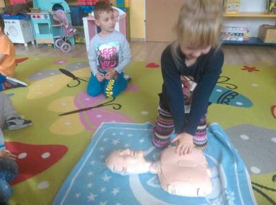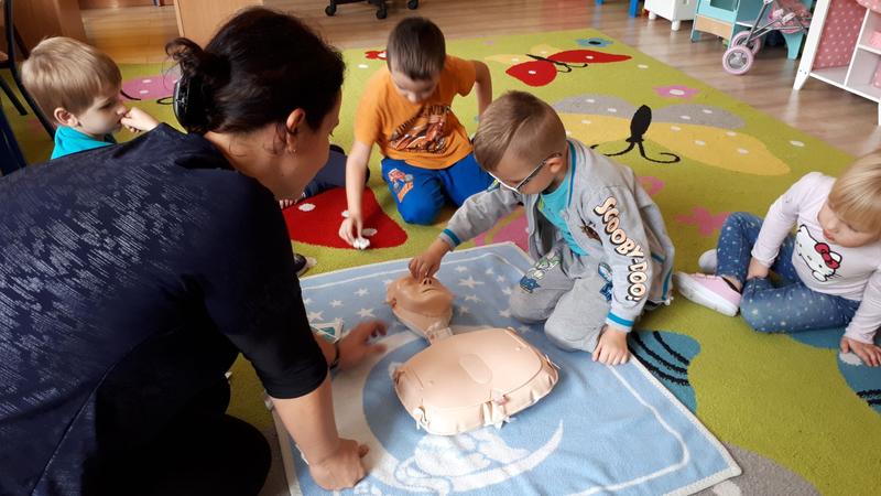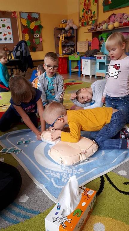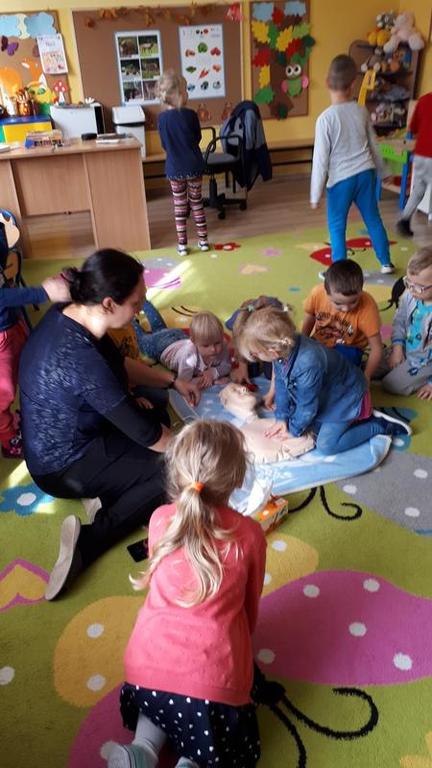 W piątek 11.10.2019 r. rozmawialiśmy o tym, jak należy zachować się w przypadku zagrożenia życia, zobaczyliśmy film instruktażowy „Doktor Kręciołek” oraz powtórzyliśmy numery alarmowe. Przypomnieliśmy sobie, co należy zrobić w przypadku, gdy poszkodowany nie oddycha i jego serce nie pracuje. Następnie przedszkolaki ćwiczyły na specjalnym fantomie przywracanie funkcji oddechowo - krążeniowych poprzez zabiegi resuscytacyjne. Wszystkie dzieci z zainteresowaniem brały udział w zajęciach oraz chętnie udzielały pierwszej pomocy. Nasi mali ratownicy teraz już na pewno wiedzą, jak trzeba zachować się w sytuacji, gdy ktoś potrzebuje pomocy. A za kilka dni starszaki wspólnie z uczniami Szkoły Podstawowej wezmą udział w biciu rekordu w jednoczesnym prowadzeniu resuscytacji krążeniowo-oddechowej, który organizuje Fundacja Wielka Orkiestra Świątecznej Pomocy.