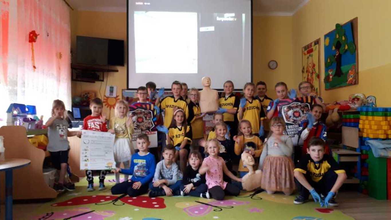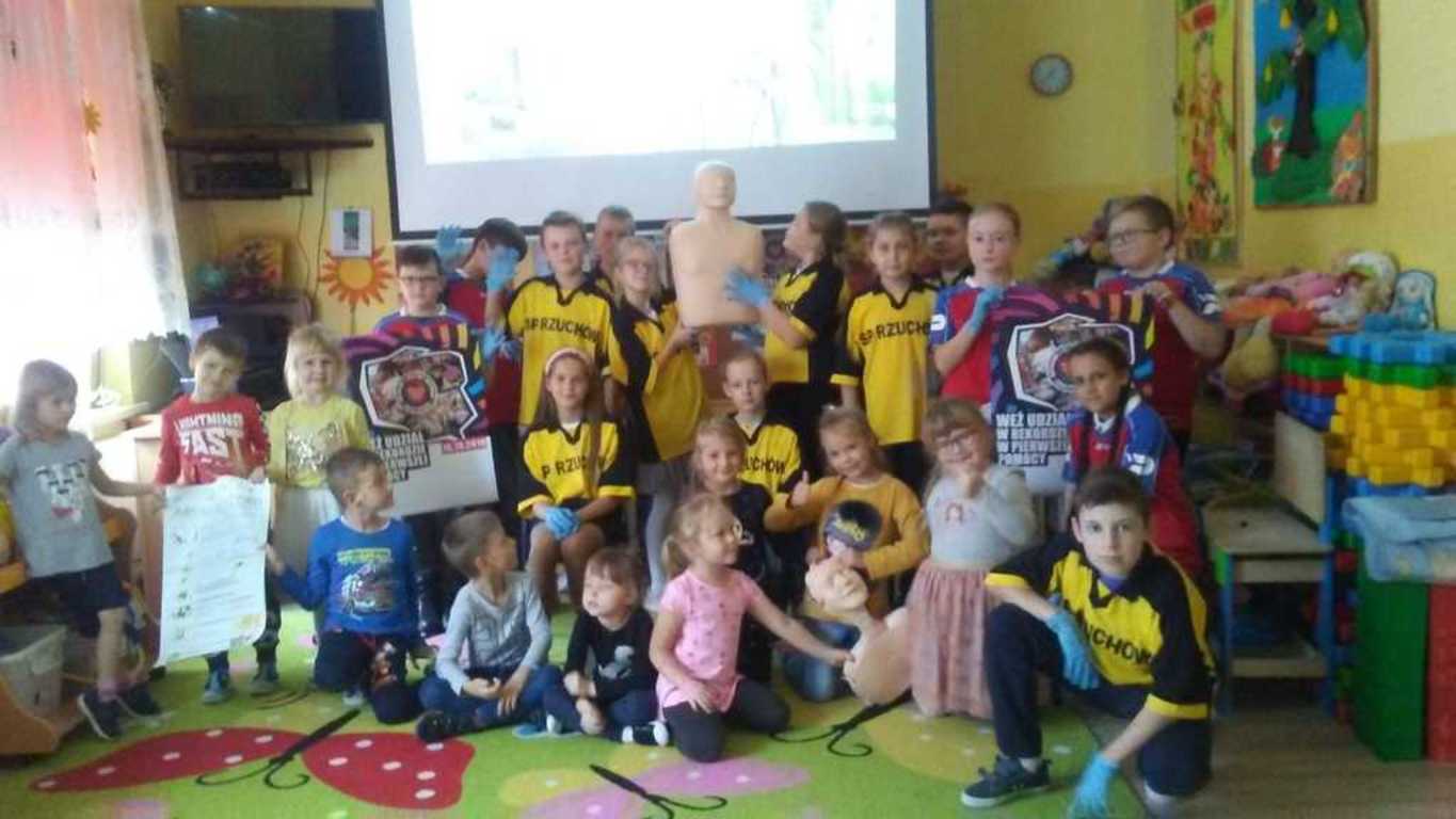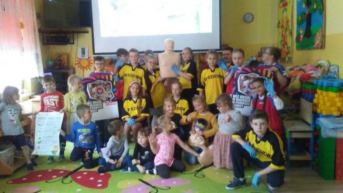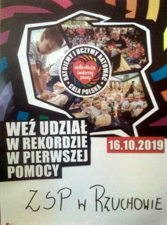 W środę 16 października przedszkolaki oraz uczniowie Zespołu Szkolno - Przedszkolnego w Rzuchowie obchodzili Europejski Dzień Przywracania Czynności Serca, który powstał z inicjatywy Europejskiej Rady Resuscytacji (ERC) w ramach podnoszenia świadomości społecznej związanej z problemem nagłego zatrzymania krążenia (NZK). Z tej okazji wzięliśmy udział w ogólnopolskiej akcji bicia rekordu polegającego na zaangażowaniu jak największej liczby osób, które w tym samym czasie udzielają pierwszej pomocy na fantomach. Akcja ta zorganizowana została przez Wielką Orkiestrę Świątecznej Pomocy. W biciu rekordu w naszej placówce wzięło udział 24 uczniów i przedszkolaków oraz 3 opiekunów. Wszyscy z wielkim zaangażowaniem przez 30 minut „ratowali życie ludzkie”. O godzinie 12.30 przedszkolaki oraz uczniowie, trochę zmęczeni, ale zadowoleni, stanęli do pamiątkowego zdjęcia oraz wymienili spostrzeżenia dotyczące akcji zorganizowanej przez Fundację Wielkiej Orkiestry Świątecznej Pomocy.