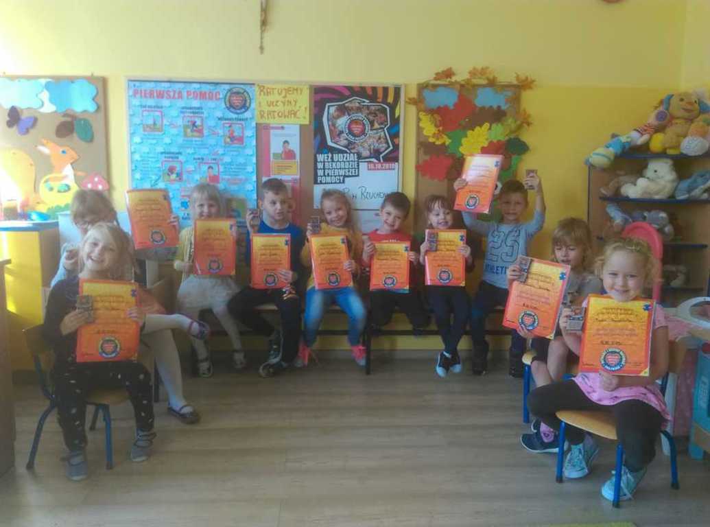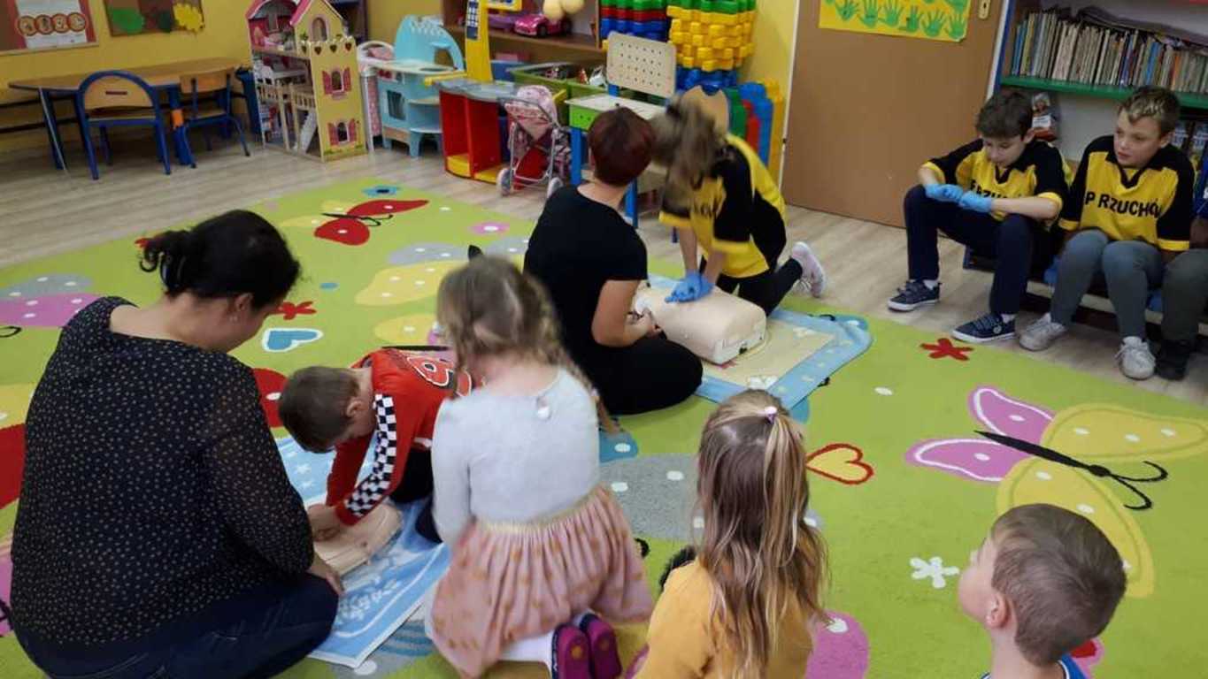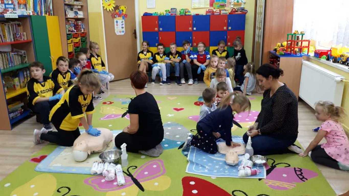 W środę 16 października przedszkolaki oraz uczniowie Zespołu Szkolno - Przedszkolnego w Rzuchowie obchodzili Europejski Dzień Przywracania Czynności Serca, który powstał z inicjatywy Europejskiej Rady Resuscytacji (ERC) w ramach podnoszenia świadomości społecznej związanej z problemem nagłego zatrzymania krążenia (NZK). Z tej okazji wzięliśmy udział w ogólnopolskiej akcji bicia rekordu polegającego na zaangażowaniu jak największej liczby osób, które w tym samym czasie udzielają pierwszej pomocy na fantomach. Akcja ta zorganizowana została przez Wielką Orkiestrę Świątecznej Pomocy. W biciu rekordu w naszej placówce wzięło udział 24 uczniów i przedszkolaków oraz 3 opiekunów. Wszyscy z wielkim zaangażowaniem przez 30 minut „ratowali życie ludzkie”. O godzinie 12.30 przedszkolaki oraz uczniowie, trochę zmęczeni, ale zadowoleni, stanęli do pamiątkowego zdjęcia oraz wymienili spostrzeżenia dotyczące akcji zorganizowanej przez Fundację Wielkiej Orkiestry Świątecznej Pomocy.