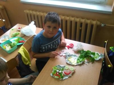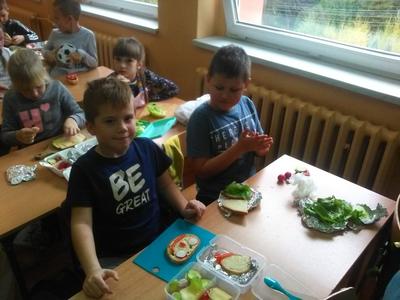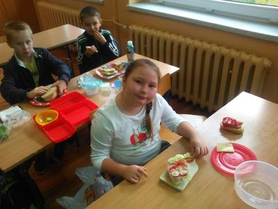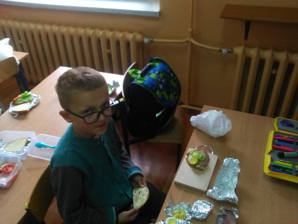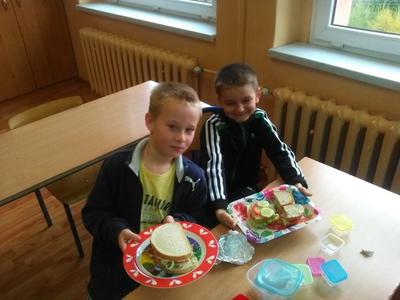 W pierwszym tygodniu listopada klasa pierwsza zapoznaje się z zasadami zdrowego odżywiania. We wtorek uczniowie podjęli wyzwanie godne rangi "Masterchefa". Ich zadaniem było zrobić samodzielnie smaczne, zdrowe i kolorowe kanapki, na których, jak się okazało, zagościły różnorodne, pełne witamin przysmaki. Kanapki były pełne zdrowych dodatków. Nie zabrakło wśród nich jajek, papryki, pomidorów, rzodkiewki, sałaty czy rukoli. Sądząc po panującej atmosferze wcielenie się w rolę kucharza sprawiło dzieciom mnóstwo satysfakcji, a kanapki znikały w mgnieniu oka.