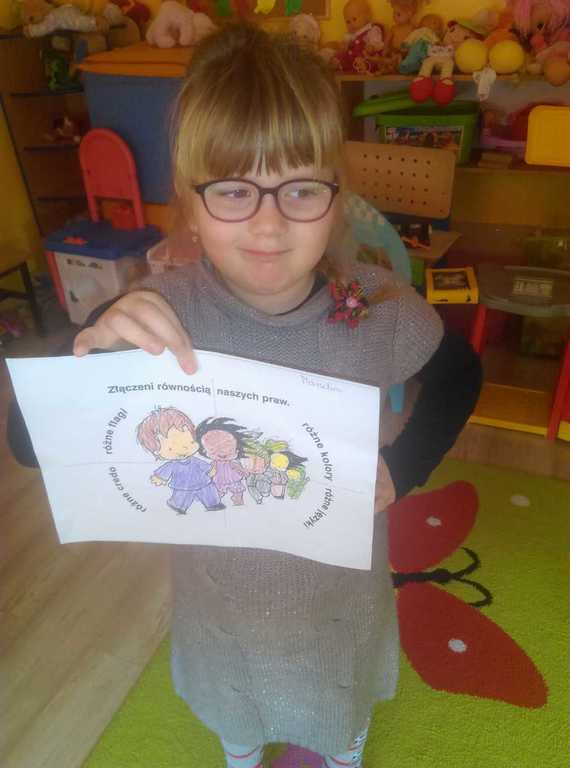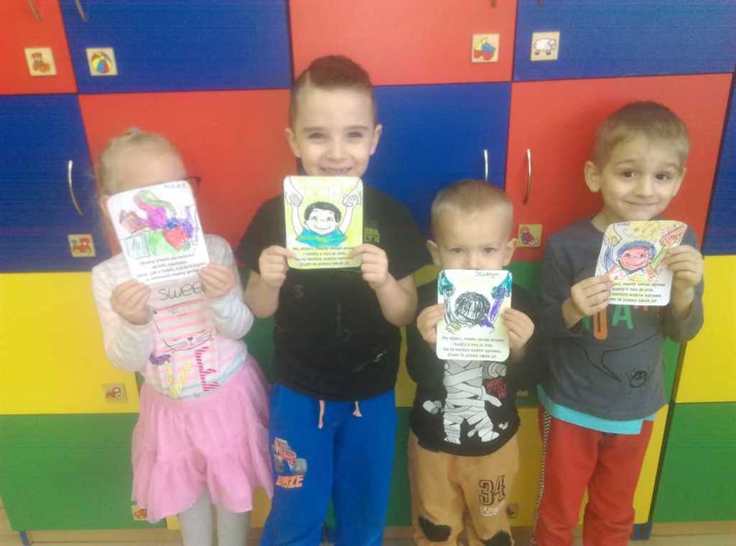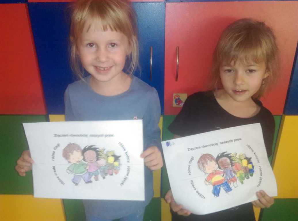 W środę 20 listopada przedszkolaki wzięły udział w obchodach Międzynarodowego Dnia Praw Dziecka. Nasze zajęcia rozpoczęliśmy od zapoznania się z Konwencją o prawach dziecka, która została uchwalona 20.11.1989 roku przez Organizację Narodów Zjednoczonych. Jest to najważniejszy dokument dotyczący praw dzieci na świecie. Zaznacza, że każdemu dziecku, niezależnie od koloru skóry, wyznania czy pochodzenia, przysługują takie same prawa. Dzieci z zainteresowaniem słuchały o swoich prawach a także zadawały mnóstwo pytań. Następnie utrwaliliśmy prawa dziecka poprzez przeanalizowanie szkolnej gazetki wiszącej na korytarzu oraz stworzyliśmy wspólny plakat. Przy tej okazji przypomnieliśmy sobie także zasady panujące w przedszkolu. Na zakończenie przedszkolaki grzecznie i zgodnie razem się bawiły, a chętne dzieci kolorowały obrazek pt. „Złączeni równością naszych praw”. Cały dzień upłynął nam w miłej i radosnej atmosferze i był świetna okazją do tego, aby przypomnieć wszystkim, że każde dziecko to Mały Człowiek posiadający swoje prawa.