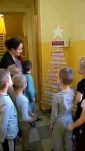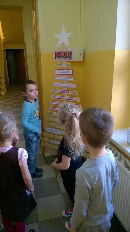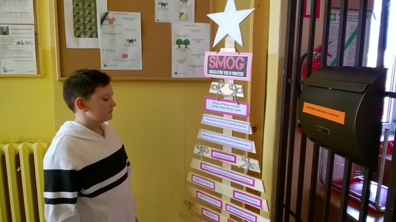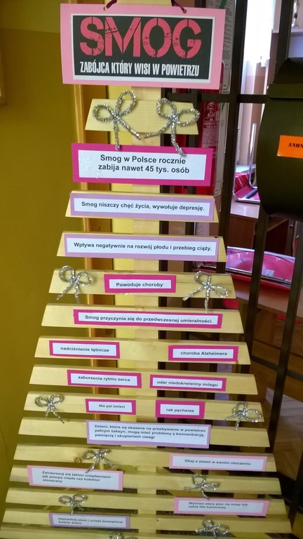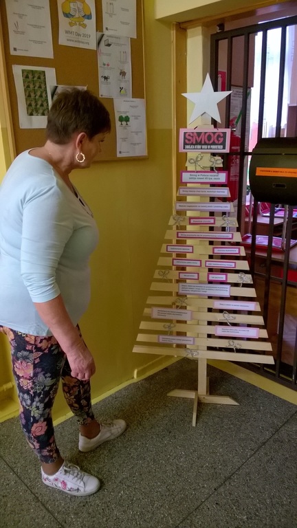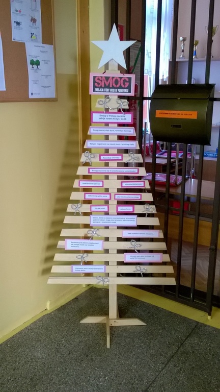 W ramach konkursu „Nie truj sąsiada’ w szkole powstała specjalna choinka. Nazwaliśmy ją antysmogową, ponieważ ubrana jest w srebrne kokardki i kolorowe hasła prezentujące ważne informacje dotyczące szkodliwości smogu i sposobów jego zwalczania. Choinka ustawiona jest w takim miejscu, aby każdy wchodzący do szkoły mógł zwrócić na nią uwagę. W ten oryginalny sposób chcieliśmy zainteresować tematyką smogu i zainspirować do działań antysmogowych.