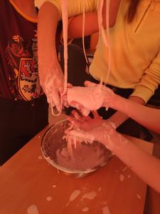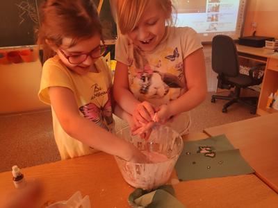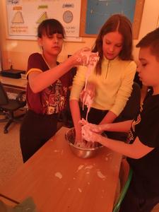 Poniżej zamieszczamy też zdjecia, na których pokazano jak uczniowie stworzyli ciecz newtonowską i sprawdzali jej niesamowite właściwości... Do takiego eksperymentowania zapraszamy wszystkich ciekawych - doświadczenie można wykonać w domu.