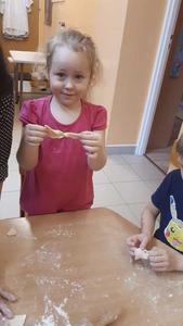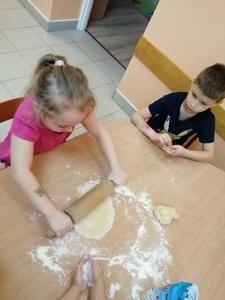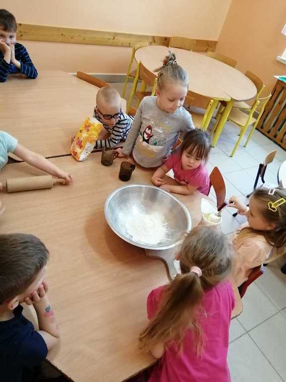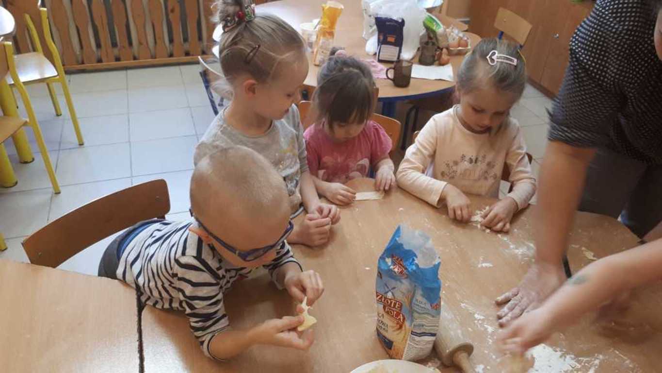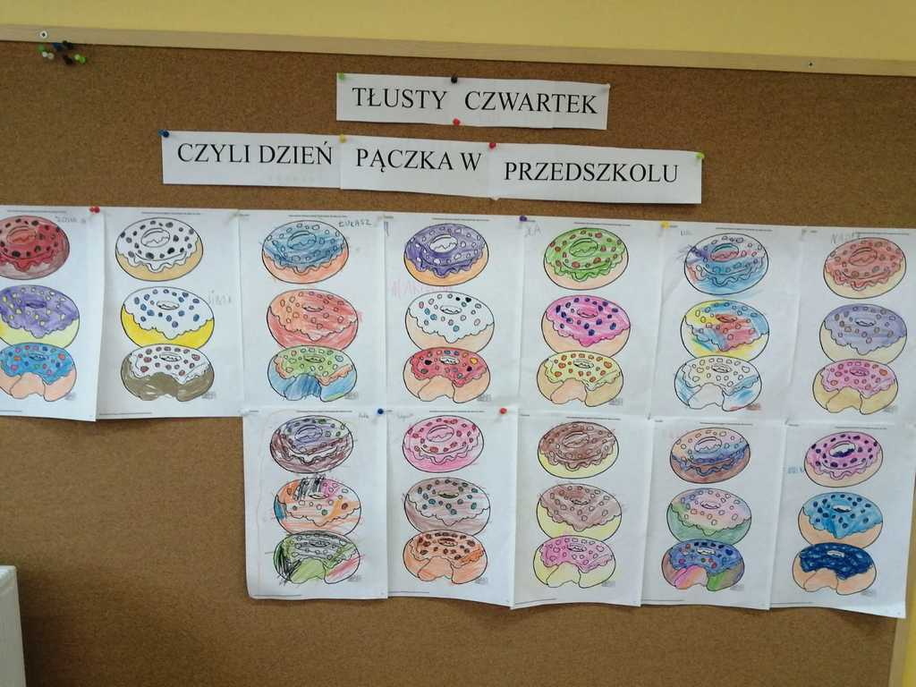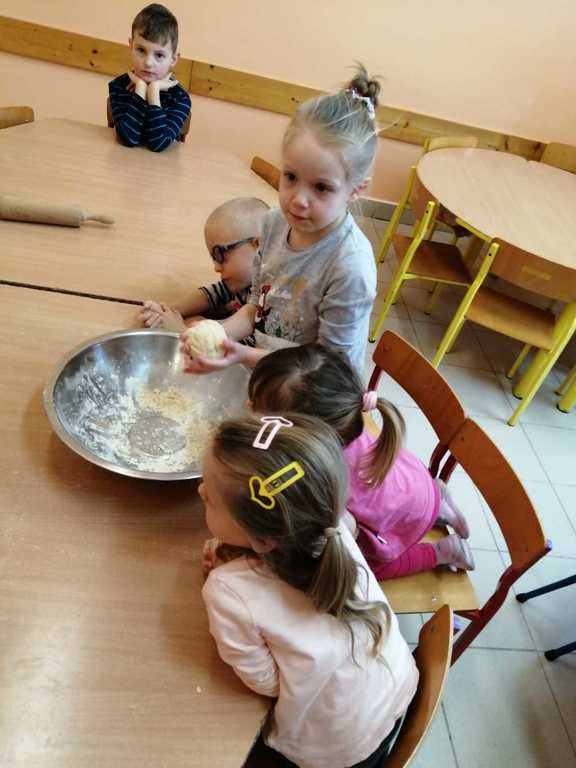 Karnawał to czas uczt i zabaw. Najhuczniej i najweselej obchodzimy „ostatki”, a przede wszystkim „tłusty czwartek”, który w naszym przedszkolu obchodziliśmy 20 lutego. W tym dniu rozmawialiśmy o zdrowych i niezdrowych produktach oraz ustaliliśmy, że słodycze jedzone w nadmiarze są niezdrowe. Następnie dzieci kolorowały na kartce swoje ulubione pączki oraz nauczyły się wierszyka pt: „Pączek”. Obejrzeliśmy także film instruktażowy o tym, jak samodzielnie zrobić pączki i faworki. Zdecydowaliśmy, że zrobimy faworki, więc przygotowaliśmy odpowiednie składniki. Przedszkolaki wsypywały mąkę, wbijały jajka, wyrabiały ciasto oraz wałkowały. Gotowe faworki zaniosły do kuchni, gdzie pani Ilona usmażyła je. Następnie posypaliśmy faworki cukrem pudrem i rozpoczęliśmy degustację. Na koniec każde dziecko zjadło jeszcze pysznego pączka na podwieczorek. Cały dzień upłynął nam w miłej atmosferze i był doskonałą okazją do przypomnienia i kultywowania naszych narodowych tradycji i zwyczajów.