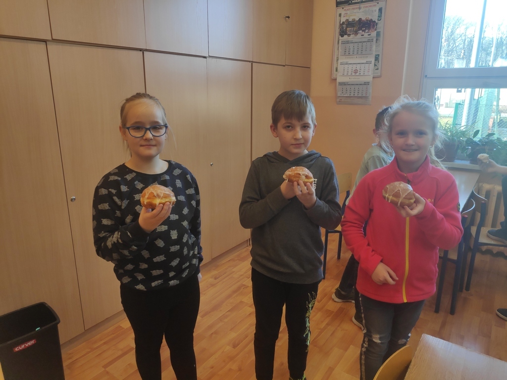 Tłusty czwartek kojarzymy z konsumpcją pączków oraz faworków. Jest to ostatni czwartek przed Wielkim Postem. Tłusty czwartek rozpoczyna ostatni tydzień karnawału. Wedle tradycji w tym dniu dozwolone jest objadanie się. Tego dnia nawet osoby liczące każdą kalorię nie oprą się pokusie zjedzenia przynajmniej jednego pączka. W naszej szkole już od rana można było poczuć zapach pysznych, świeżych pączków. Dziękujemy Radzie Rodziców za zakupienie dla wszystkich uczniów pachnących, smacznych pączków. W czwartkowy poranek każdy mały łasuch mógł więc poczęstować się tym smakołykiem i delektować się jego smakiem.