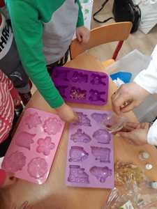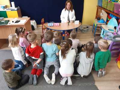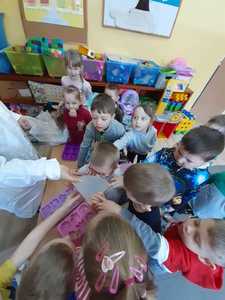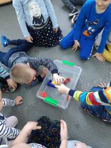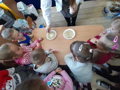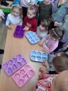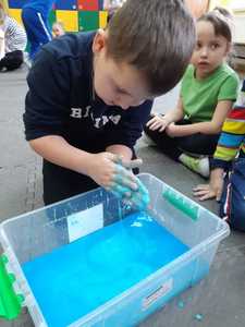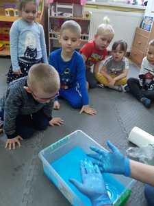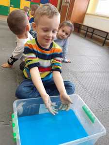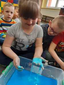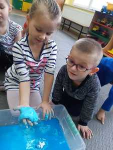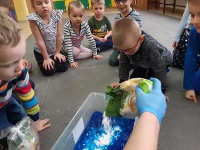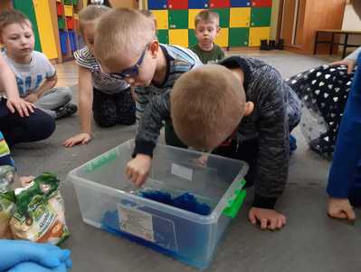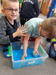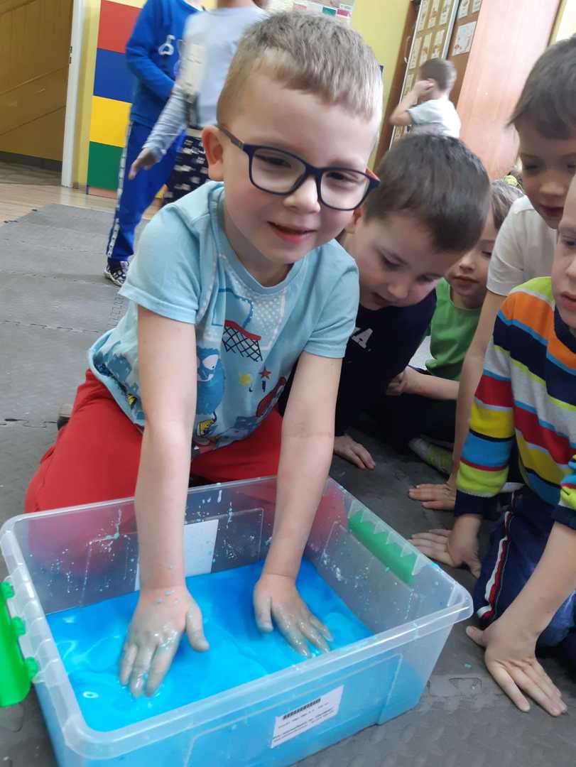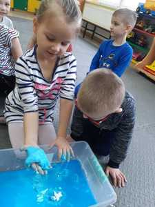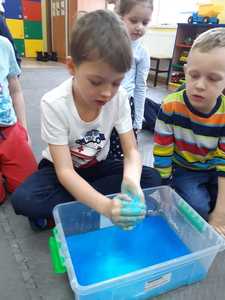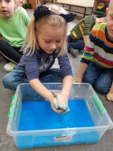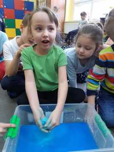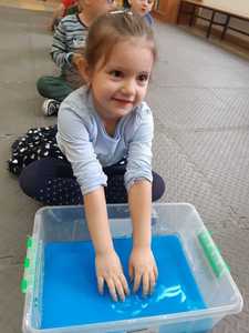 W tym tygodniu nasze przedszkolaki z dużym zaangażowaniem uczestniczyły w zajęciach, podczas których badały właściwości fizyczne wody. Po zastosowaniu metody aktywizującej- burzy mózgów - można było zauważyć, że dzieci posiadają już znaczną wiedzę na temat znaczenia wody w przyrodzie i w życiu człowieka. Następnie wykorzystując swoje zmysły dzieci określały kolor, zapach, smak wody. Badały także zjawisko rozpuszczalności różnych substancji w wodzie. Wyciągały trafne wnioski z doświadczenia, potrafiły określić, jakie substancje rozpuszczają się w wodzie, a jakie nie. Nie zabrakło również eksperymentów takich jak np ,,Wędrująca woda" czy zabawy sensorycznej ,,Ciecz nienewtonowska", która dostarczyła dzieciom wiele radości. W piątek 12 lutego odwiedziła nas nasza Pani Dyrektor, która w ramach działania koła eksperymentalnego działającego w szkole opowiedziała przedszkolakom o prawach fizyki oraz zaprosiła dzieci do wspólnego wykonania kolorowych mydełek. Z pewnością była to jedna z lepszych atrakcji, która wywołała na twarzach dzieci szerokie uśmiechy.