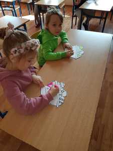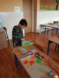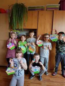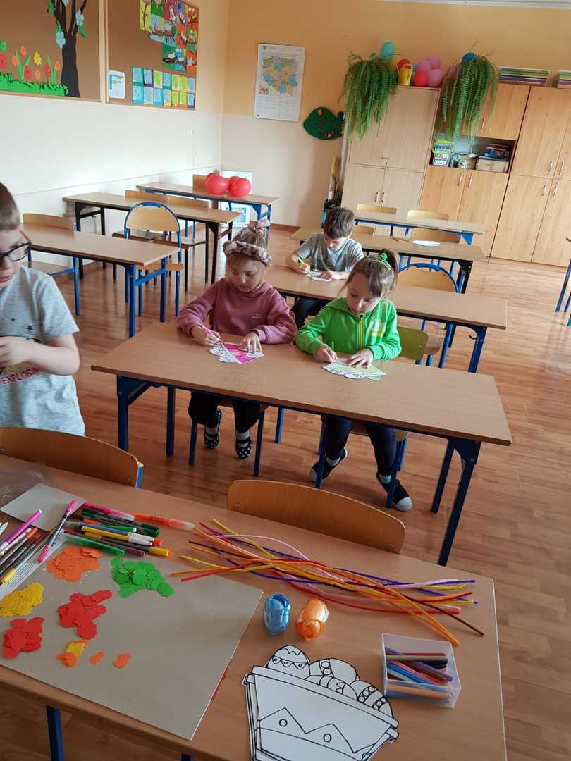 W ramach współpracy i integracji z przedszkolem odbyły się wiosenno - wielkanocne zajęcia plastyczne, w których uczestniczyły dzieci sześcioletnie. W trakcie pobytu w szkole dzieci przedszkolne miały okazję zapoznać się z wyposażeniem klasy w różne sprzęty i pomoce, a także pracować samodzielnie w osobnej ławce. Podczas zajęć przedszkolaki z uwagą i skupieniu słuchały instrukcji i wskazówek nauczyciela. Po krótkim wstępie i rozmowie, uczestnicy zajęć z wielką ochotą zabrali się do twórczej pracy. W ruch poszły kredki, mazaki, druciki, kolorowy papier i elementy dekoracyjne. Praca plastyczna przyniosła dzieciom wiele radości, czego dowodem było duże zaangażowanie oraz zainteresowanie tematem. Na zakończenie za aktywność w zajęciach dzieci otrzymały drobne nagrody.