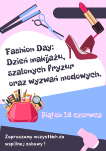 Samorząd Uczniowski zaprasza wszystkich uczniów do udziału w "Dniu makijażu, szalonych fryzur oraz wyzwań modowych", który odbędzie się w naszej szkole w piątek 18 czerwca. W tym dniu możesz przyjść do szkoły w nietypowej fryzurze, makijażu oraz ciekawym stroju.