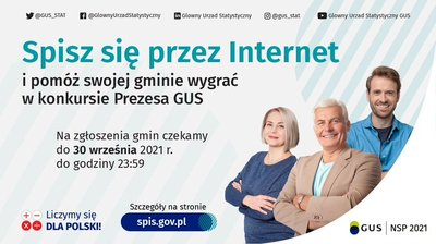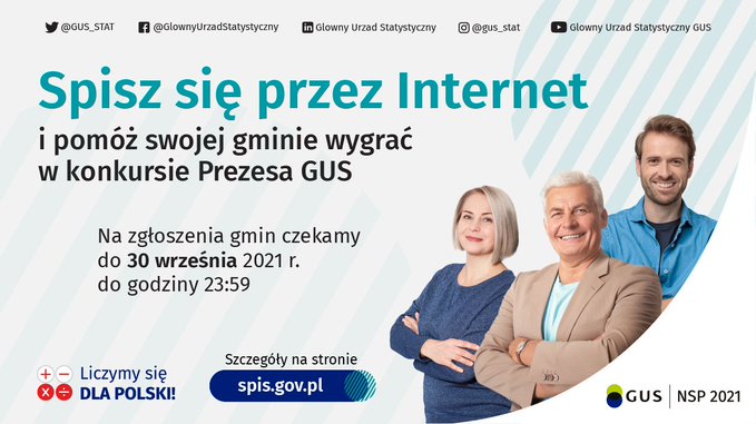 Konkurs trwa od 15 lipca do 30 września 2021 r. Wyłonienie zwycięskich gmin oraz ogłoszenie wyników nastąpi w terminie do 15 listopada 2021 r. Lista zwycięskich gmin zostanie opublikowana na stronie https://spis.gov.pl/ oraz w mediach społecznościowych GUS i podległych Prezesowi GUS jednostkach statystyki publicznej.