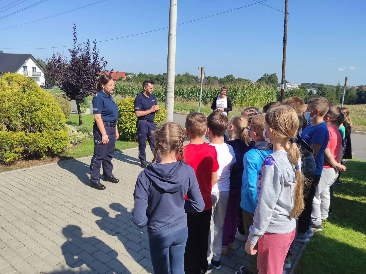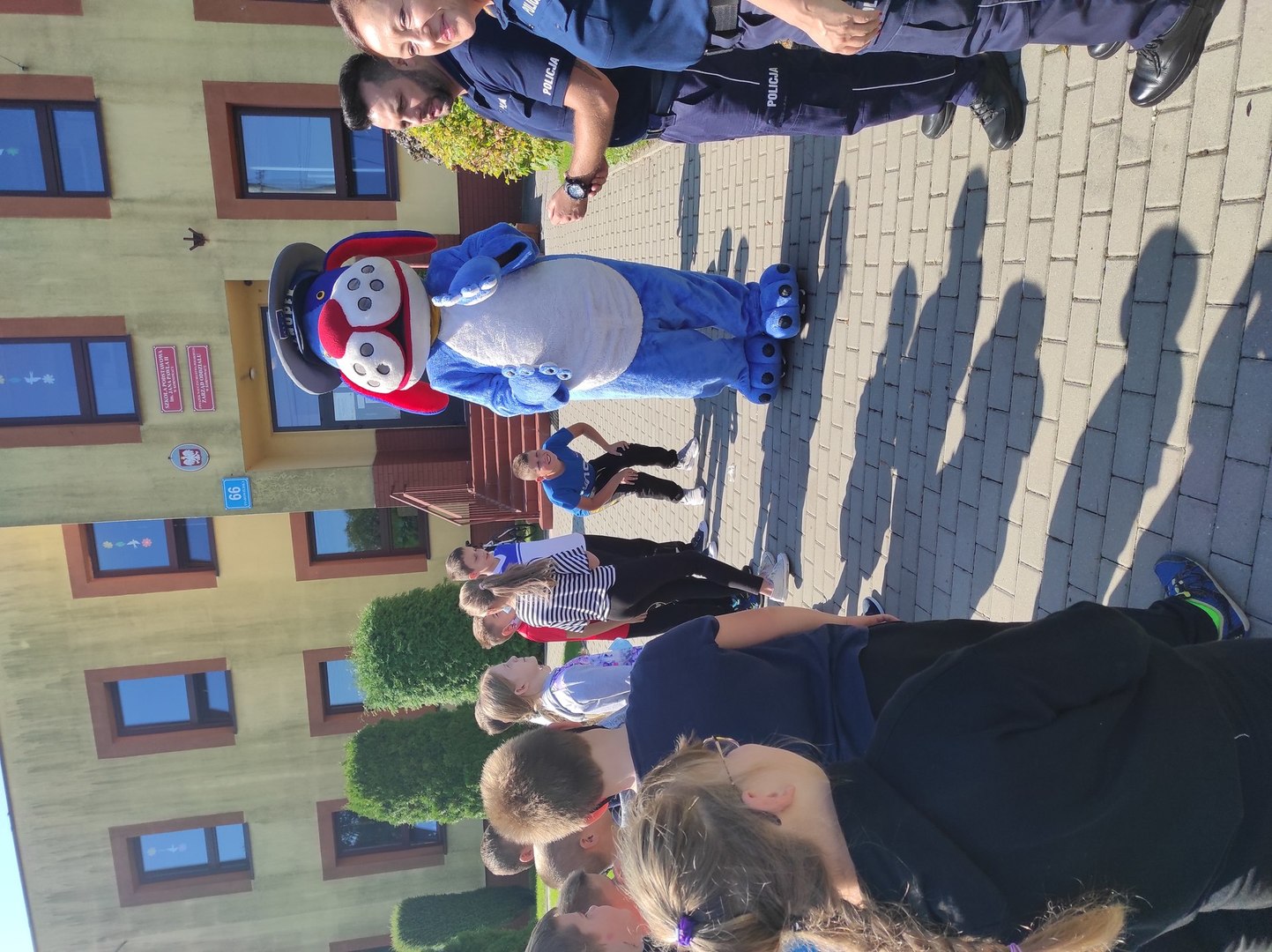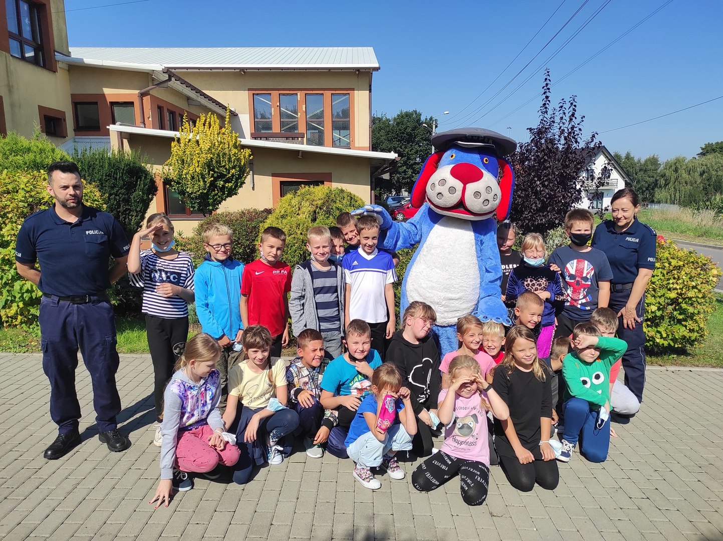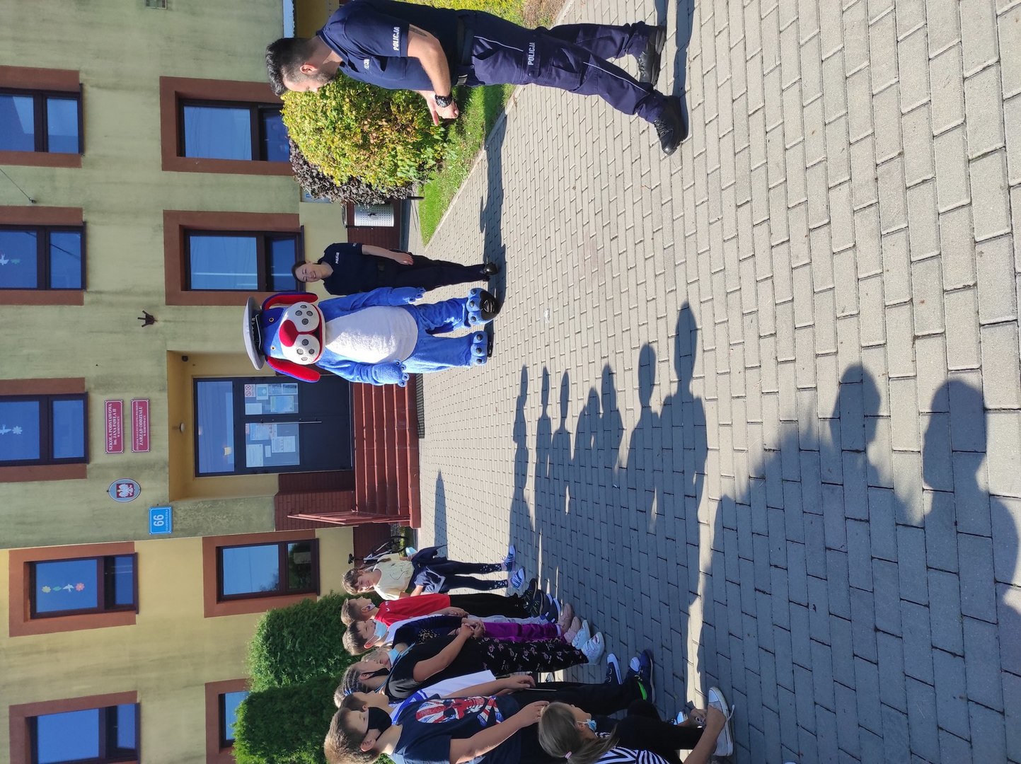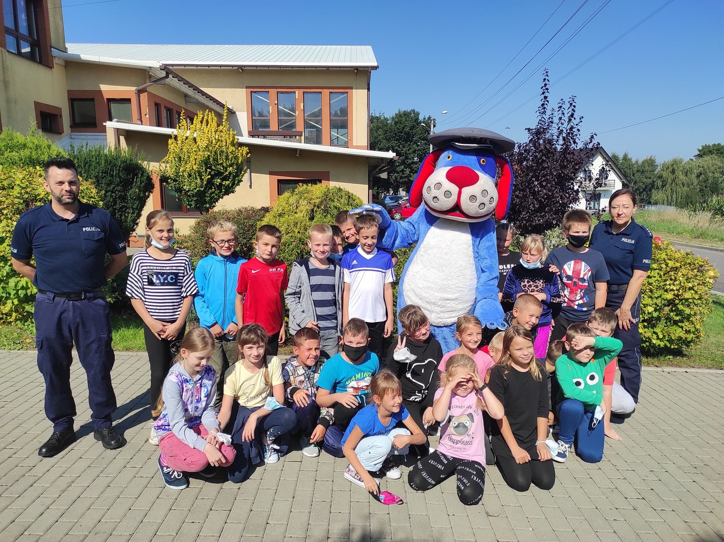 W naszej szkole duży nacisk kładziemy na bezpieczeństwo oraz edukację związaną z bezpieczeństwem dzieci. Na początku każdego roku szkolnego dzieci klas najmłodszych poznają drogę do szkoły wraz ze znakami drogowymi i zasadami, które uczą jak należy zachowywać się w pobliżu ulic. W ramach edukacji w tym kierunku, dzieci z klasy II oraz III spotkały się z policjantem w celu przypomnienia najważniejszych zasad ruchu drogowego podczas przechodzenia przez jezdnię. Policjanci przypomnieli również o korzyściach noszenia elementów odblaskowych przy ubraniu bądź tornistrze. Dzieci czynnie uczestniczyły w spotkaniu, dzieliły się swoimi spostrzeżeniami i doświadczeniami oraz zadawały dużo pytań. Jednak największą atrakcją okazała się maskotka śląskiej policji – Sznupek, który wraz z dziećmi ćwiczył prawidłowe przechodzenie przez jezdnię na której nie ma pasów. Spotkanie z uczniami szkoły podstawowej było również doskonałą okazją do zaprezentowania zawodu policjanta. Zajęcia bardzo spodobały się dzieciom co zostało uwiecznione na pamiątkowym zdjęciu.