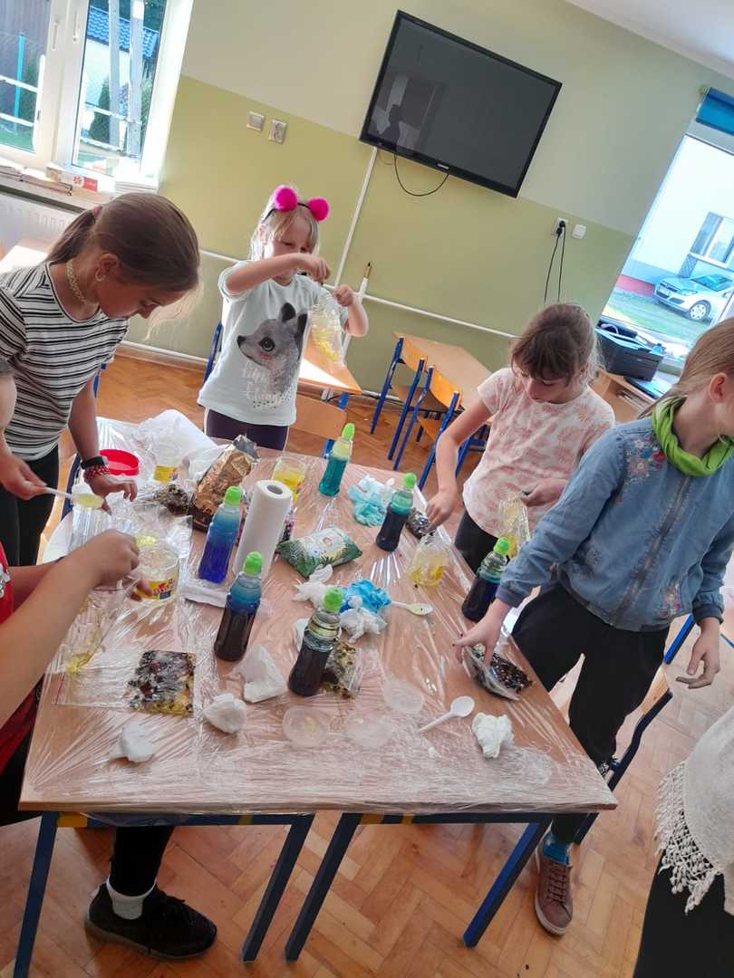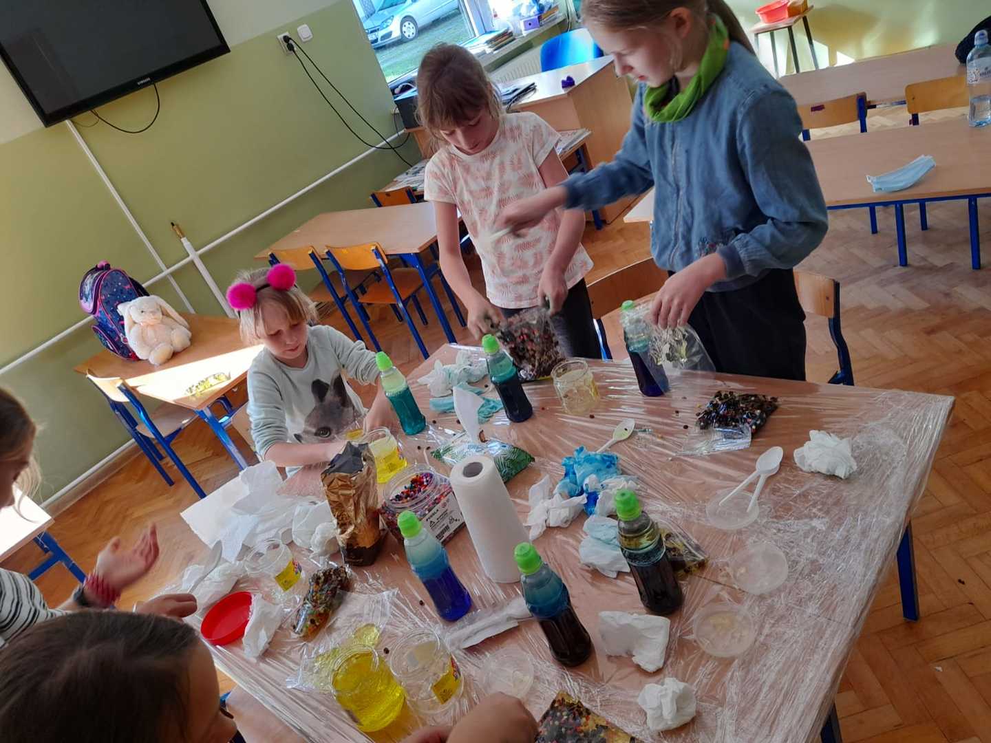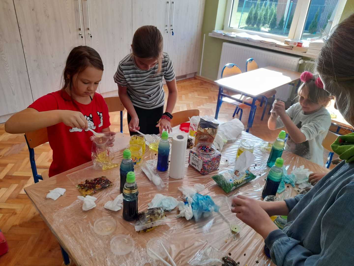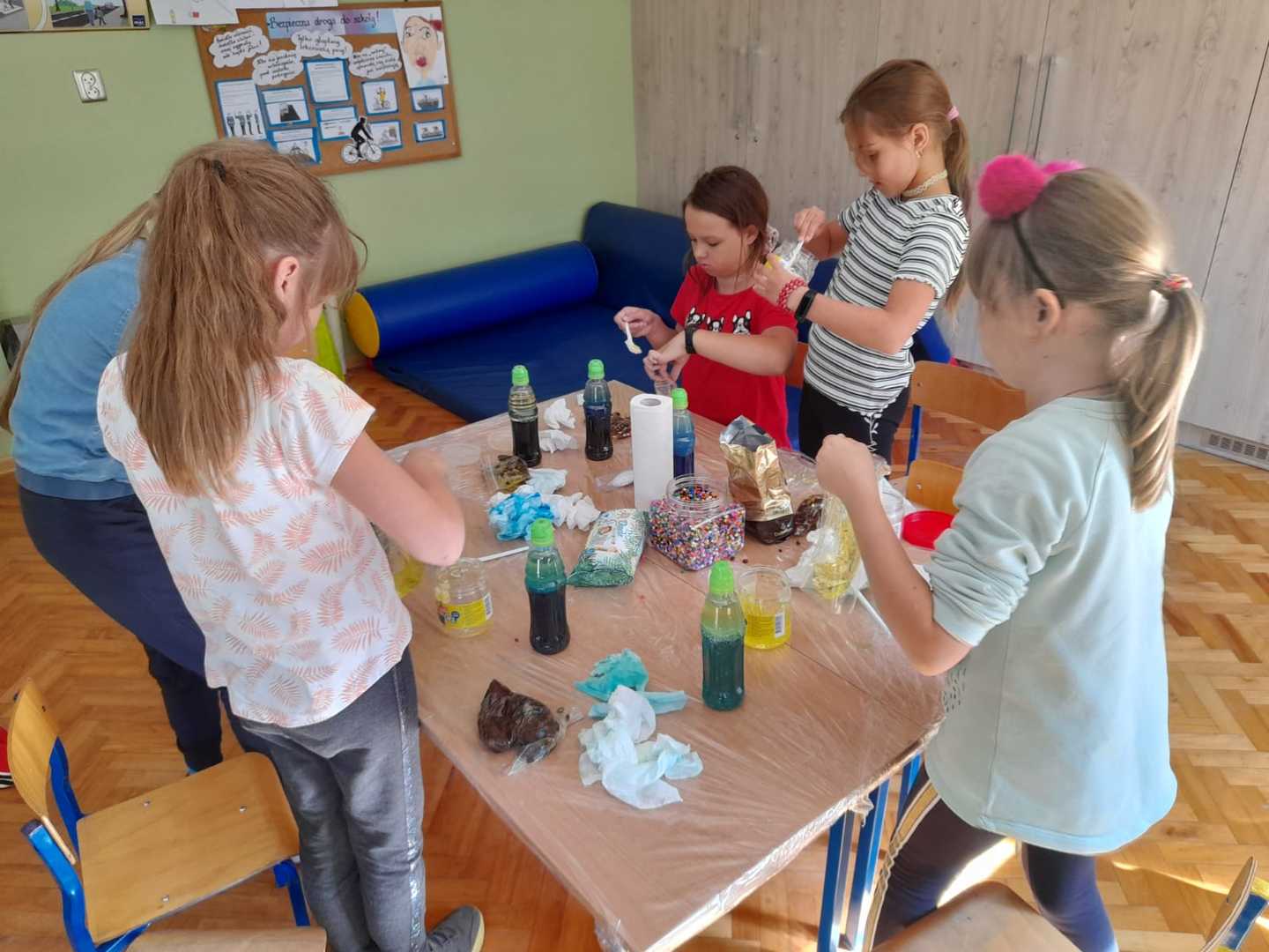 Na pierwszych zajęciach dzieci miały możliwość samodzielnie stworzyć woreczki sensoryczne oraz dokonały eksperymentu i udowodniły, że olej nie miesza się z wodą. Każde kolejne spotkanie to będzie dla nas nowe wyzwanie.