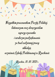Uczniowie klasy szóstej Szkoły przyłączyli się do obchodów Dnia Poczty Polskiej. Podczas zajęć kreatywnych przygotowali laurkę z życzeniami dla wszystkich pracowników poczty. Następnie nasi trzecioklasiści wraz z opiekunem Samorządu Uczniowskiego wybrali się do placówki Poczty Polskiej w Kornowacu, aby złożyć najserdeczniejsze podziękowania za trud włożony w wykonywanie tak trudnej i odpowiedzialnej pracy.