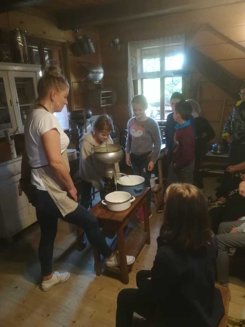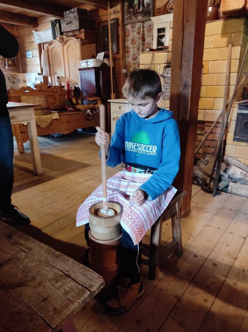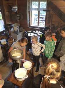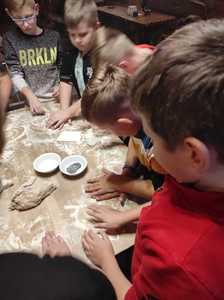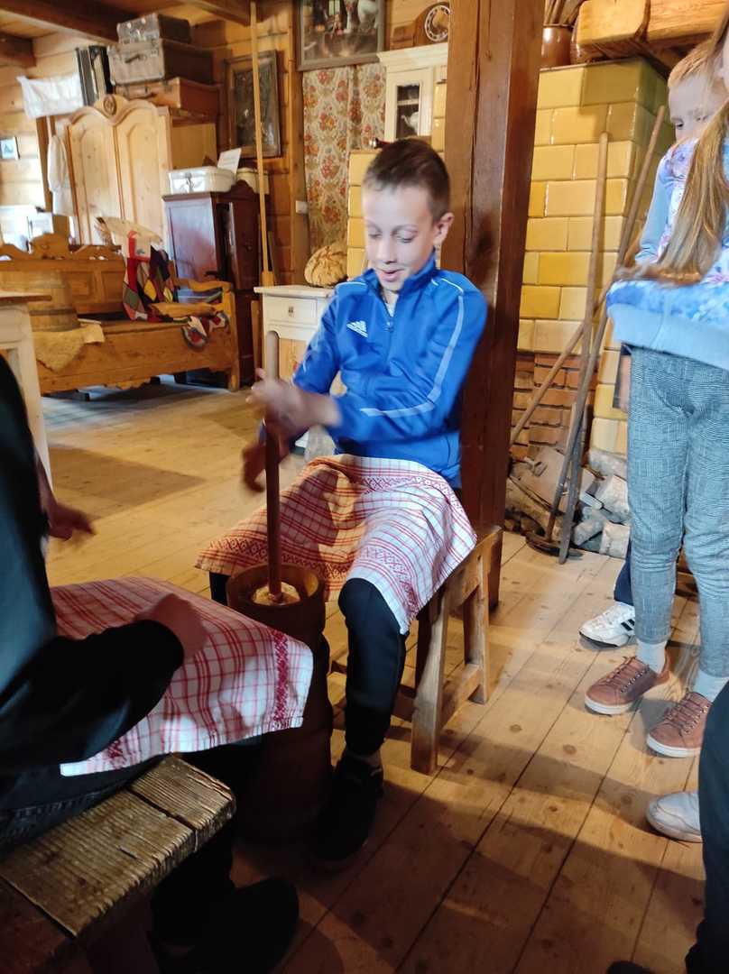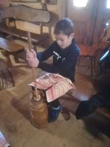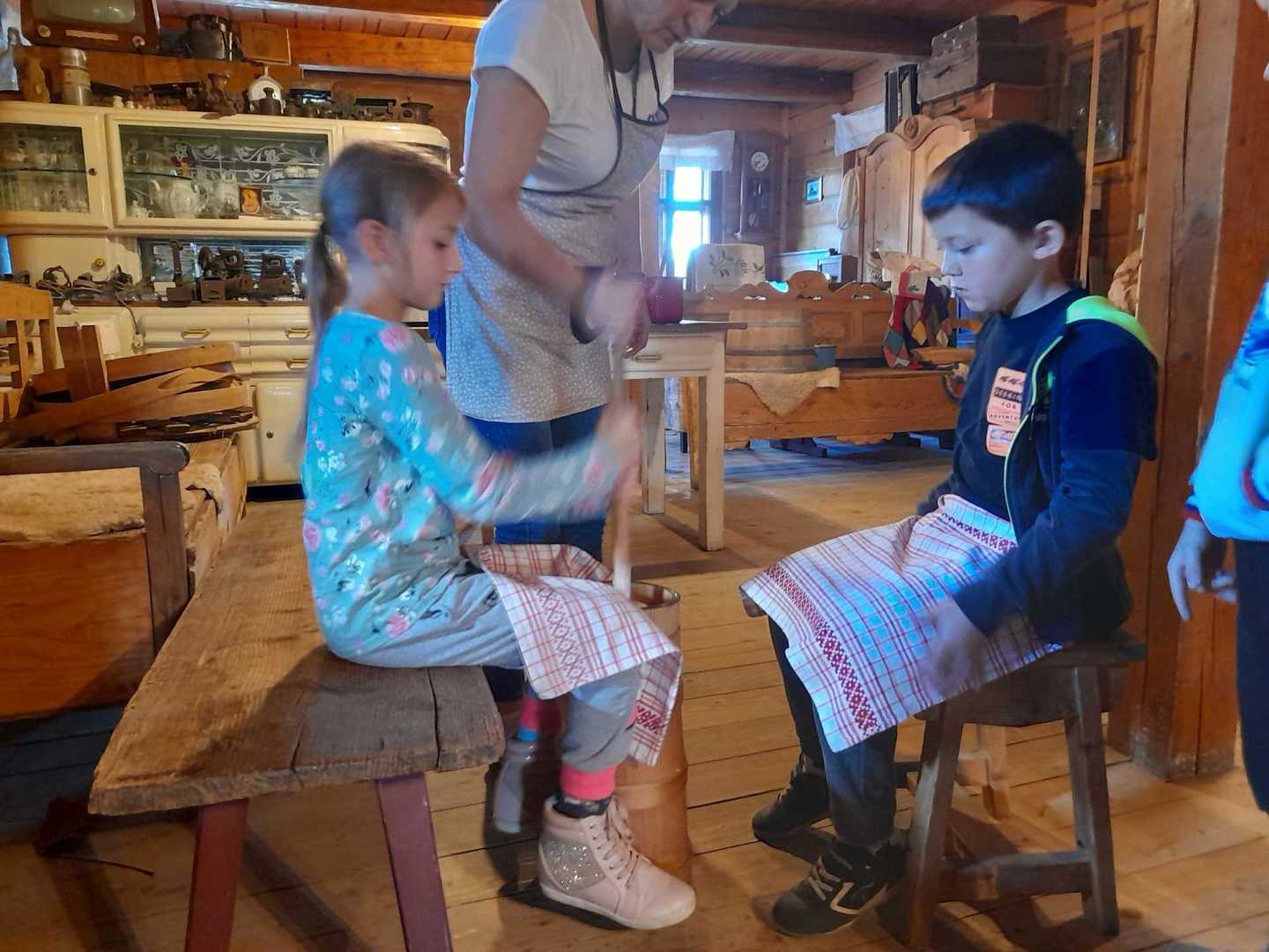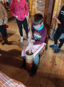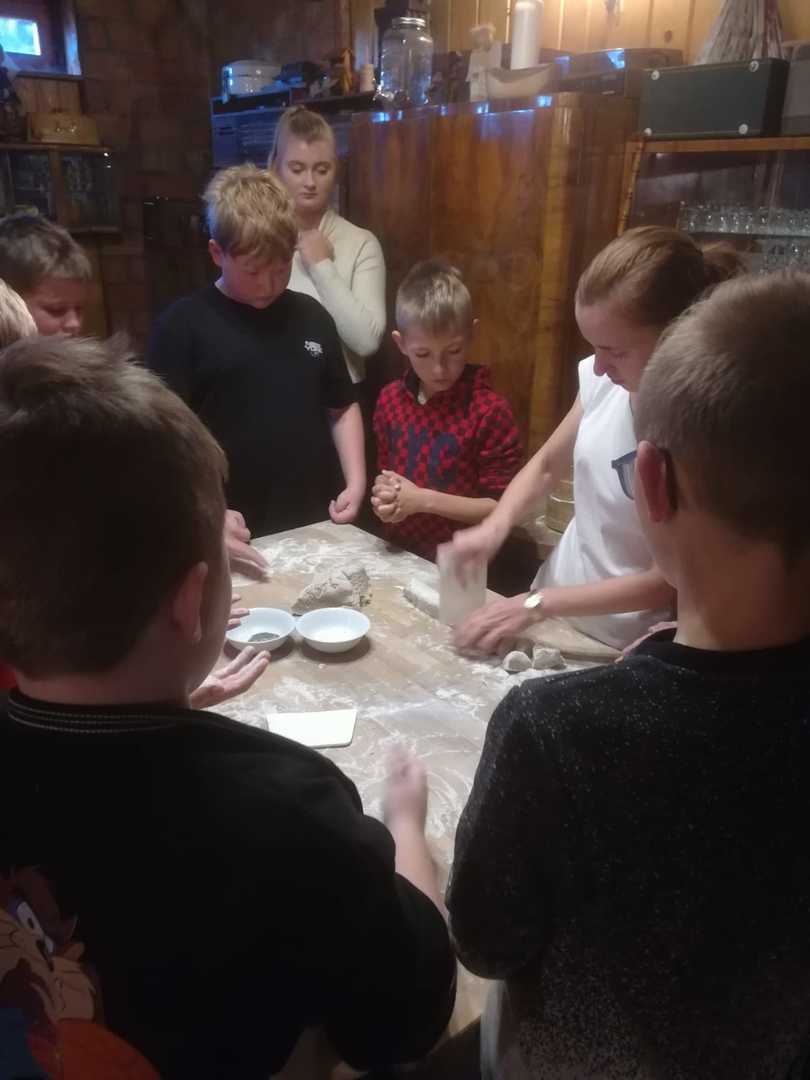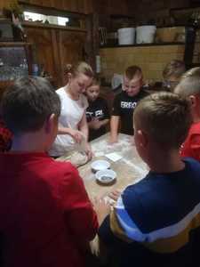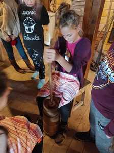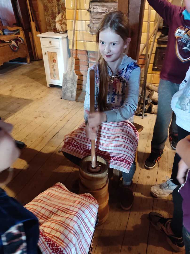Drugim etapem naszej wycieczki było poznanie etapów wytwarzania chleba „Od ziarenka do bochenka”, poznaliśmy życie pszczół, pracę pszczelarza, pasiekę, budowę ula. Braliśmy udział w warsztatach podczas, których oddzielaliśmy mleko i śmietanę, a następnie ubijaliśmy masło. Potem przeszliśmy do piekarni, gdzie ugniataliśmy ciasto na podpłomyki. Po upieczeniu kosztowaliśmy świeże masło, miód, smalec i chleb. Ważnym elementem każdego etapu było podkreślenie, że nie wolno marnować jedzenia i należy je szanować.