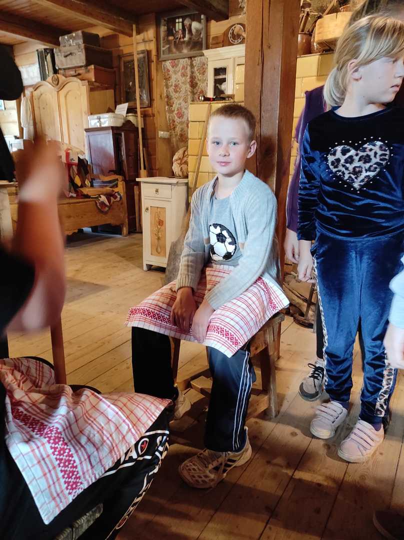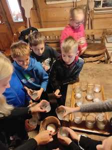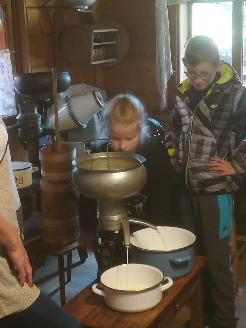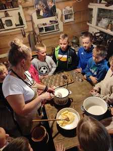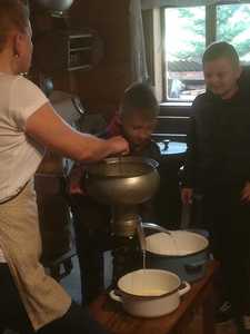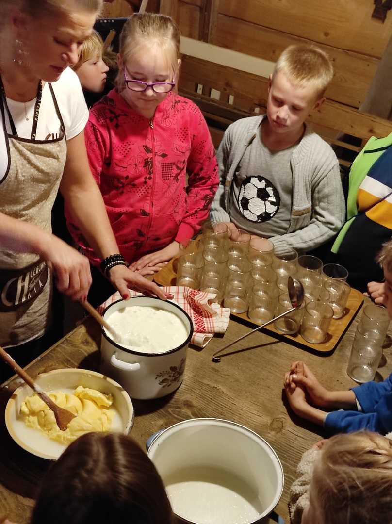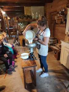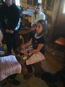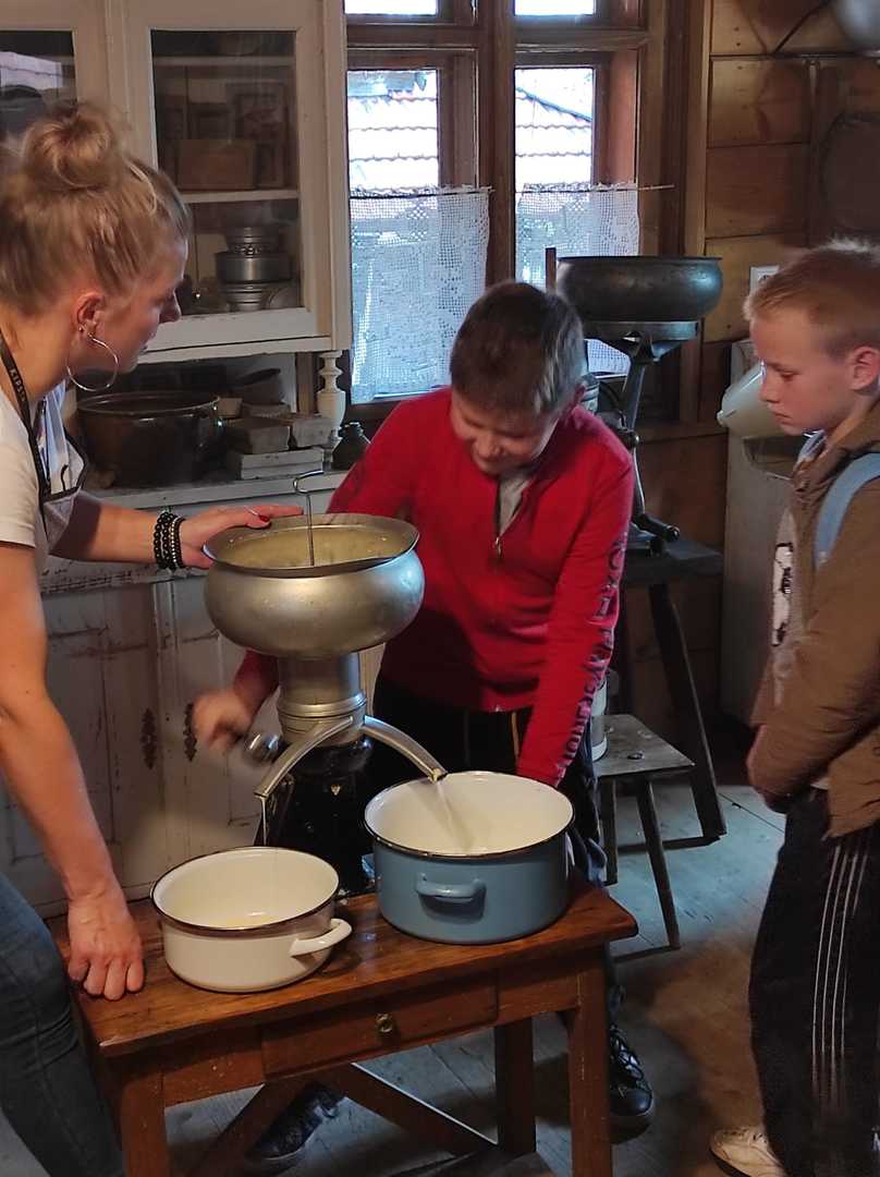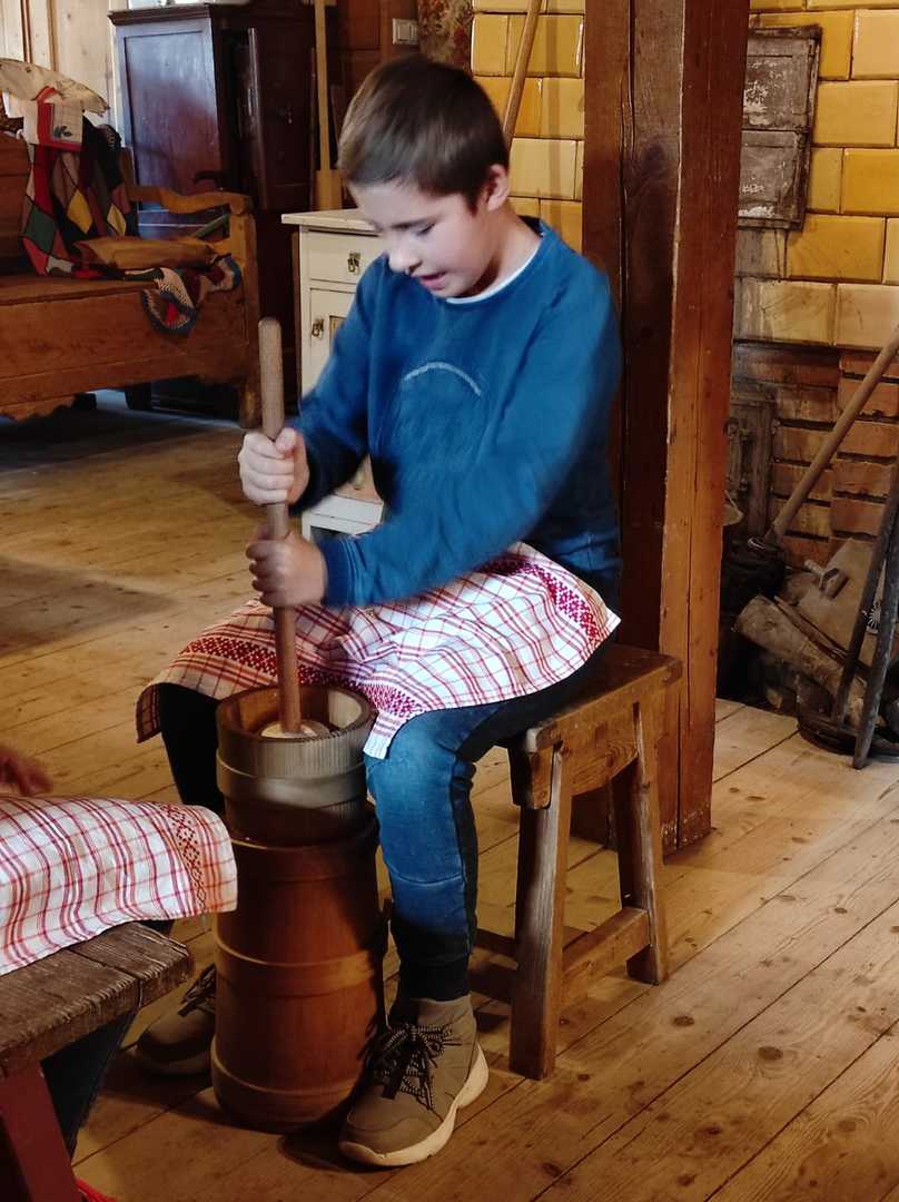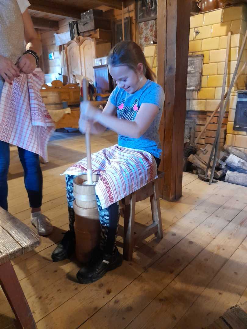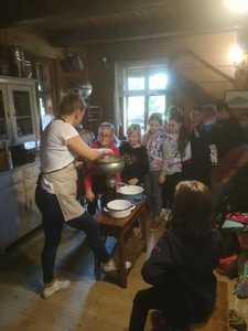 Drugim etapem naszej wycieczki było poznanie etapów wytwarzania chleba „Od ziarenka do bochenka”, poznaliśmy życie pszczół, pracę pszczelarza, pasiekę, budowę ula. Braliśmy udział w warsztatach podczas, których oddzielaliśmy mleko i śmietanę, a następnie ubijaliśmy masło. Potem przeszliśmy do piekarni, gdzie ugniataliśmy ciasto na podpłomyki. Po upieczeniu kosztowaliśmy świeże masło, miód, smalec i chleb. Ważnym elementem każdego etapu było podkreślenie, że nie wolno marnować jedzenia i należy je szanować.