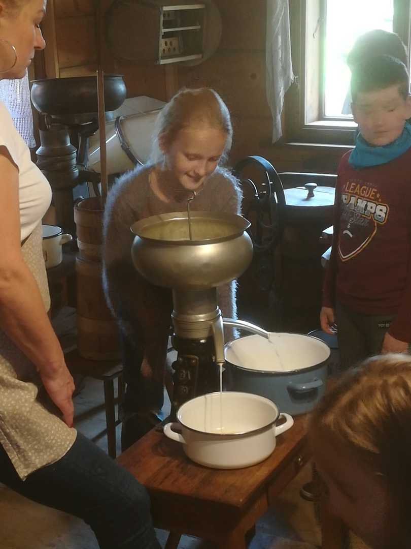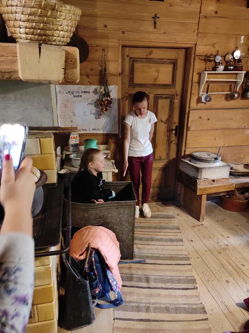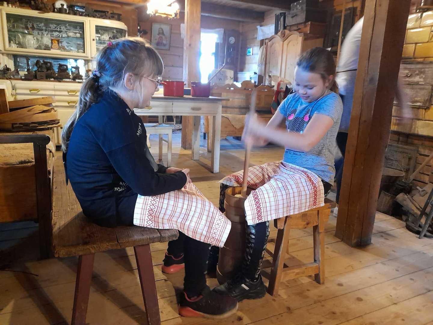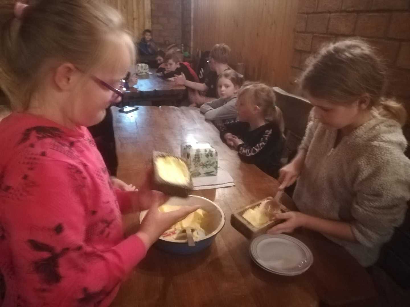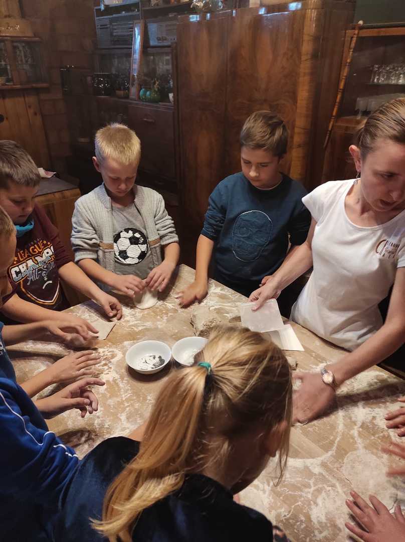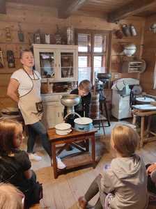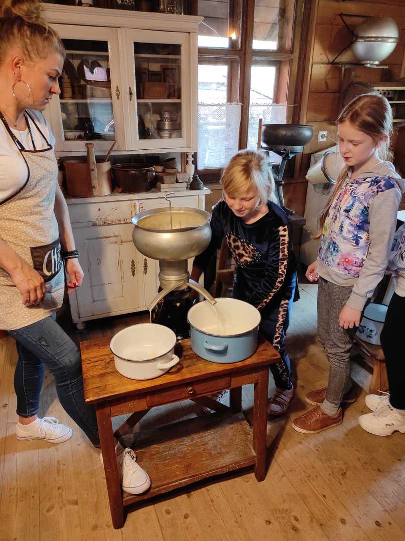 Drugim etapem naszej wycieczki było poznanie etapów wytwarzania chleba „Od ziarenka do bochenka”, poznaliśmy życie pszczół, pracę pszczelarza, pasiekę, budowę ula. Braliśmy udział w warsztatach podczas, których oddzielaliśmy mleko i śmietanę, a następnie ubijaliśmy masło. Potem przeszliśmy do piekarni, gdzie ugniataliśmy ciasto na podpłomyki. Po upieczeniu kosztowaliśmy świeże masło, miód, smalec i chleb. Ważnym elementem każdego etapu było podkreślenie, że nie wolno marnować jedzenia i należy je szanować.