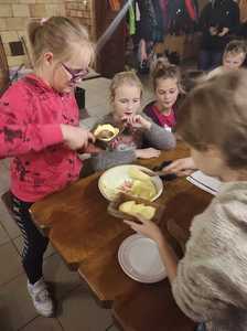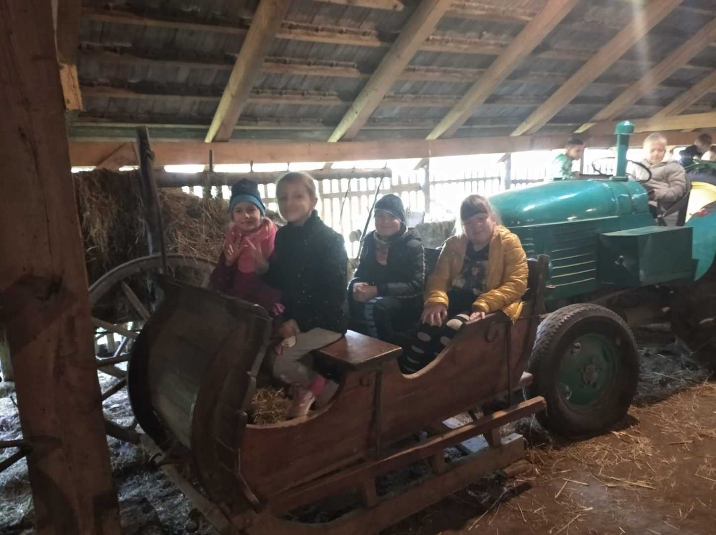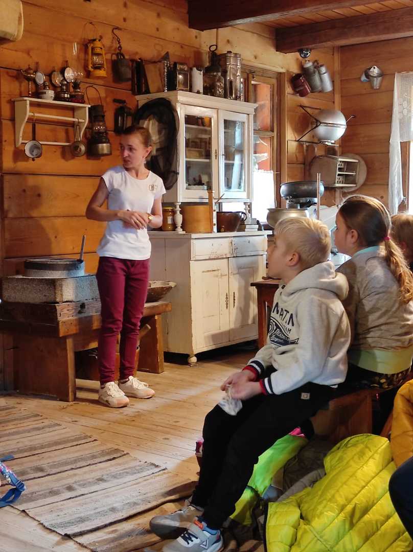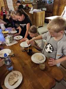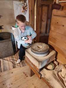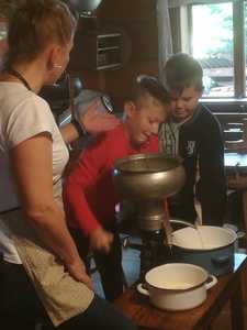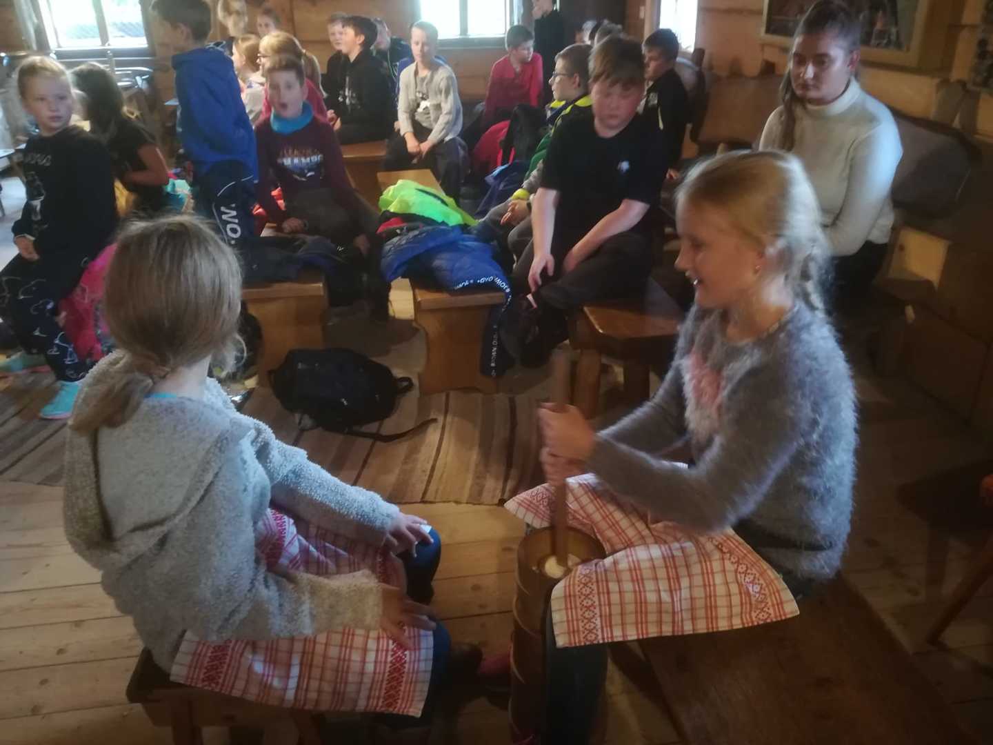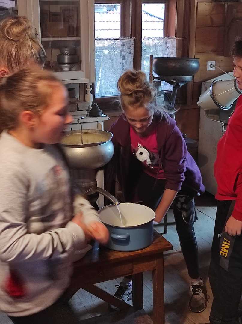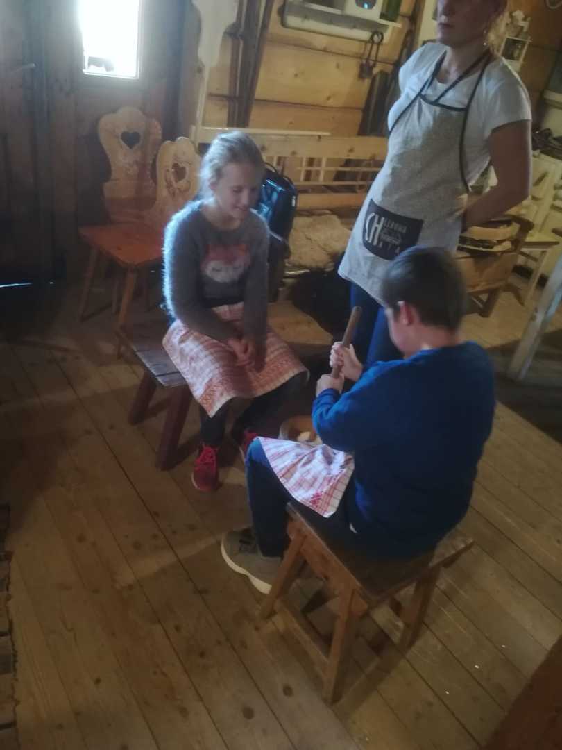Drugim etapem naszej wycieczki było poznanie etapów wytwarzania chleba „Od ziarenka do bochenka”, poznaliśmy życie pszczół, pracę pszczelarza, pasiekę, budowę ula. Braliśmy udział w warsztatach podczas, których oddzielaliśmy mleko i śmietanę, a następnie ubijaliśmy masło. Potem przeszliśmy do piekarni, gdzie ugniataliśmy ciasto na podpłomyki. Po upieczeniu kosztowaliśmy świeże masło, miód, smalec i chleb. Ważnym elementem każdego etapu było podkreślenie, że nie wolno marnować jedzenia i należy je szanować.