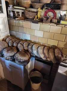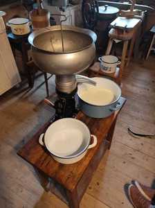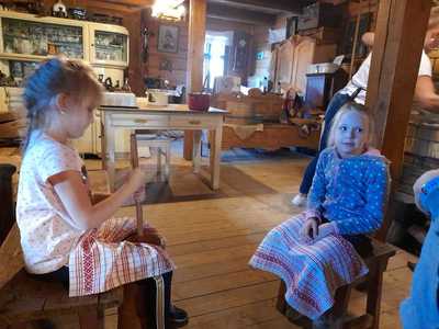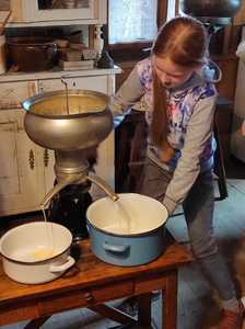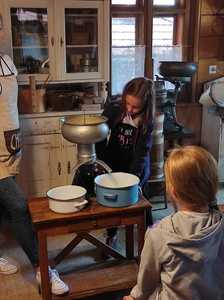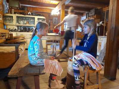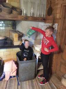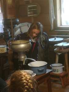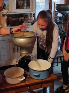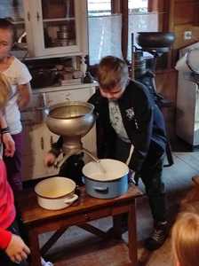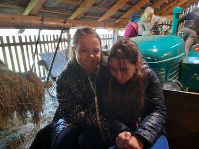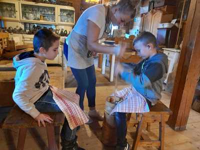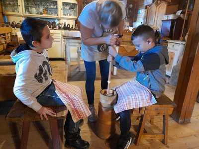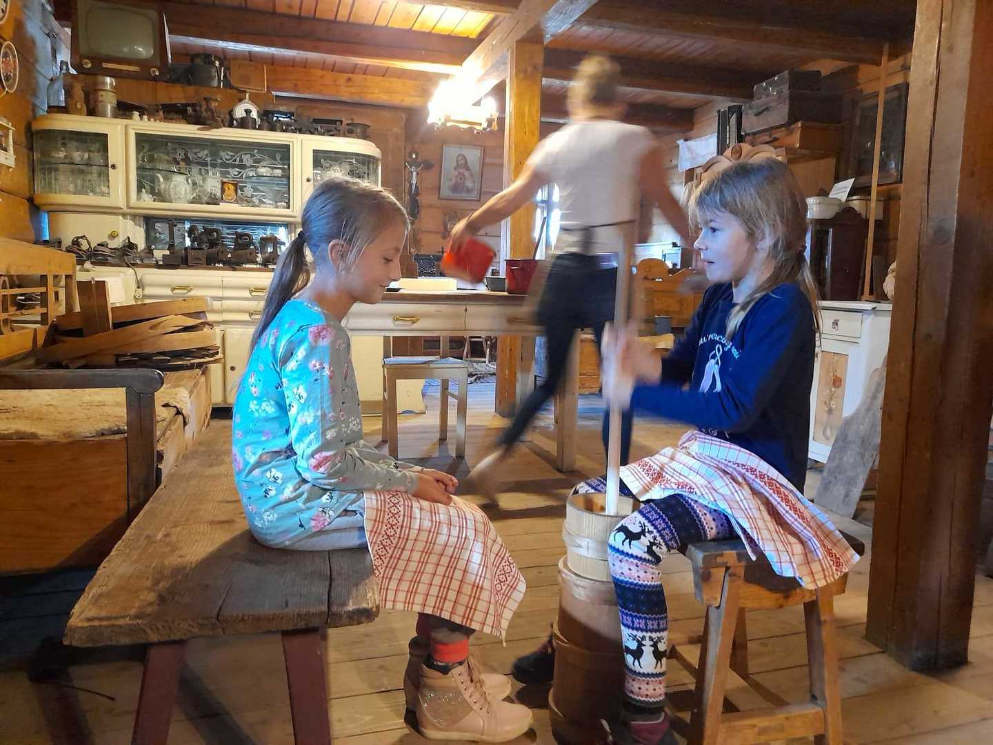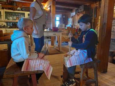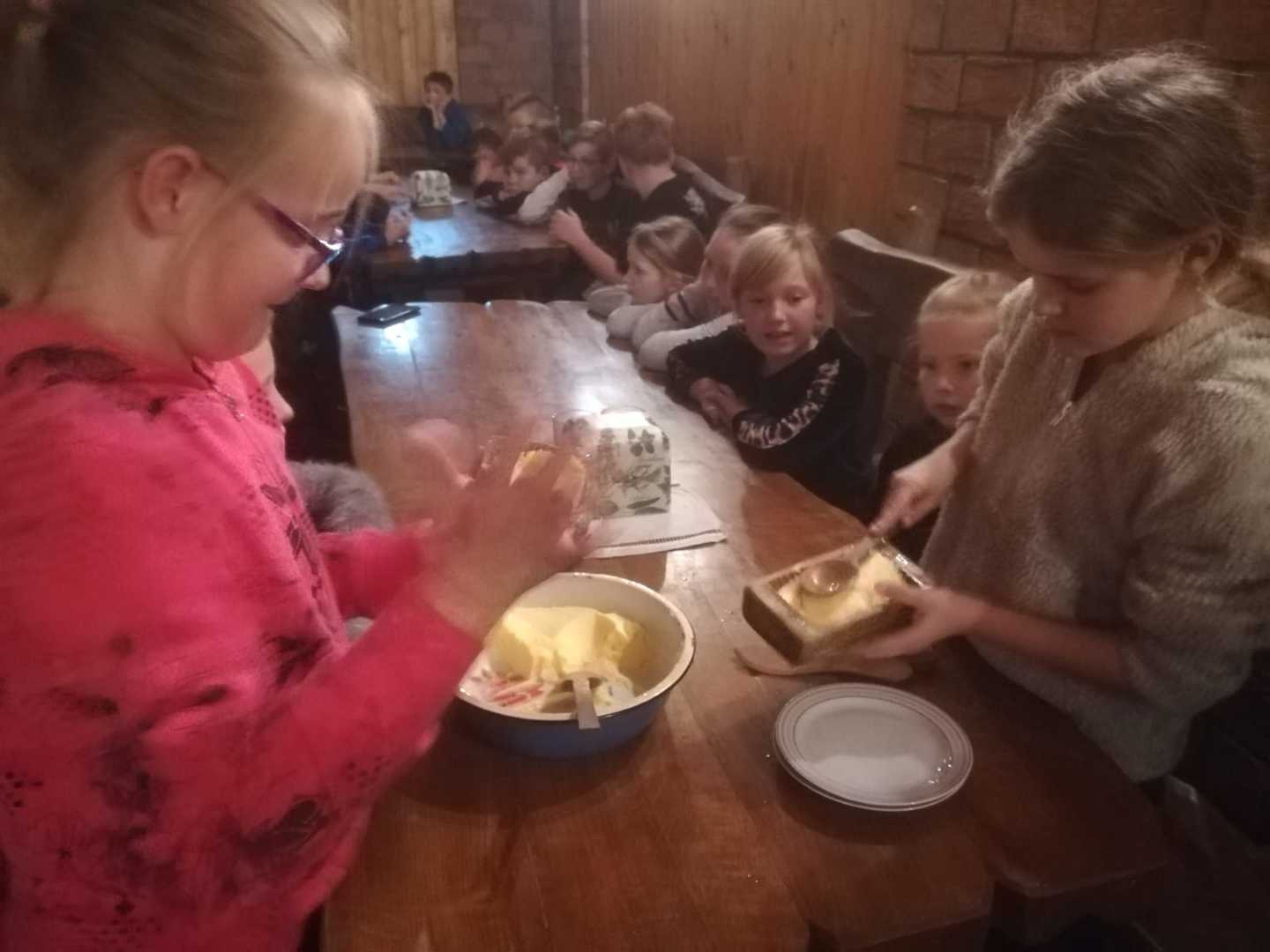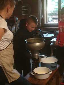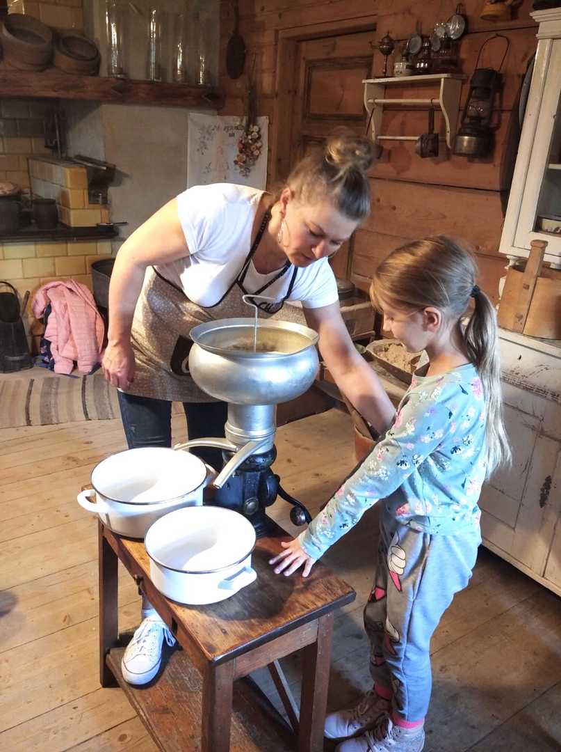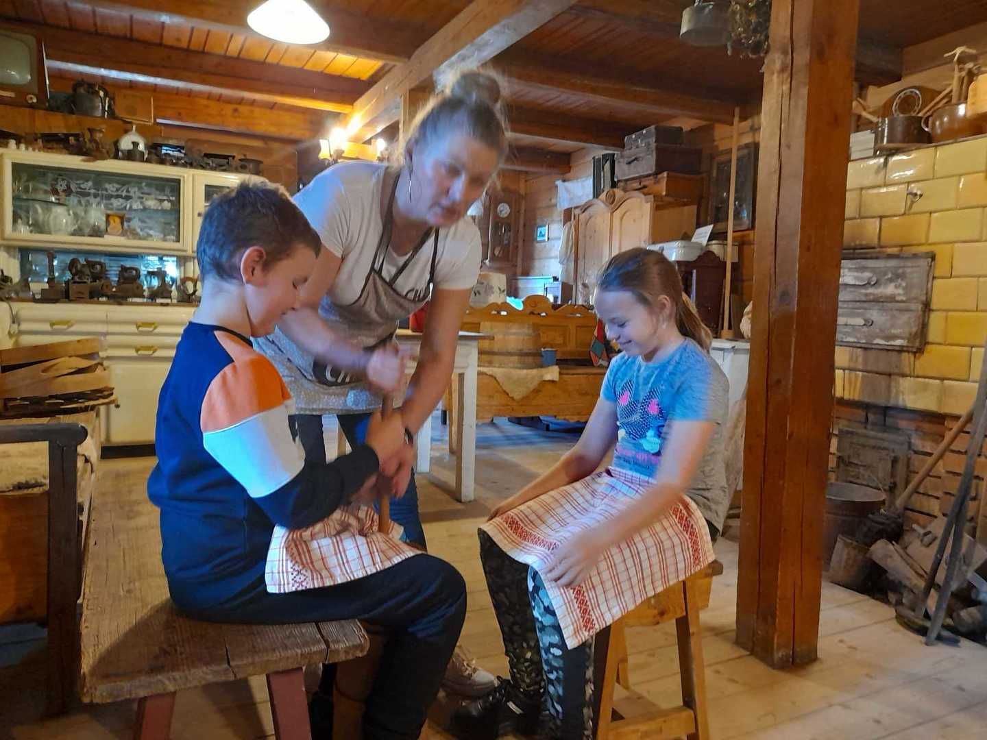 Drugim etapem naszej wycieczki było poznanie etapów wytwarzania chleba „Od ziarenka do bochenka”, poznaliśmy życie pszczół, pracę pszczelarza, pasiekę, budowę ula. Braliśmy udział w warsztatach podczas, których oddzielaliśmy mleko i śmietanę, a następnie ubijaliśmy masło. Potem przeszliśmy do piekarni, gdzie ugniataliśmy ciasto na podpłomyki. Po upieczeniu kosztowaliśmy świeże masło, miód, smalec i chleb. Ważnym elementem każdego etapu było podkreślenie, że nie wolno marnować jedzenia i należy je szanować.