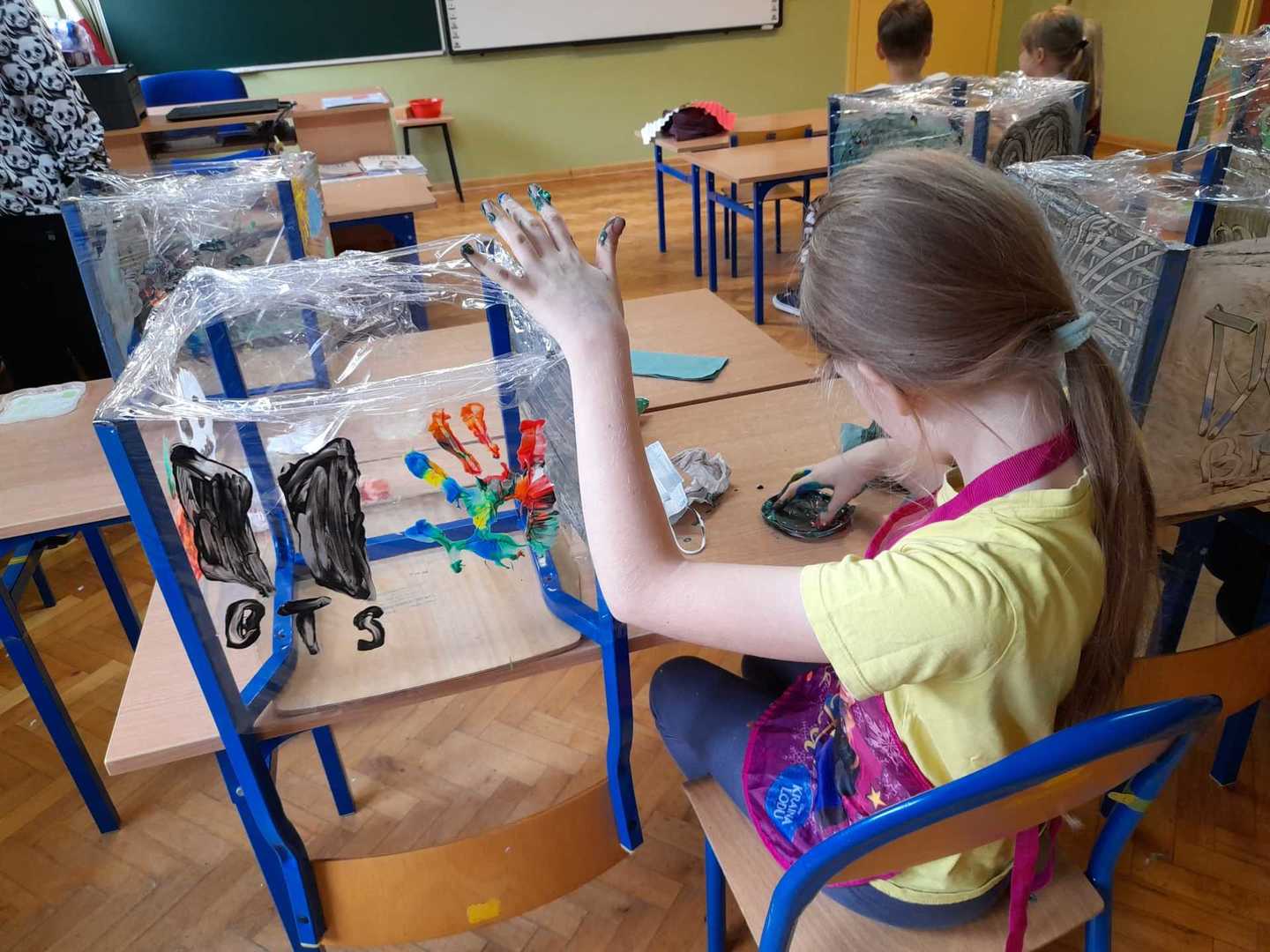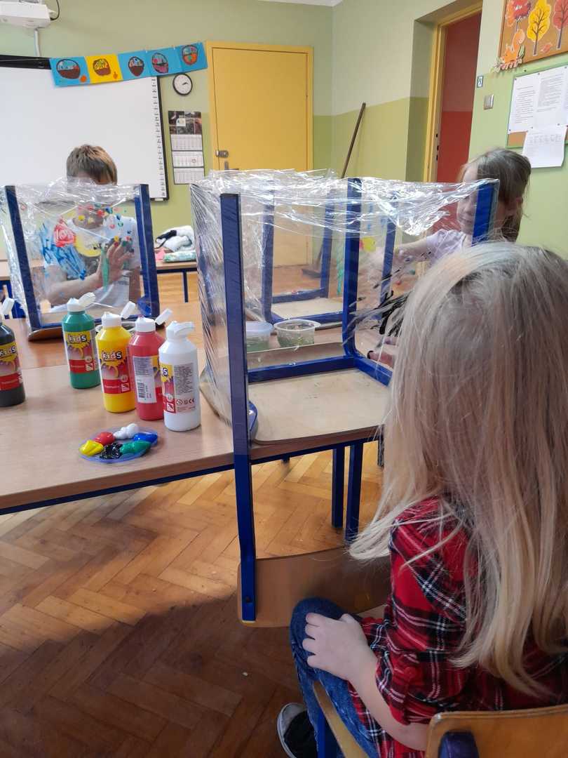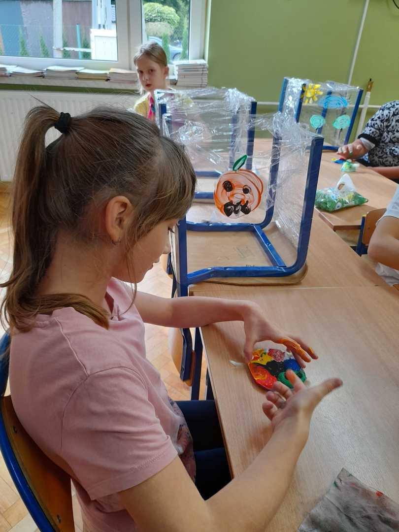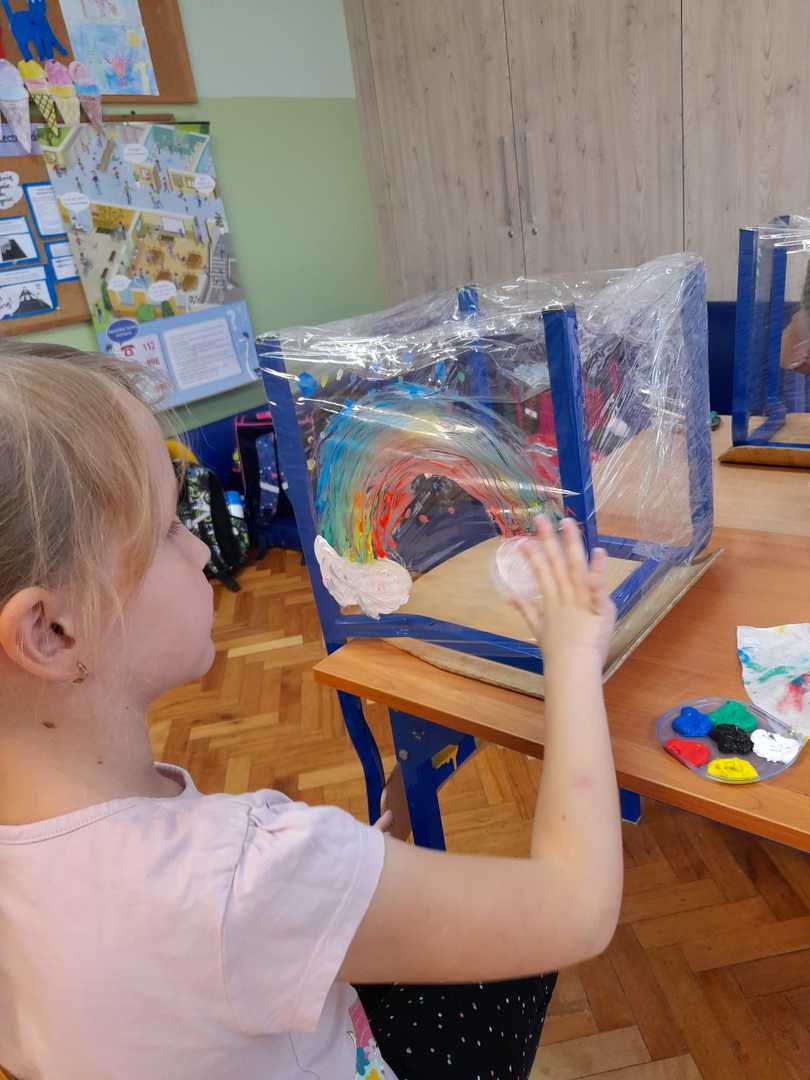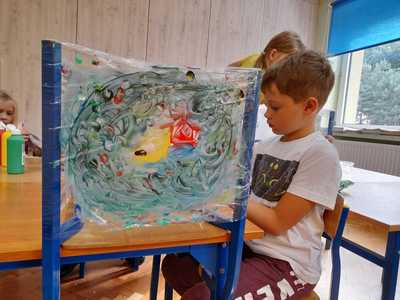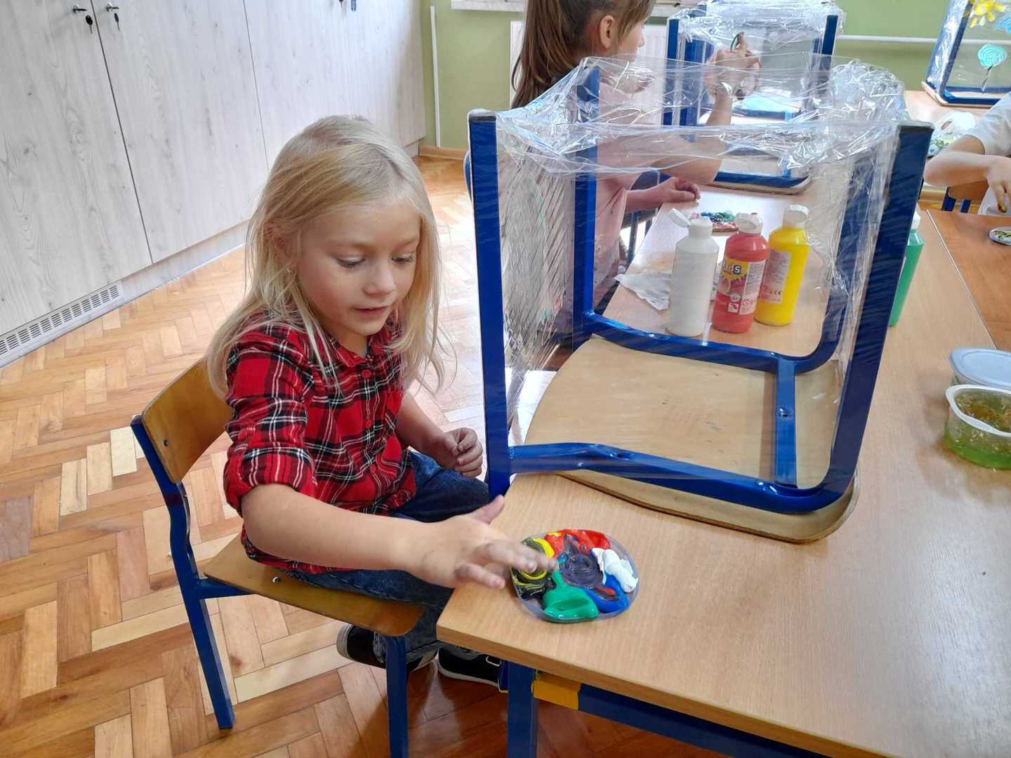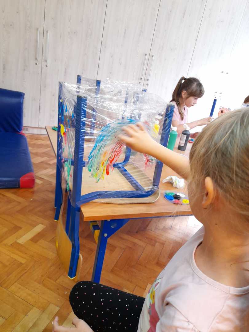 Czy jeść można jedynie przy pomocy sztućców? Otóż nie! Na ostatnich zajęciach sensorycznych dzieciaki zajadały się galaretką w najbardziej naturalny sposób – przy pomocy palców i całych dłoni. W ten sposób pobudzaliśmy wszystkie receptory, które mamy na dłoniach. Kolejnym naszym zadaniem było namalowanie obrazów bez użycia pędzli. Malowaliśmy na folii, a naszymi „sztalugami” były nogi krzeseł. Dzieci wykazały się ogromną pomysłowością – było akwarium, tęcza, drzewa, ale również wiele abstrakcyjnych obrazów. Najwięcej frajdy sprawiło nam malowanie całymi dłoniami!