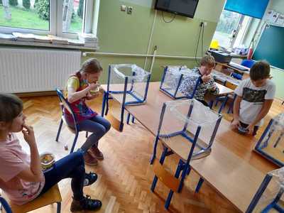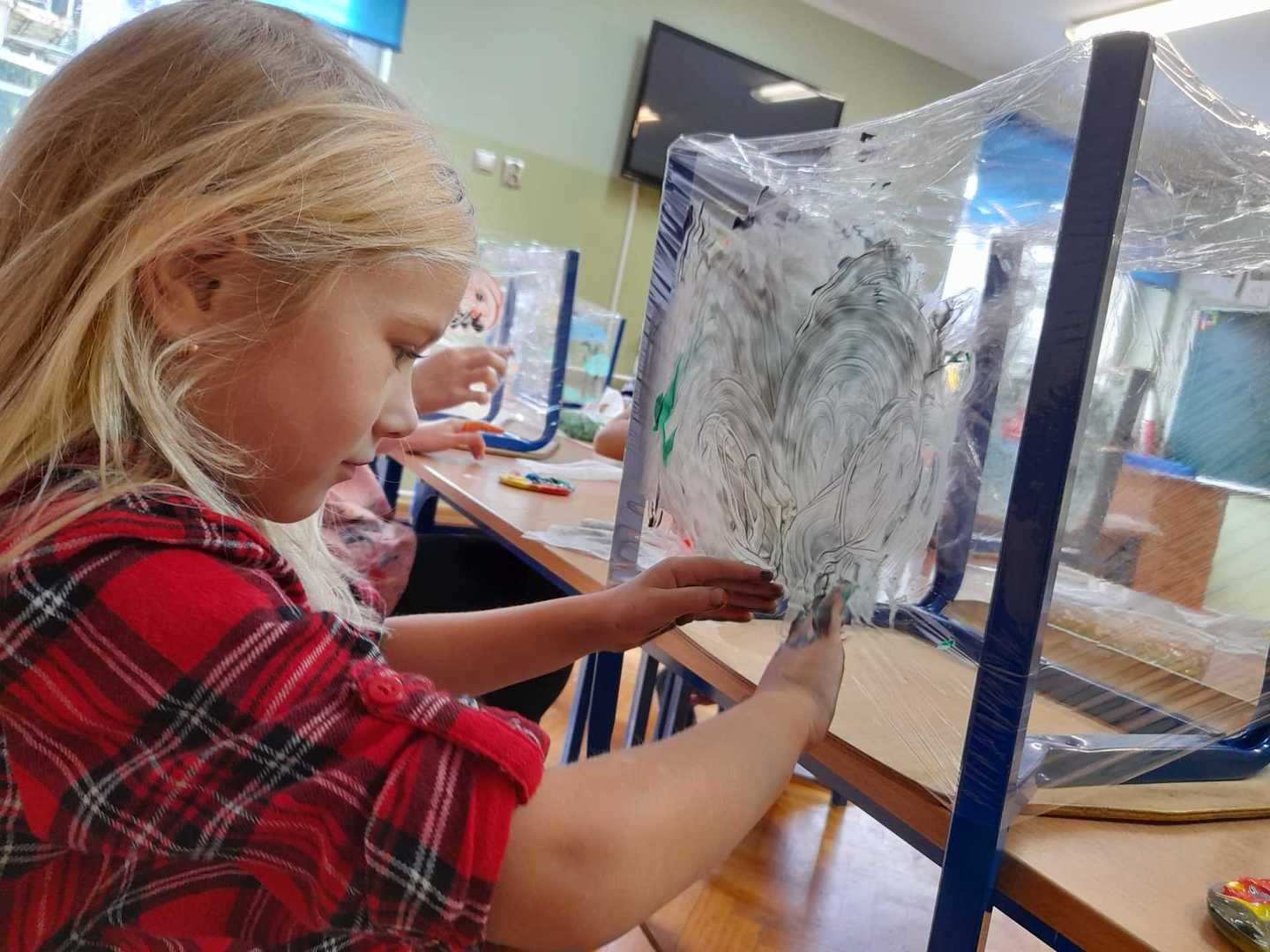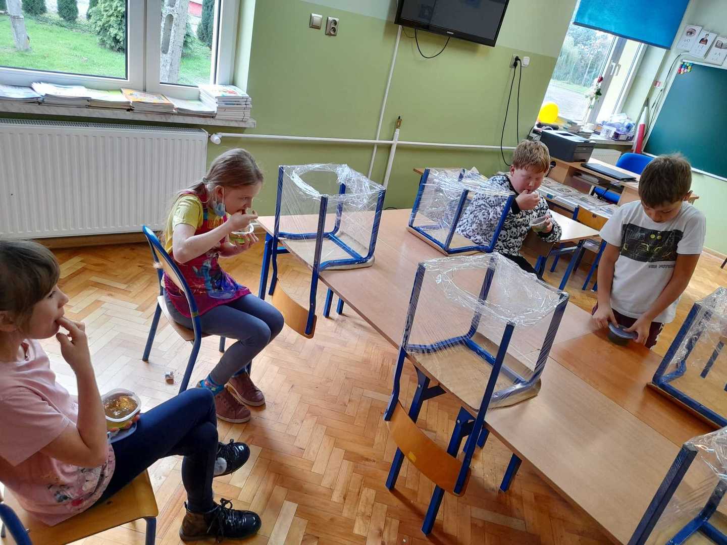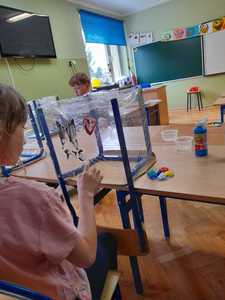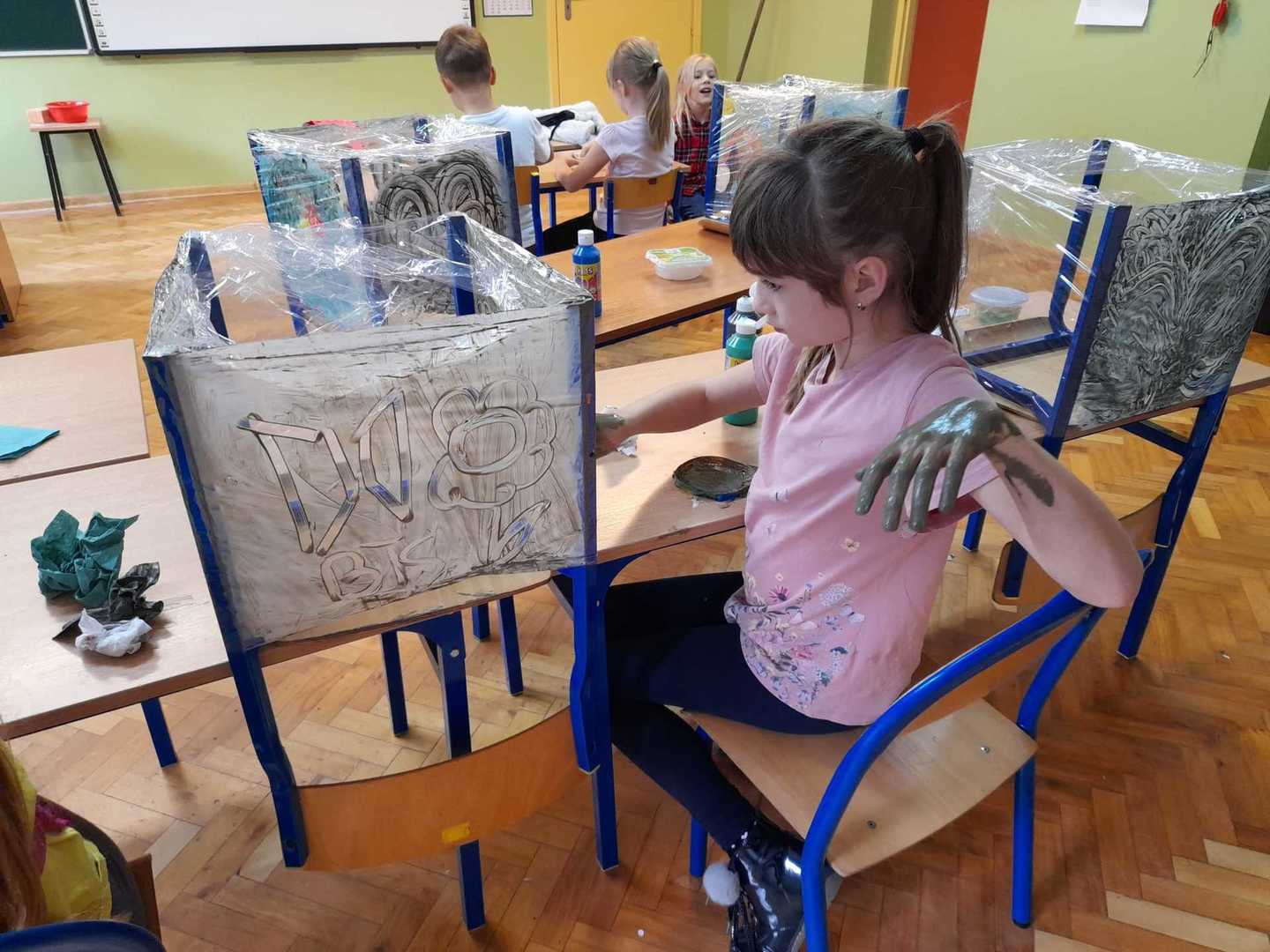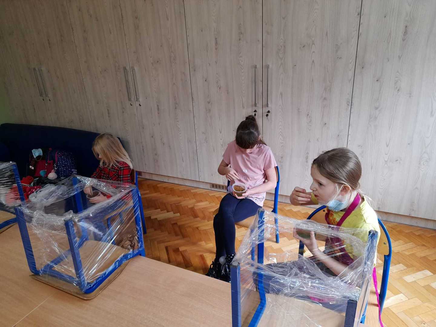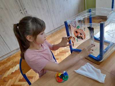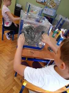 Czy jeść można jedynie przy pomocy sztućców? Otóż nie! Na ostatnich zajęciach sensorycznych dzieciaki zajadały się galaretką w najbardziej naturalny sposób – przy pomocy palców i całych dłoni. W ten sposób pobudzaliśmy wszystkie receptory, które mamy na dłoniach. Kolejnym naszym zadaniem było namalowanie obrazów bez użycia pędzli. Malowaliśmy na folii, a naszymi „sztalugami” były nogi krzeseł. Dzieci wykazały się ogromną pomysłowością – było akwarium, tęcza, drzewa, ale również wiele abstrakcyjnych obrazów. Najwięcej frajdy sprawiło nam malowanie całymi dłoniami!