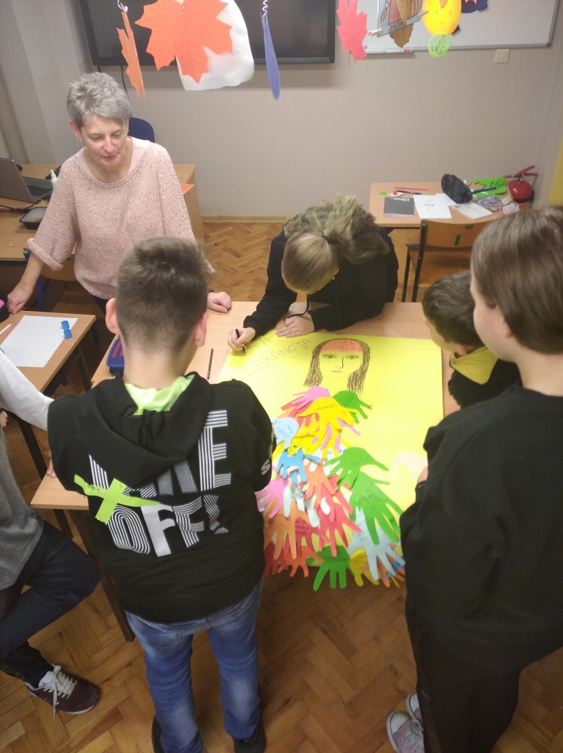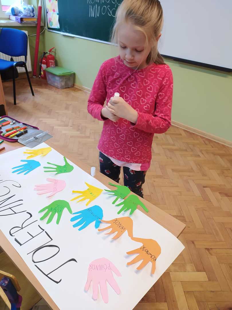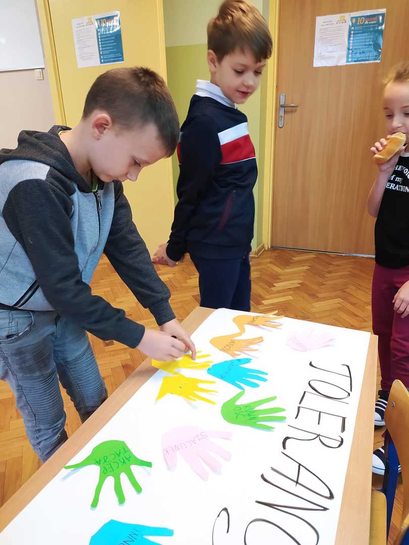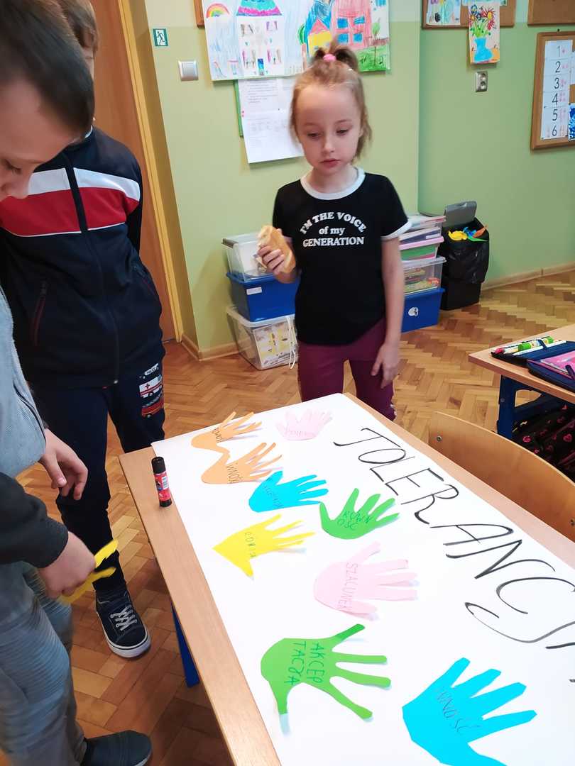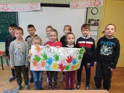 16 listopada obchodziliśmy Międzynarodowy Dzień Tolerancji, nasi uczniowie dowiedzieli się czym jest tolerancja i akceptacja. Zaprezentowany film pt. „Urodziny Maćka" pozwolił im zrozumieć tematykę i rozróżnić zachowania tolerancyjne od nietolerancyjnych. Wspólnie z uczniami wykonano „Panią Tolerancję”, której sukienka składała się z wyciętych dłoni uczniów, na których zapisano wszystkie skojarzenia ze słowem tolerancja, między innymi: pomoc, szacunek, życzliwość, zrozumienie, przyjaźń, radość, uśmiech, miłość, prawdomówność. Uczniowie mieli również do wykonania krzyżówkę, puzzle odsłaniające ukryty obrazek dotyczący zasad prawidłowych relacji między ludźmi, oraz słowną wykreślankę. Klasa pierwsza natomiast, wykonała wspaniały kolorowy plakat.