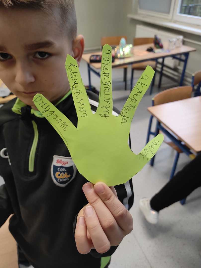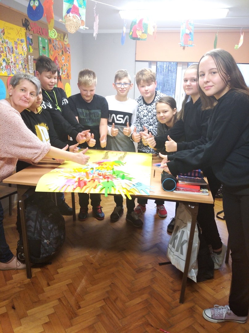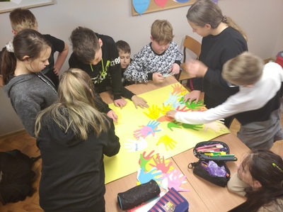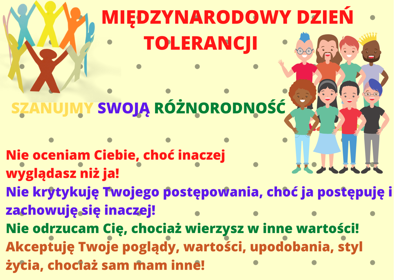 16 listopada obchodziliśmy Międzynarodowy Dzień Tolerancji, nasi uczniowie dowiedzieli się czym jest tolerancja i akceptacja. Zaprezentowany film pt. „Urodziny Maćka" pozwolił im zrozumieć tematykę i rozróżnić zachowania tolerancyjne od nietolerancyjnych. Wspólnie z uczniami wykonano „Panią Tolerancję”, której sukienka składała się z wyciętych dłoni uczniów, na których zapisano wszystkie skojarzenia ze słowem tolerancja, między innymi: pomoc, szacunek, życzliwość, zrozumienie, przyjaźń, radość, uśmiech, miłość, prawdomówność. Uczniowie mieli również do wykonania krzyżówkę, puzzle odsłaniające ukryty obrazek dotyczący zasad prawidłowych relacji między ludźmi, oraz słowną wykreślankę. Klasa pierwsza natomiast, wykonała wspaniały kolorowy plakat.