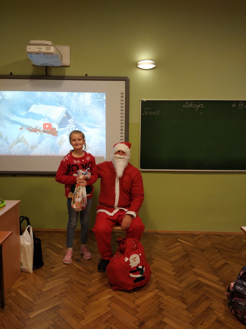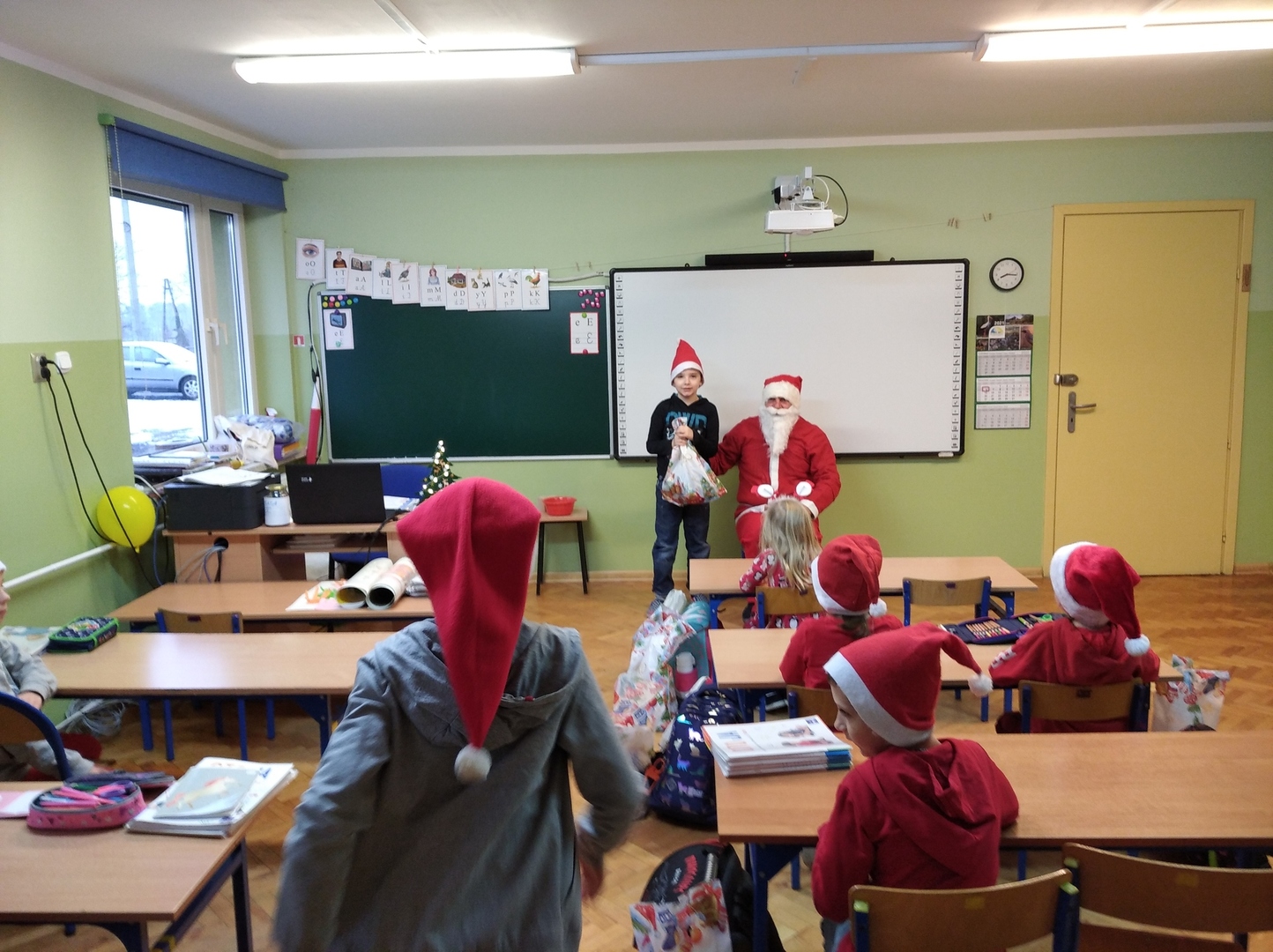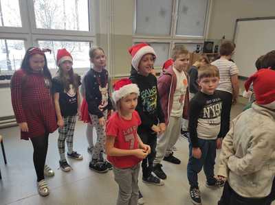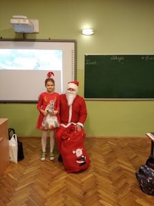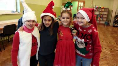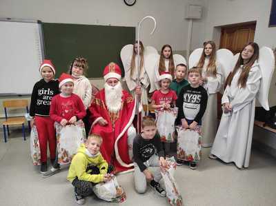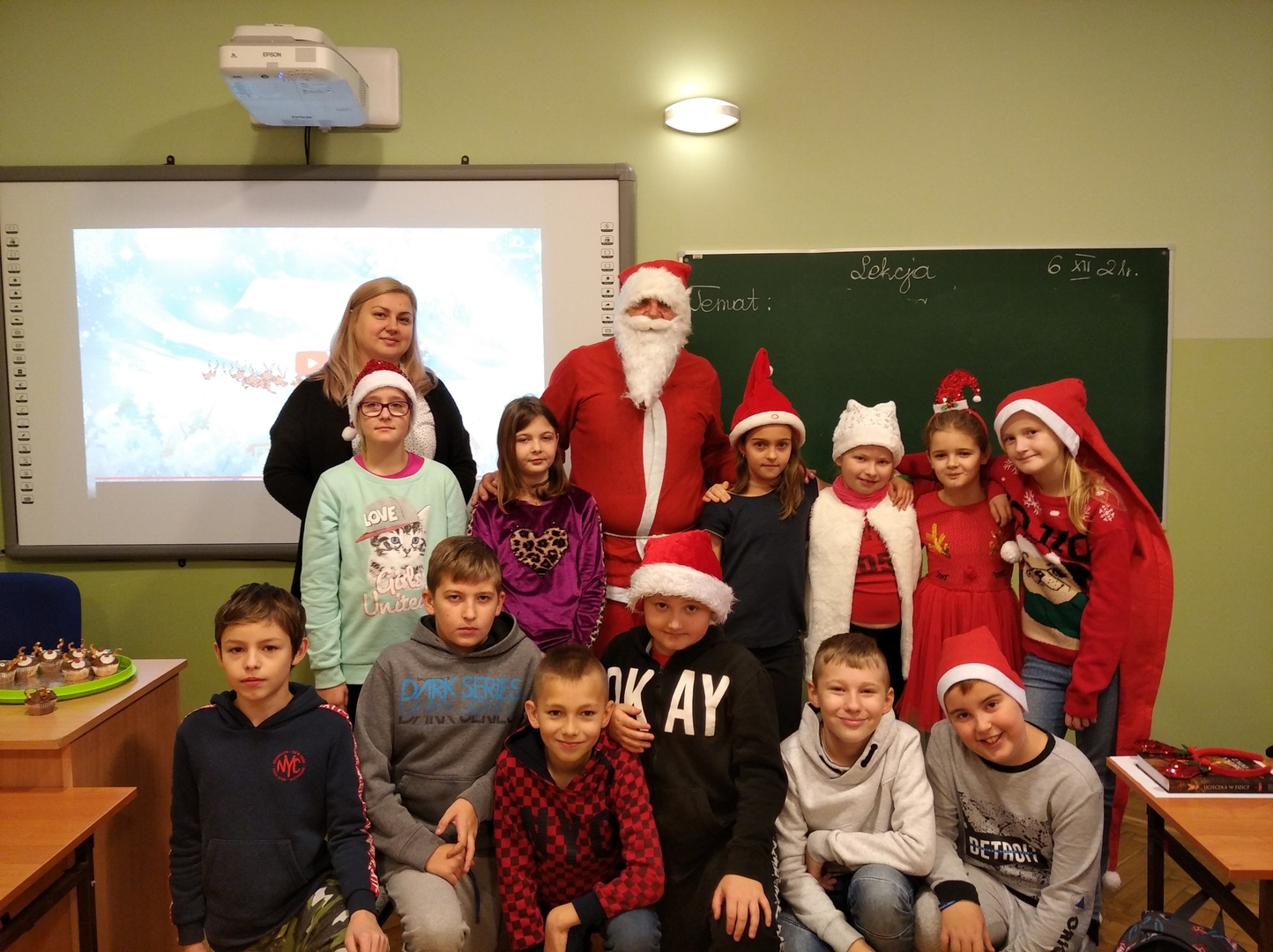 Dzisiejszy dzień w naszej szkole był niezwykły. Uczniowie przyszli w wesołych czapeczkach, a kolorem dominującym ich ubrań był czerwony. Od rana było słychać wesołą mikołajkową i przedświąteczną muzykę. W każdej klasie lekcje przebiegały w miłym nastroju, a to przez to, że odwiedził je Święty Mikołaj, który chętnie z dziećmi rozmawiał, pozował do zdjęć i rozdawał upominki ufundowane przez Radę Rodziców. Ponadto w każdej klasie wychowawcy i nauczyciele przygotowali dodatkowo szereg atrakcji, zabaw, quizów, piosenek oraz poczęstunek. Uczniowie między innymi rysowali Mikołaja z zamkniętymi oczami, rywalizowali w wykonaniu najdłuższego łańcucha choinkowego, malowali figurkę Mikołaja z gipsu, grali w świąteczne memory. Na języku polskim i angielskim również dominowała mikołajkowa atmosfera, zobaczyli prezentację z Mikołajem w roli głównej oraz wykonywali mikołajkowe zadania polonistyczne. To był bardzo udany i wesoły dzień!