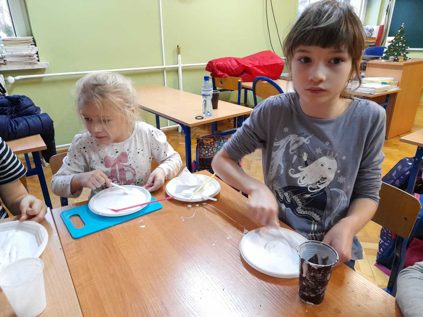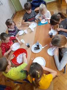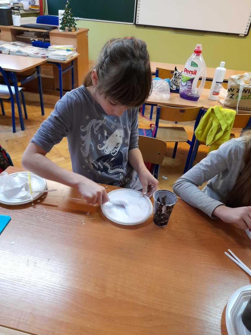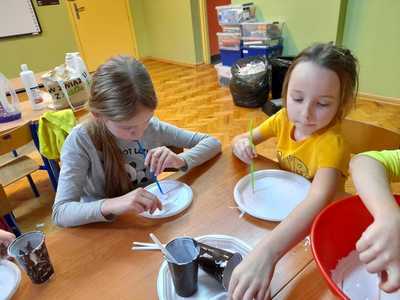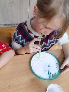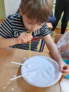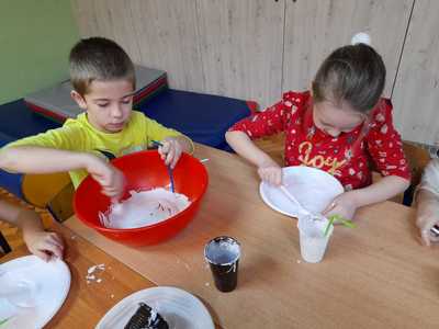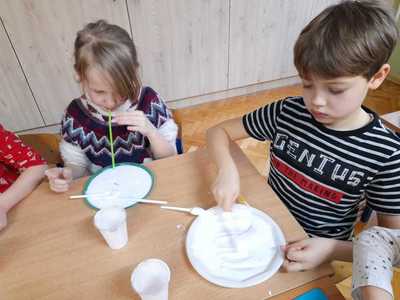 Pierwsze zajęcia w styczniu upłynęły nam na ćwiczeniach logopedycznych oraz doznaniach sensorycznych. Tworzyliśmy masę balonową, w którą za pomocą słomek dmuchaliśmy ćwicząc aparat mowy. Masa była dość klejąca, ale bardzo miła w dotyku.