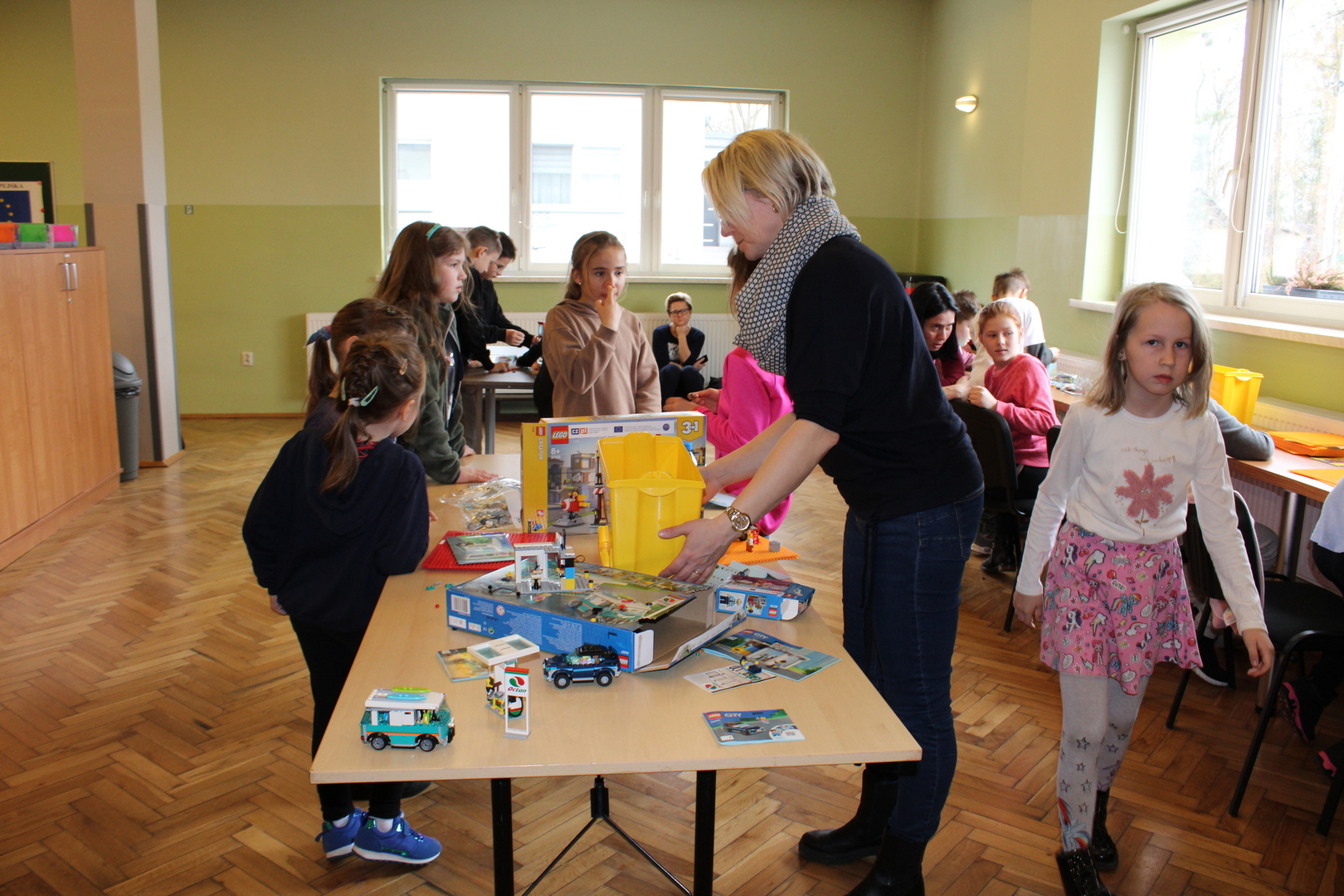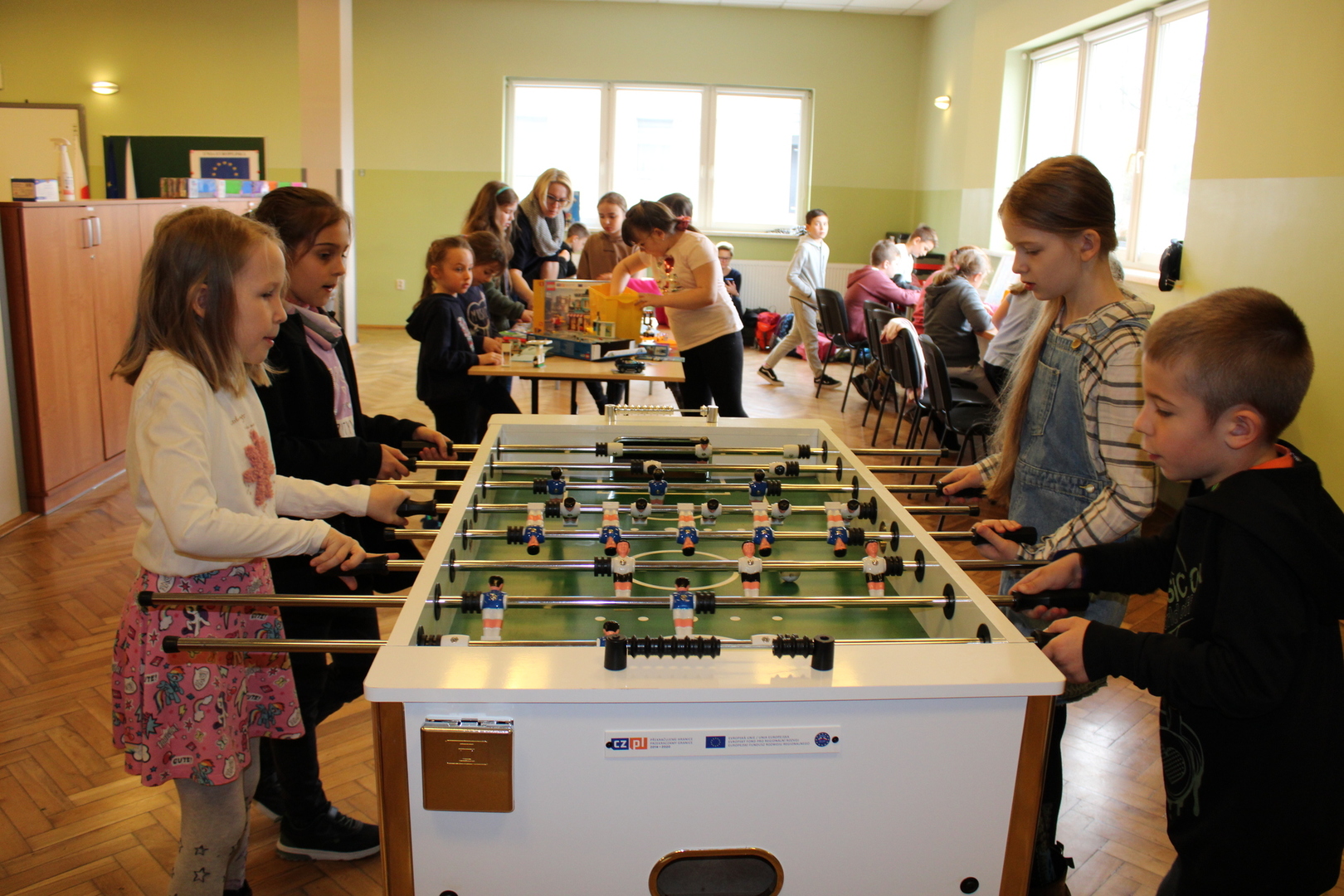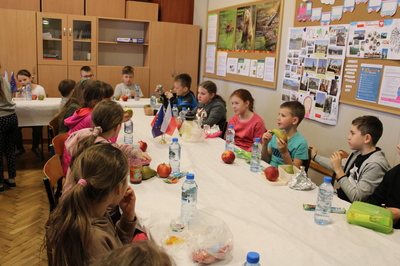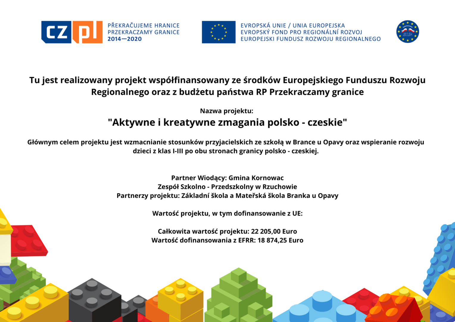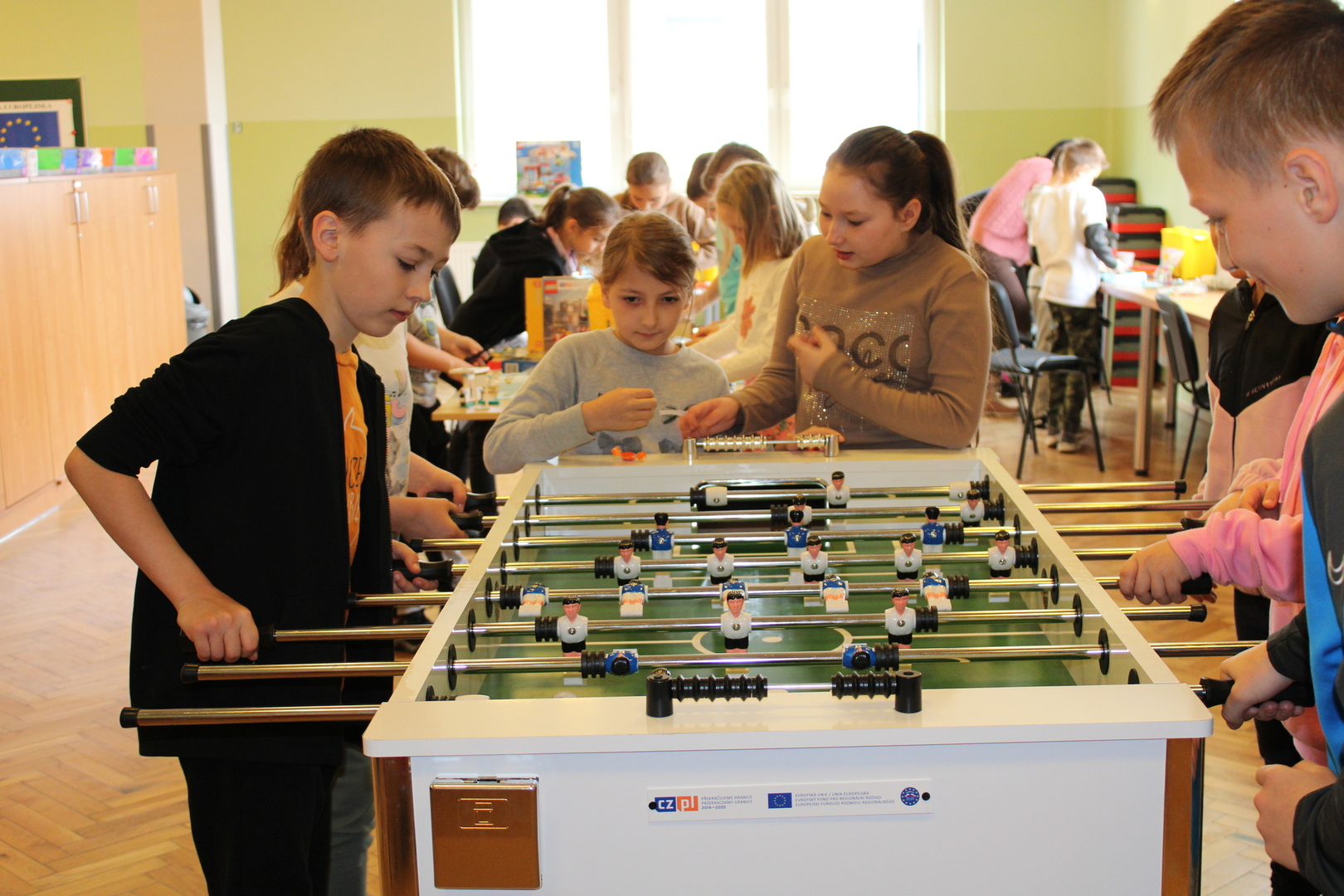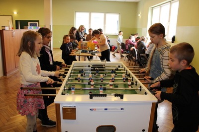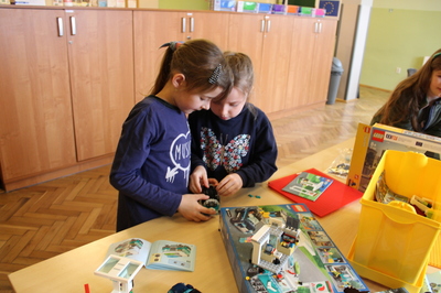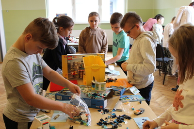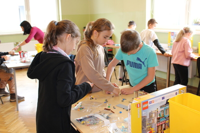 czeskimi przyjaciółmi. Jest to już nasz szósty projekt współpracy transgranicznej, który realizujemy wspólnie ze szkołą w Brance u Opavy. Dzisiejsze pełne wrażeń spotkanie, było okazją dla dzieci do wykazania się kreatywnością. Uczniowie obejrzeli ciekawą prezentację, która zapoznała ich z historią klocków LEGO, a następnie przystąpili do budowania z nich. Powstały w ten sposób efektowne budowle, takie jak na przykład diabelski młyn, stacja benzynowa, cukiernia czy remiza strażacka. Jednak aby poruszyć wyobraźnię dzieci jeszcze bardziej, postawiliśmy przed nimi zadanie wspólnego stworzenia obrazka typu 3D z klocków na ściance. Było to dla nich nowe, pełne pomysłowości wyzwanie. Rozegrane zostały także turnieje gier stołowych: piłkarzyków i cymbergaja. Ten pełen wrażeń dzień zakończył się wspólnym poczęstunkiem oraz wręczeniem upominków, które będą niezwykłą pamiątką naszego spotkania. Sądząc po roześmianych buziach dzieci, był to wyjątkowo udany dzień. Zawiązały się nowe znajomości, bariera językowa zdawała się nie istnieć, a świetna atmosfera nie opuszczała nas przez cały dzień. Teraz wszyscy z niecierpliwością czekamy na kolejne działanie projektowe. A będzie nim interesująca wycieczka. Dokąd? Tego jeszcze nie zdradzimy, dlatego zapraszamy do śledzenia naszej strony, na której już niebawem ukaże się relacja z kolejnego wspólnego spotkania.