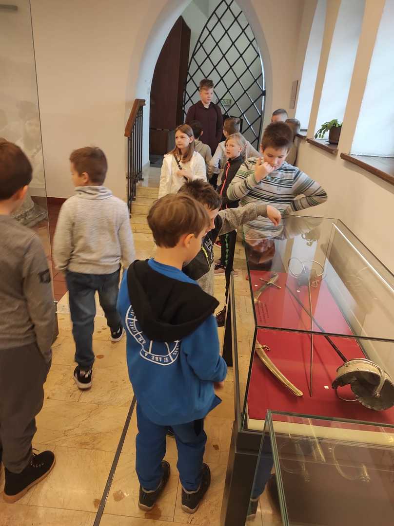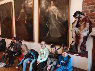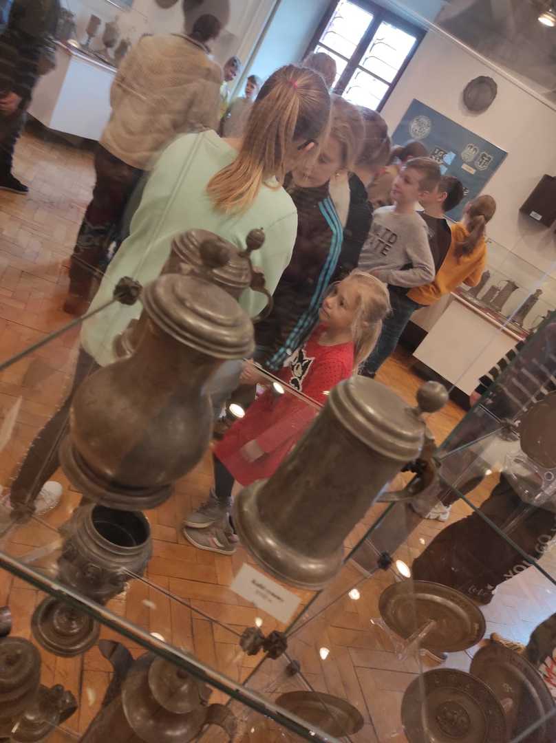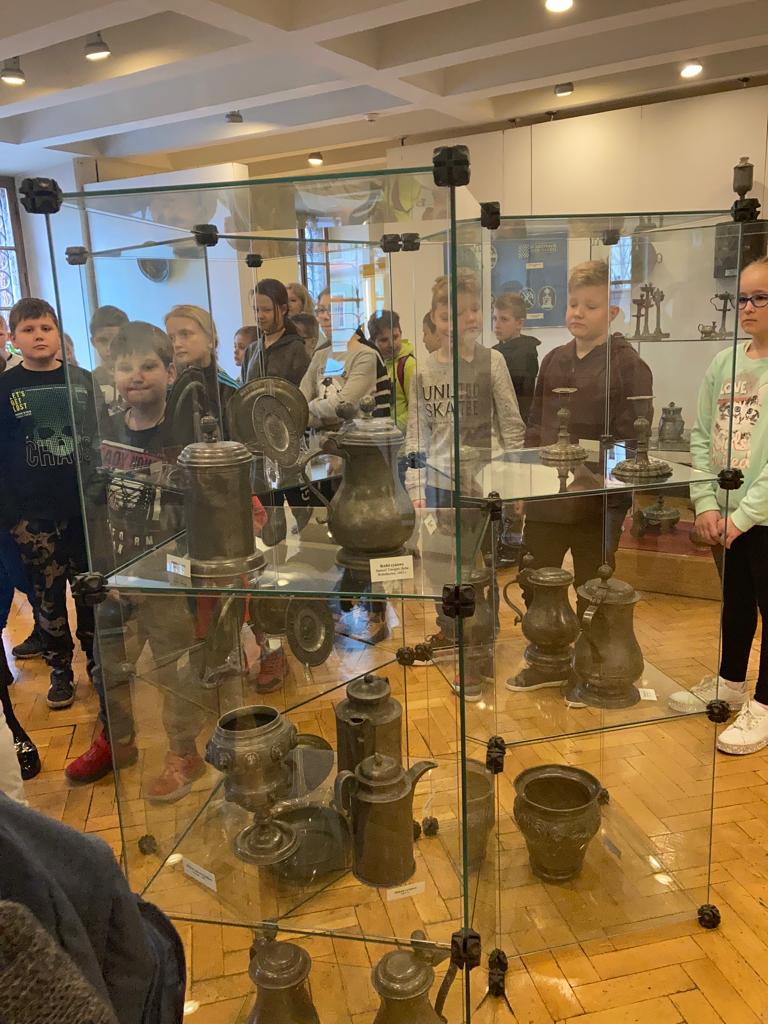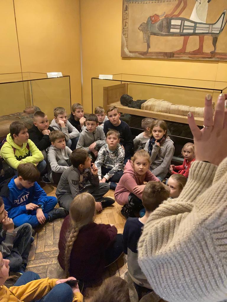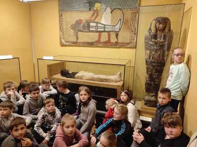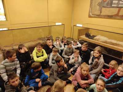 Kolejnym punktem programu było zwiedzanie muzeum, dzieci podziwiały eksponaty z różnych epok, największe zainteresowanie wzbudziła mumia egipska. W drugiej części muzeum oglądaliśmy eksponaty bardziej współczesne, np. gabinet dentystyczny, koronę dożynkową, furę, stroje śląskie, słuchaliśmy opowieści przewodnika o dawnych tradycjach i zwyczajach.