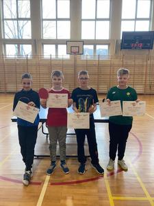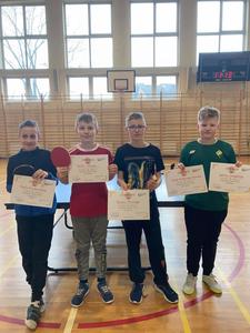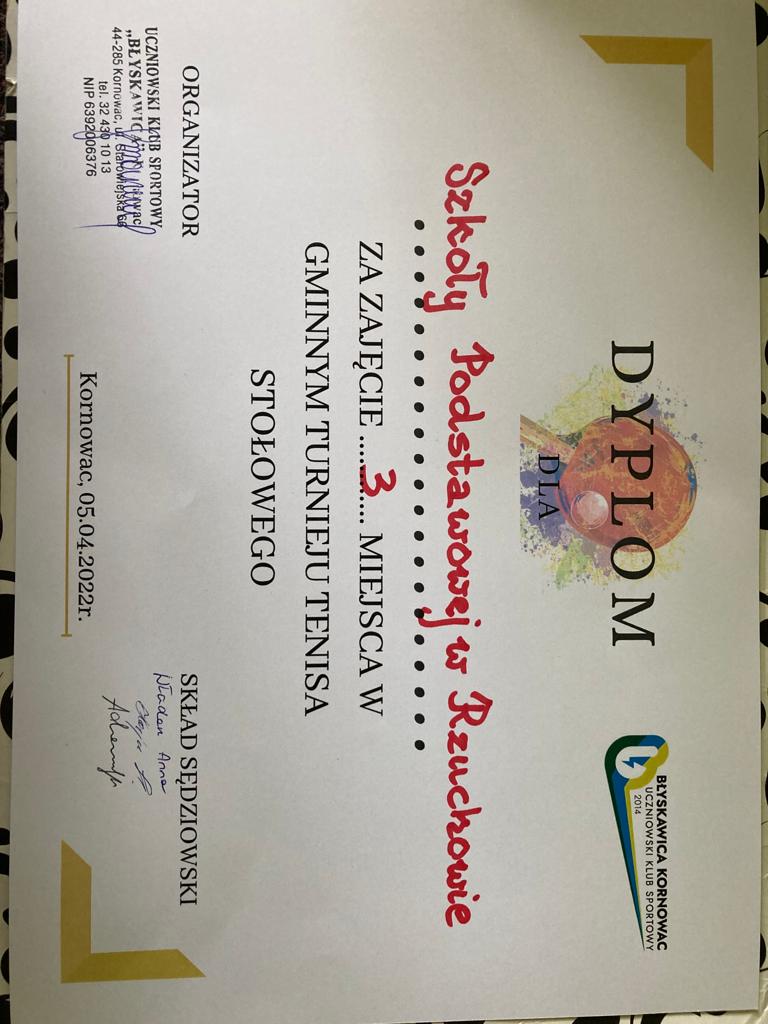 5 kwietnia 2022 roku w ramach Uczniowskiego Klubu Sportowego „Błyskawica” zorganizowano gminny turniej tenisa stołowego na hali w Kornowacu. Naszą szkołę reprezentowali zawodnicy : Paweł Grochowski z klasy trzeciej, Paweł Chłapek z klasy czwartej i dwoje z klasy piątej, to Dawid Kacorzyk i Jakub Zarzycki. W kategorii klas trzecich pierwsze miejsce wywalczył Paweł Grochowski. W rywalizacji pozostałych zawodników nasi uczniowie zdobyli kolejno: IV miejsce – Jakub Zarzycki, V miejsce - Dawid Kacorzyk , a VII Paweł Chłapek. Drużynowo pierwsze miejsce zdobyła szkoła w Pogrzebieniu punktów 30:18 , drugie szkoła z Kobyli punktów 25;29 , a Rzuchów trzecie punktów 25:33. Poziom gry był bardzo wyrównany. Wszystkim zawodnikom gratulujemy pięknej postawy sportowej i liczymy na kolejne sukcesy nie tylko w tenisie stołowym.