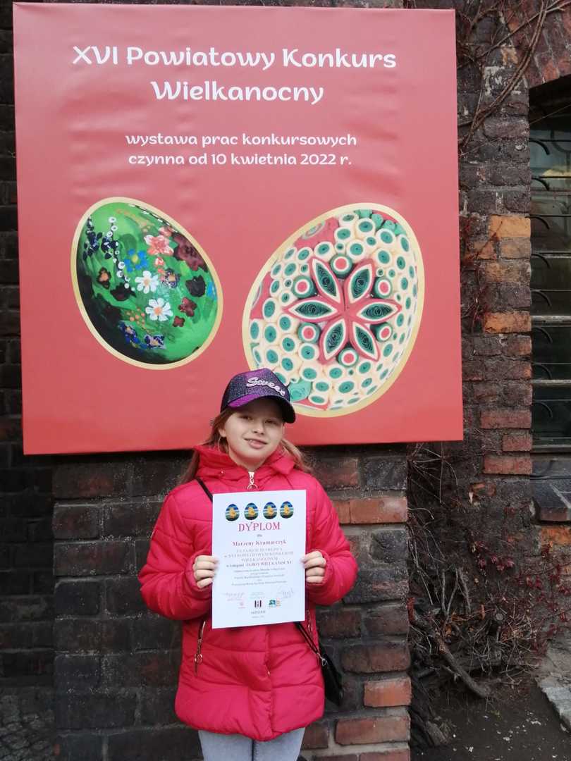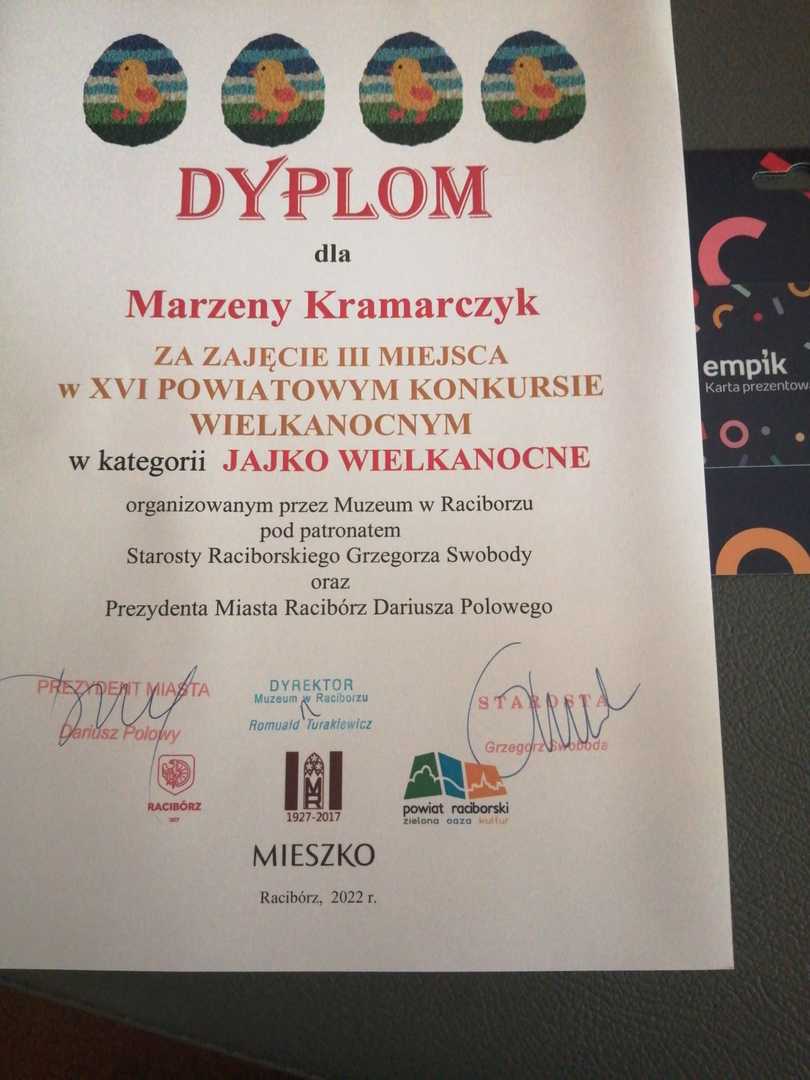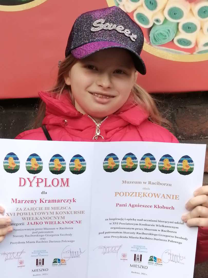 Muzeum w Raciborzu zorganizowało XVI Powiatowy Konkurs Wielkanocny. Konkurs ma na celu podtrzymywanie dawnych zwyczajów regionalnych związanych ze Świętami Wielkanocnymi. Uczniowie naszej szkoły wysłali prace konkursowe w kategorii: jajko wielkanocne. Jesteśmy bardzo dumni z naszych wychowawanków. Marzena Kramarczyk z klasy 4 oraz Paweł Grochowski z klasy 3 uplasowali sie na III miejscach w swoich grupach wiekowych, natomiast Zofia Grochowska z klasy 1 otrzymała wyróżnienie. Gratulujemy!