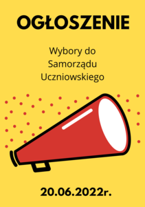 Wybory do SU na nowy rok szkolny odbędą się w poniedziałek 20 czerwca 2022r. Kandydatów do pełnienia funkcji Przewodniczącego Samorządu Uczniowskiego proszę o przygotowanie plakatów, na których zaprezentowany zostanie program wyborczy. Gotowe prace proszę przekazać do sekretariatu.