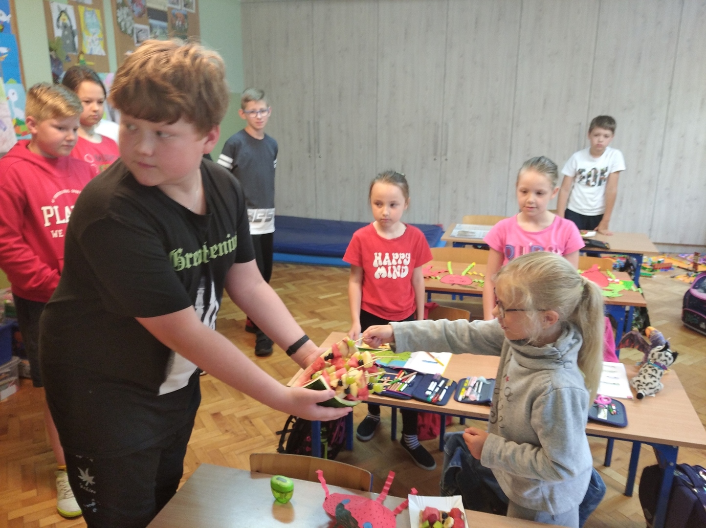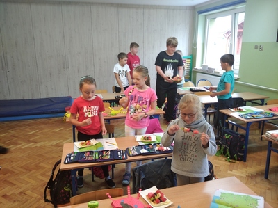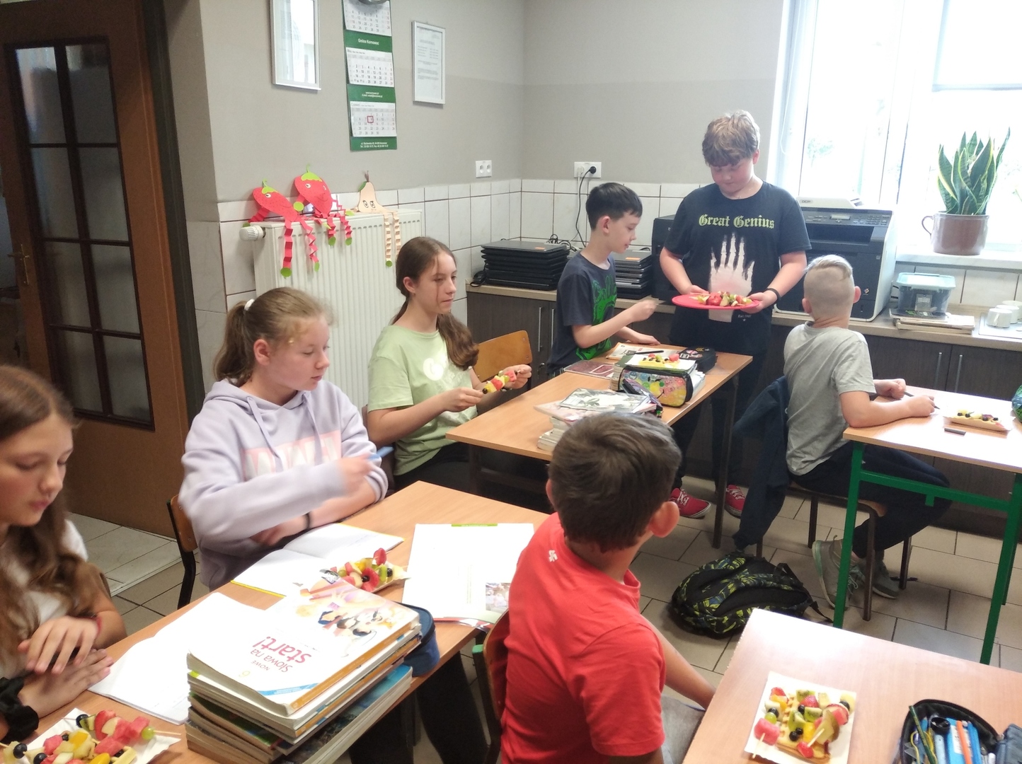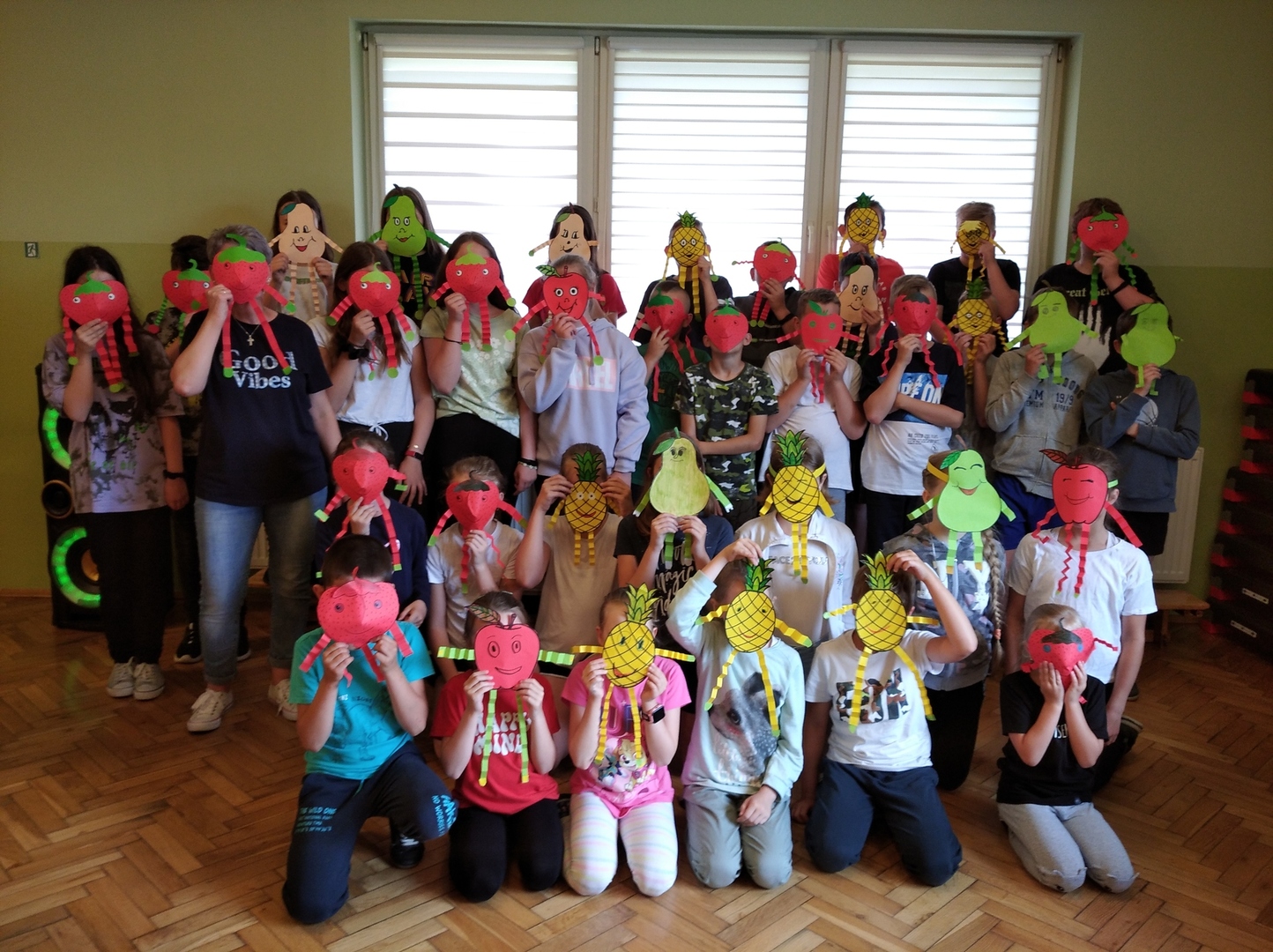 Dzisiejszego dnia zorganizowano w naszej szkole akcję „Owocowy zawrót głowy”. Była to okazja do zwrócenia uwagi na zasady racjonalnego odżywiania oraz przypomnienia jaką rolę odgrywają witaminy zawarte w owocach dla naszego zdrowia. Klasa V przygotowała dla wszystkich kolorowy, owocowy poczęstunek w formie szaszłyków i gofrów z owocami. Uczniowie wykonali też wesołe, owocowe ludziki z papieru wykorzystane do wspólnego, zabawnego zdjęcia.