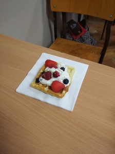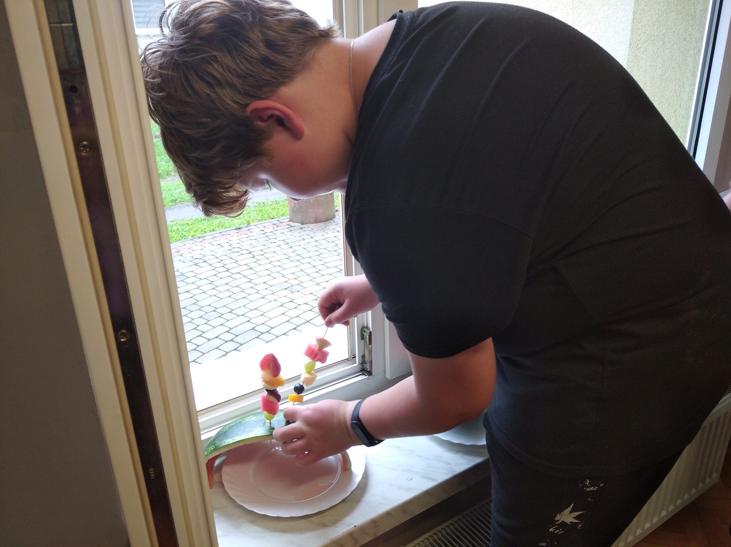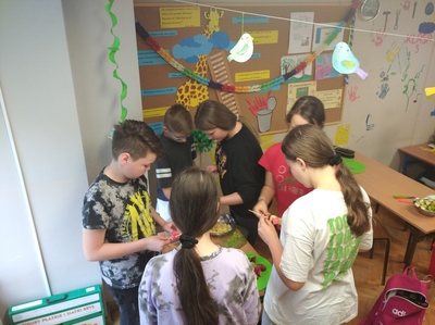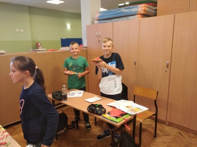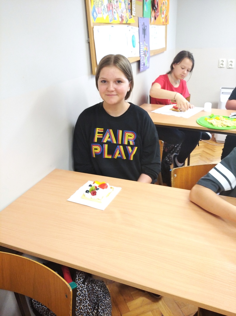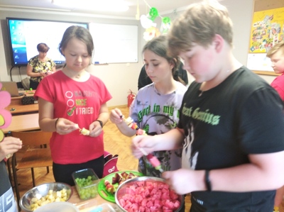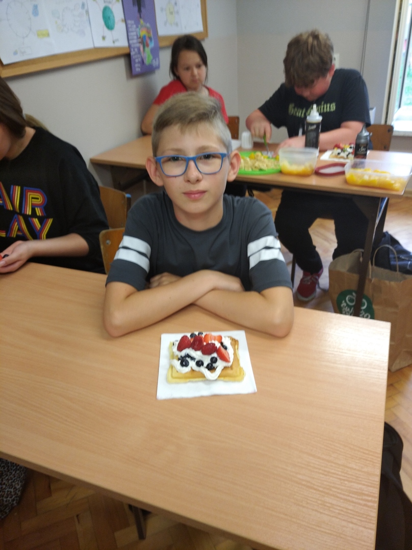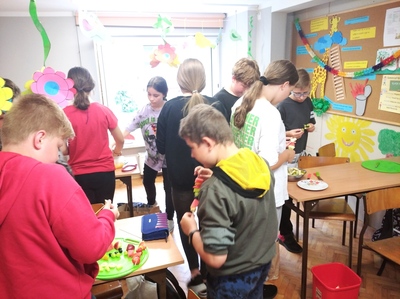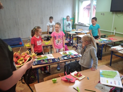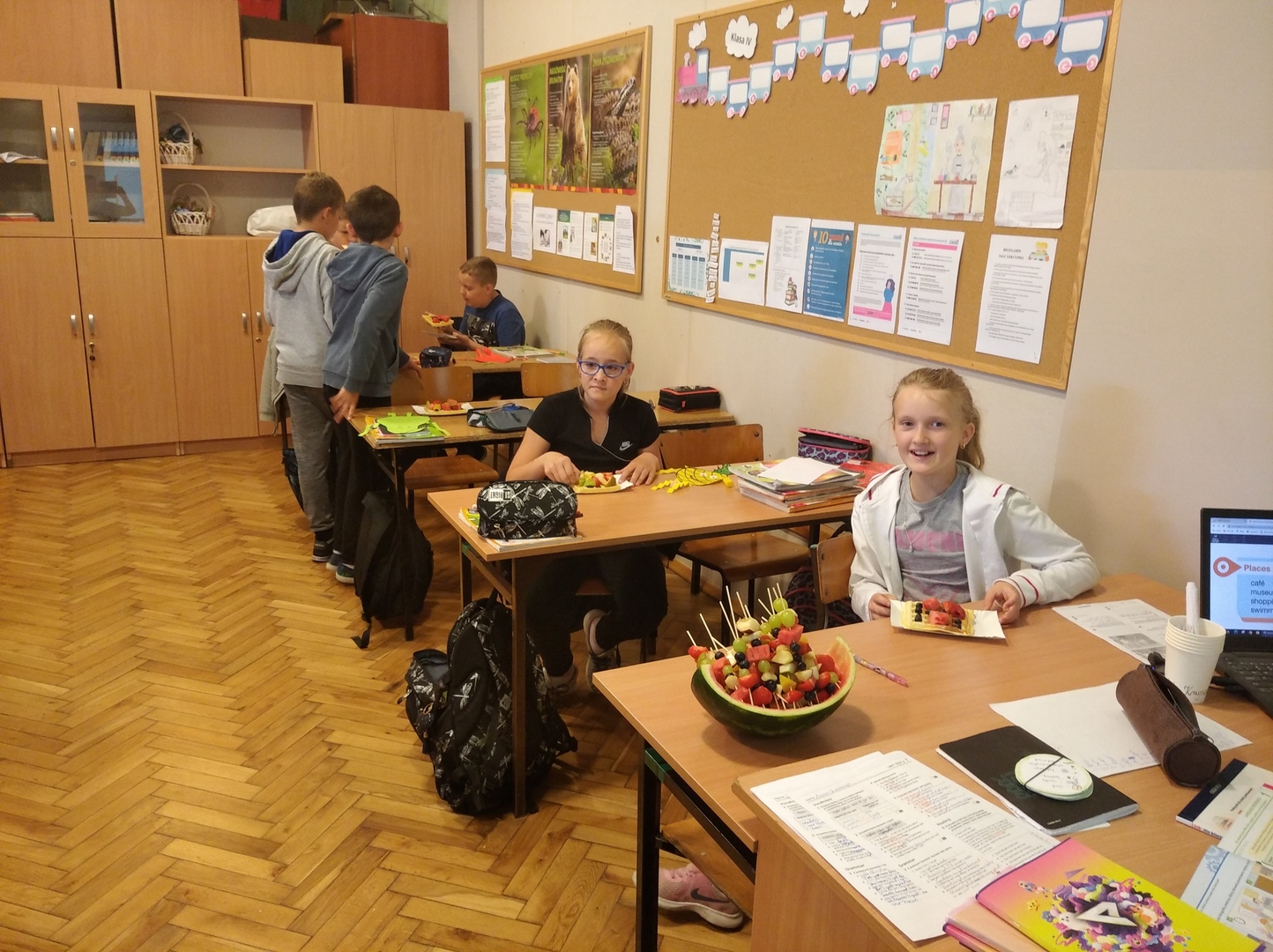 Dzisiejszego dnia zorganizowano w naszej szkole akcję „Owocowy zawrót głowy”. Była to okazja do zwrócenia uwagi na zasady racjonalnego odżywiania oraz przypomnienia jaką rolę odgrywają witaminy zawarte w owocach dla naszego zdrowia. Klasa V przygotowała dla wszystkich kolorowy, owocowy poczęstunek w formie szaszłyków i gofrów z owocami. Uczniowie wykonali też wesołe, owocowe ludziki z papieru wykorzystane do wspólnego, zabawnego zdjęcia.