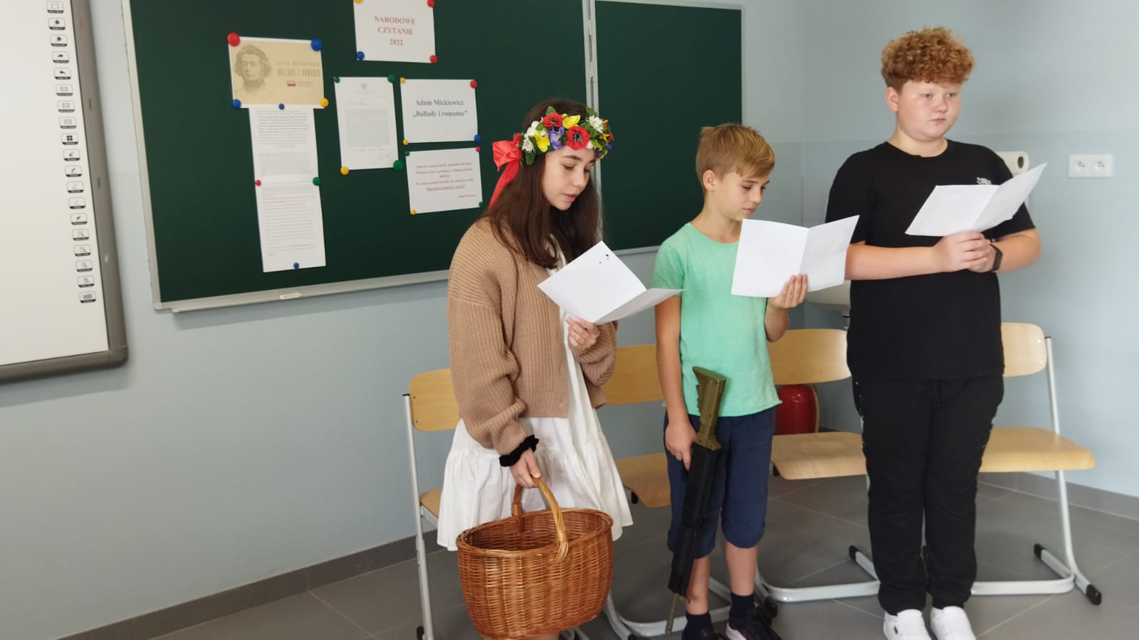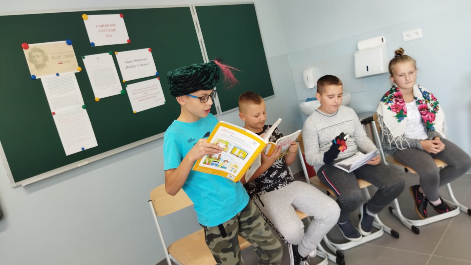 Jak co roku nasza szkoła z chęcią i zaangażowaniem zrealizowała własną odsłonę Narodowego Czytania. Lekturą tegorocznej edycji akcji czytelniczej były „Ballady i romanse” Adama Mickiewicza. Do wspólnej lektury poezji otwierającej epokę romantyzmu w Polsce zaprosiliśmy uczniów klas IV-VI. Przedstawiciele klas przygotowali prezentację czytelniczą wybranych utworów literackich należących do tomiku „Ballad i romansów”. Zgromadzonej w szkolnej bibliotece publiczności zaprezentowano utwory: „Romantyczność”, „Pani Twardowska”, „Świtezianka” i „Powrót taty”. Uczniowie odczytali teksty z podziałem na role.