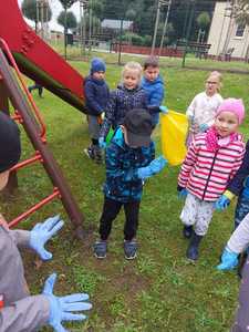 Każde dziecko otrzymało jednorazowe rękawiczki oraz worki na śmieci przygotowane przez Urząd Gminy w Kornowacu.