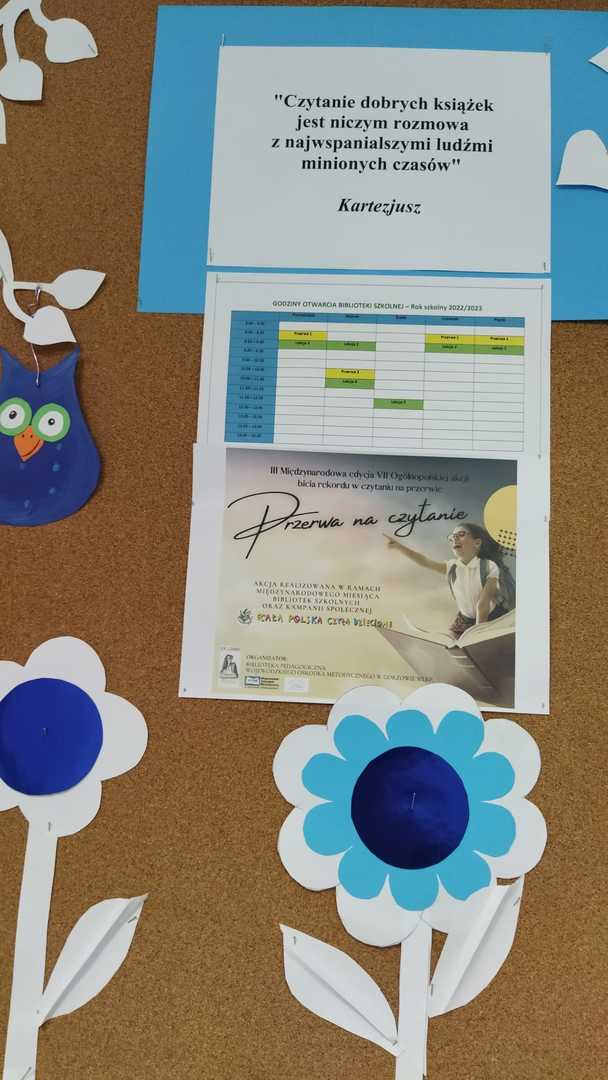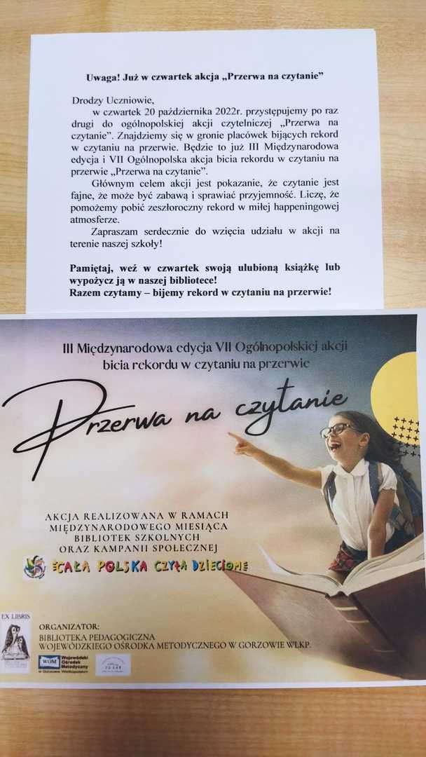 W czwartek 20 października 2022 r. przystąpiliśmy po raz drugi do ogólnopolskiej akcji czytelniczej „Przerwa na czytanie”. Znaleźliśmy się w gronie placówek bijących rekord w czytaniu na przerwie. Jest to już III Międzynarodowa edycja i VII Ogólnopolska akcja bicia rekordu w czytaniu na przerwie „Przerwa na czytanie”.