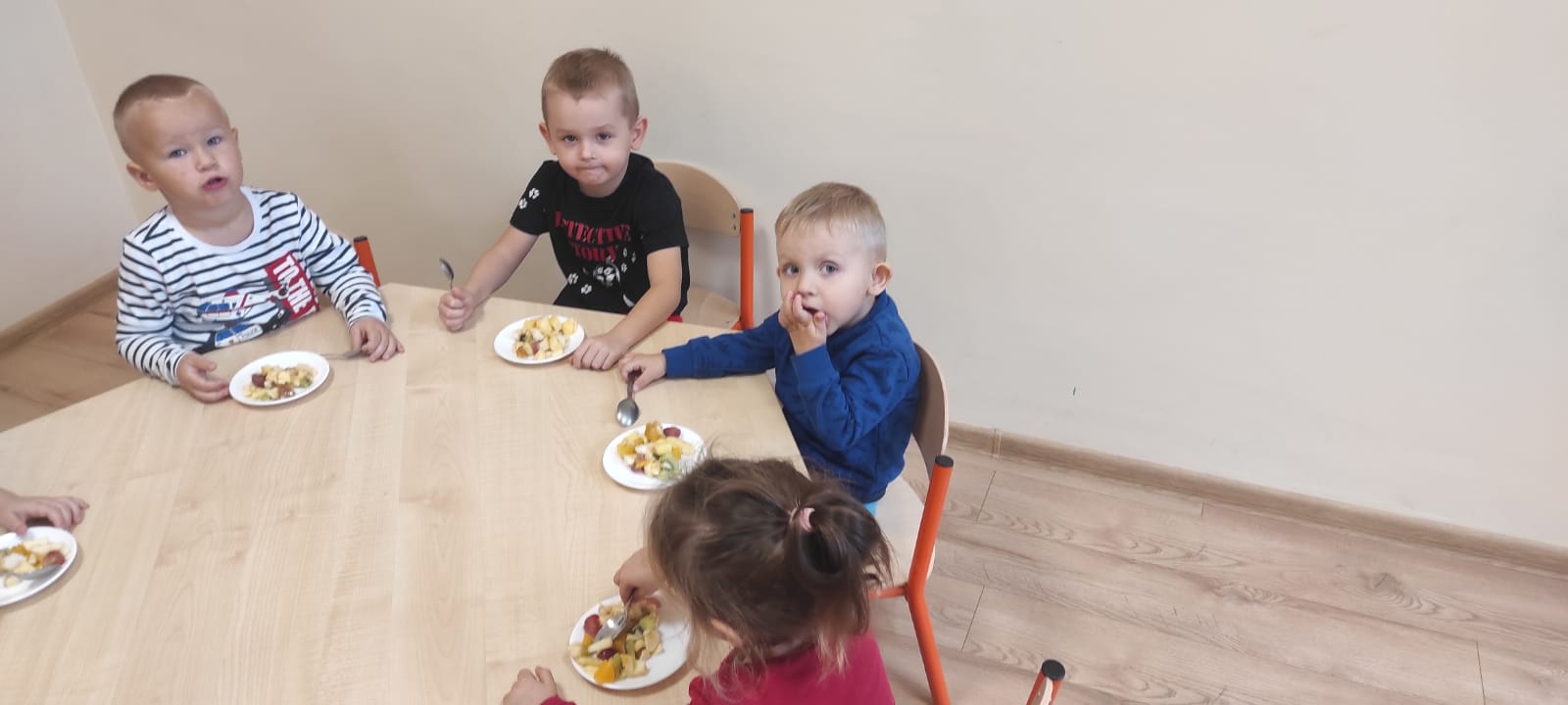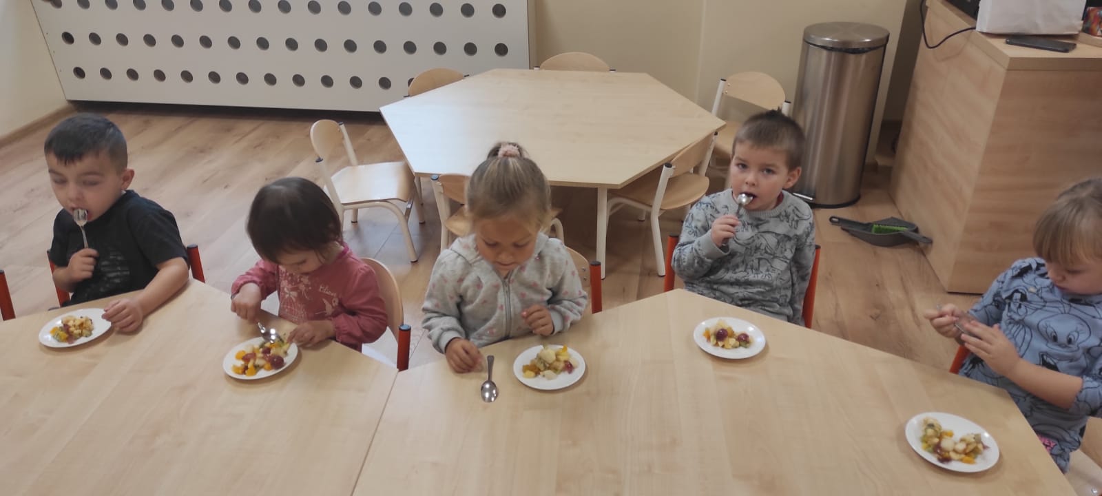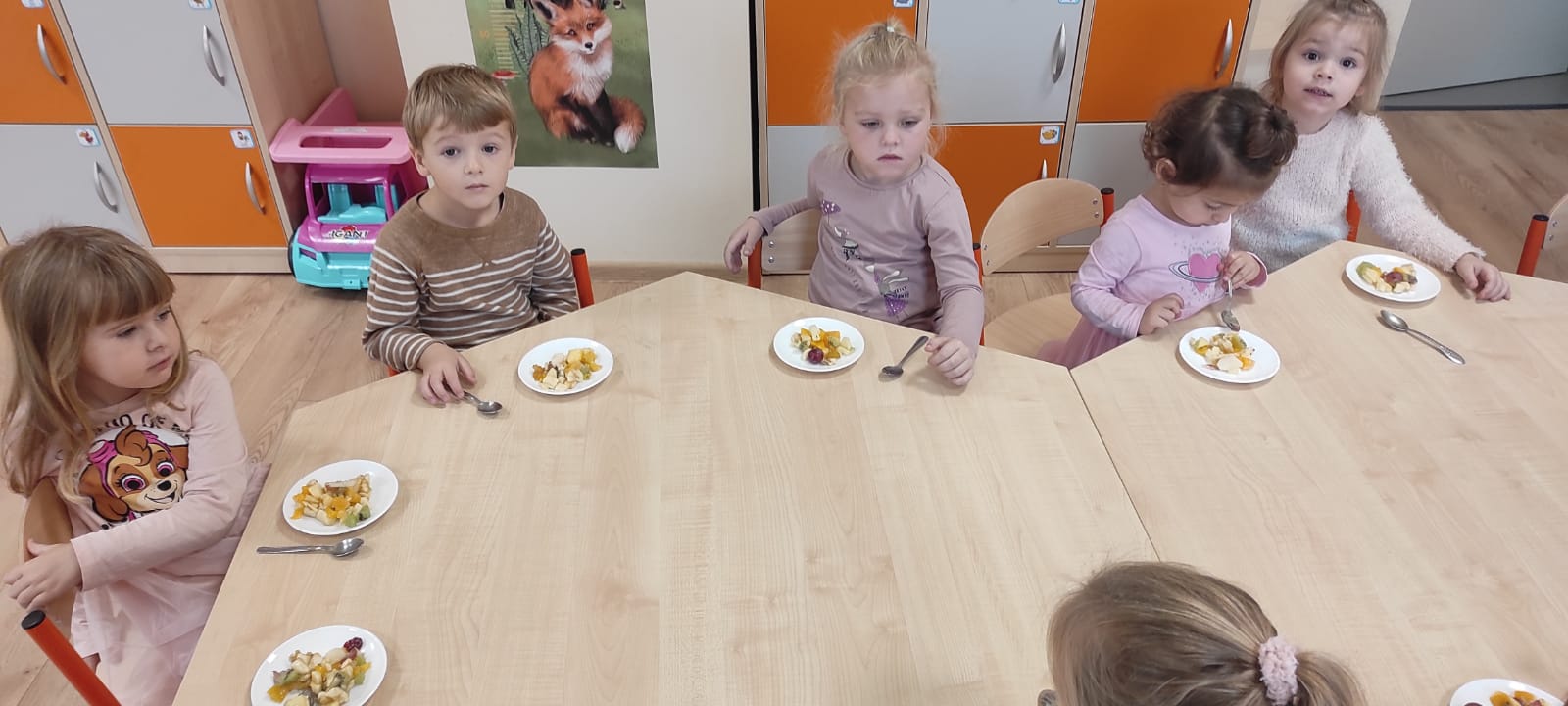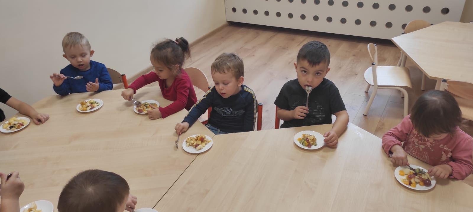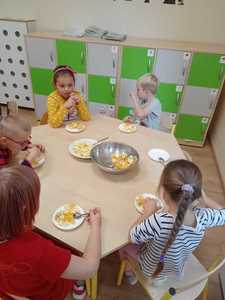 Edukacja prozdrowotna to ważny element pracy z dziećmi w przedszkolu. Wszyscy dobrze wiemy, ile pozytywów dla właściwego rozwoju dzieci niesie zdrowe odżywianie. W naszym przedszkolu dzieci z okazji Światowego Dnia Warzyw i Owoców miały okazje poszerzyć swoją wiedzę na temat właściwej diety oraz przekonać się jak pyszne i pachnące mogą być surowe warzywa i owoce. Z wielkim apetytem dzieci degustowały przygotowane przez siebie owocowe desery, zdrowe pyszne kanapki oraz kompoty. Była to prawdziwa bomba witaminowa, którą dzieci zjadły ze smakiem. ,,Leśne Skrzaty" uważnie wpatrywały się w piramidę zdrowego odżywiania a następnie sami próbowali ją odtworzyć. Rozpoznawaliśmy też owoce i warzywa po kształtach i smakach – bawiliśmy się przy tym znakomicie i …smakowicie!