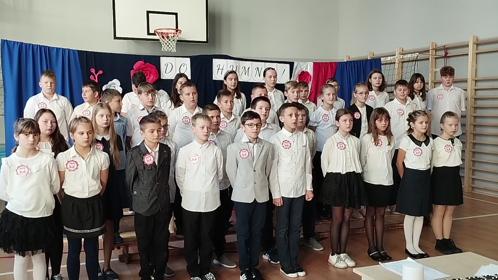 ,,Do Hymnu" to ogólnopolska akcja dla szkół podstawowych. Zadaniem uczniów jest wspólne wykonanie Hymnu Państwowego oraz dwóch wybranych pieśni hymnicznych. Udział w tym wydarzeniu brały udział dzieci z klas 4 - 6. Uczniowie pięknie i z odpowiednią intonacją zaśpiewali takie utwory jak: ,,Mazurek Dąbrowskiego", ,,Rota" oraz ,,Marsz Polonia". Zapraszamy do wysłuchania występu dzieci z naszej szkoły.