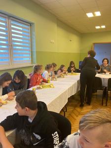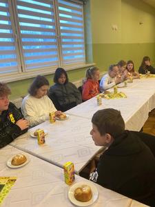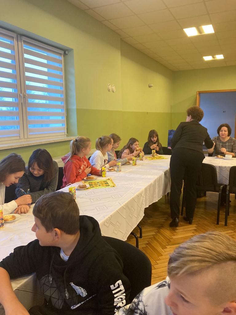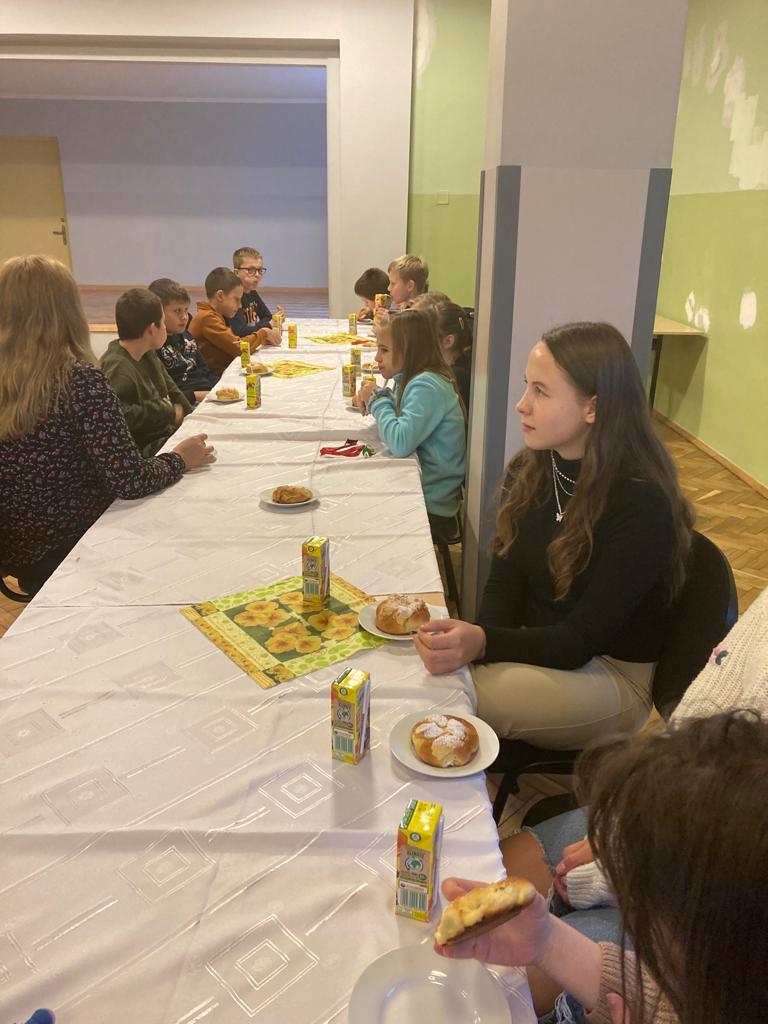 Punktem kulminacyjnym był słodki poczęstunek przygotowany przez organizatora spotkania. Panie z rzuchowskiego Koła Gospodyń Wiejskich w ramach projektu „Kołocz z makiem i serem – chluba każdej śląskiej gospodyni – dzielimy się naszym doświadczeniem z młodym pokoleniem” upiekły dla naszych uczniów przepyszne kołaczyki.