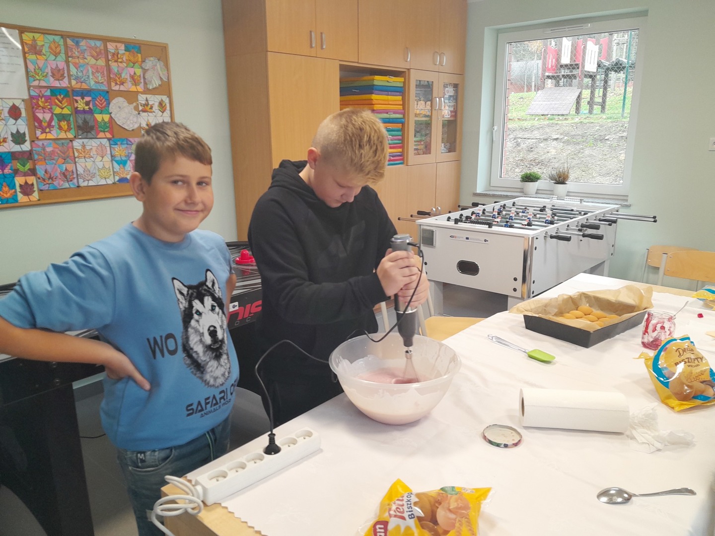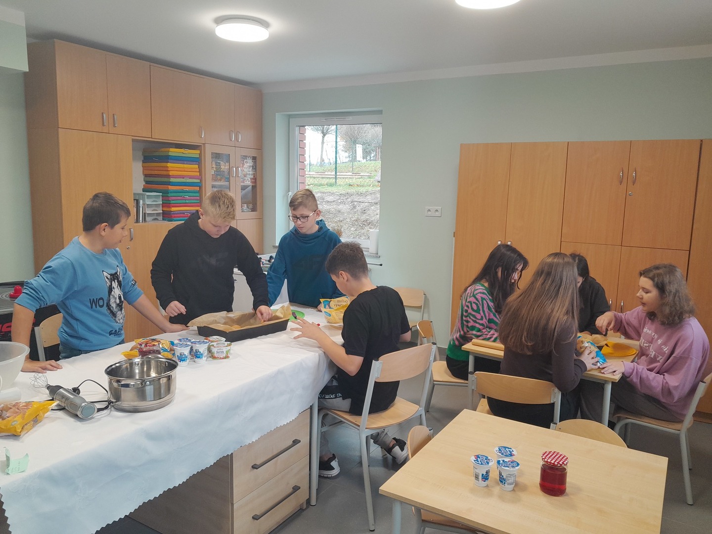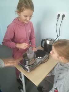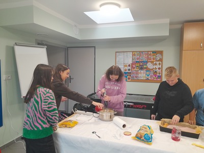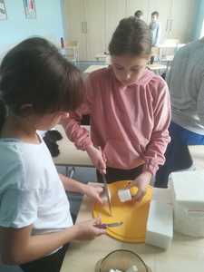 - Kl. VI w ramach zajęć kreatywnych postanowiła wykonać pyszny deser. Dwie grupy uczniów ( dziewczęta kontra chłopcy ) mając do dyspozycji odpowiednie produkty musieli wymyśleć i wykonać smaczny deser . Garnki, blender niezbędne produkty do wykonania ww. zadania. Zabawa wyśmienita, uczniowie zadowoleni, maksimum zaangażowania, a efekt końcowy przeszedł oczekiwania nauczyciela.
