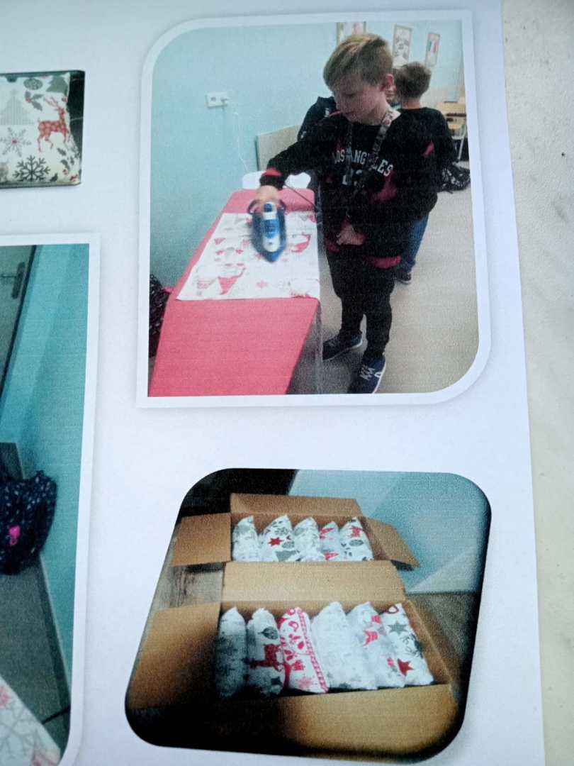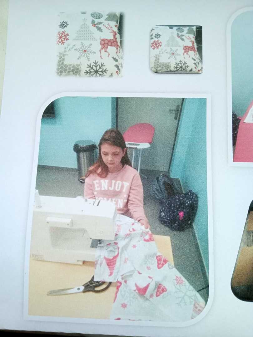 - Kl. V na zajęciach kreatywnych, podczas szycia przez uczniów poszewek świątecznych, kształciła umiejętności manualne: umiejętności korzystania z maszyny do szycia, posługiwania się igłą i nitką, umiejętność prasowania – świetna zabawa dla uczniów, warta upamiętnienia. Dlatego kilku chłopców zajęło się robieniem zdjęć z wykorzystaniem statywu; poduszki w różnym ujęciu, koleżanki szyjące i koledzy prasujący. Czas mile spędzony, w 100% wykorzystany; uczniowie bardzo zadowoleni, prosili o kontynuację tego typu zajęć.
