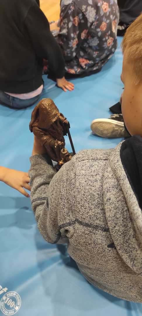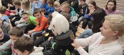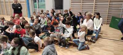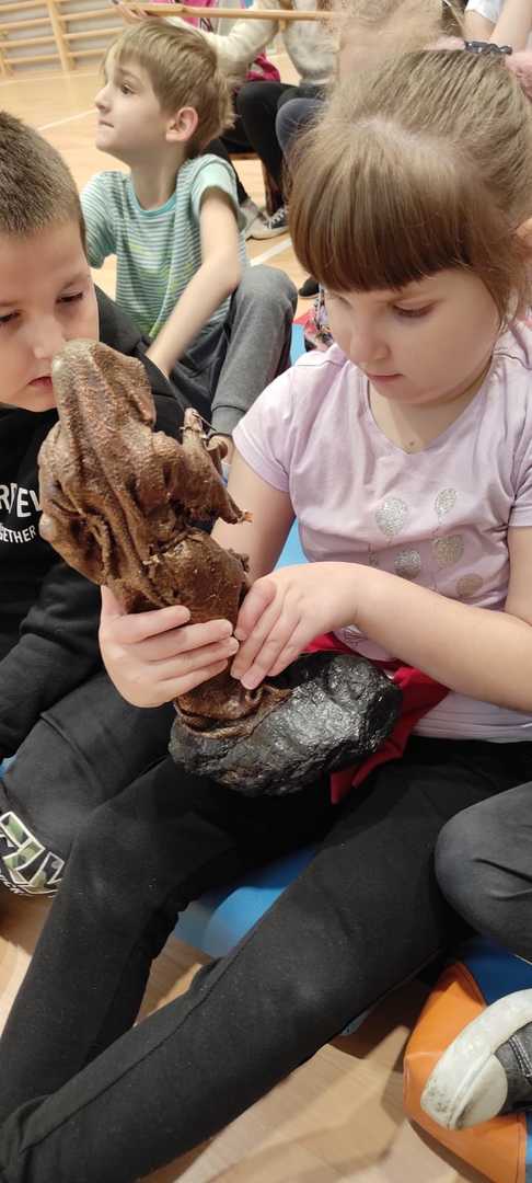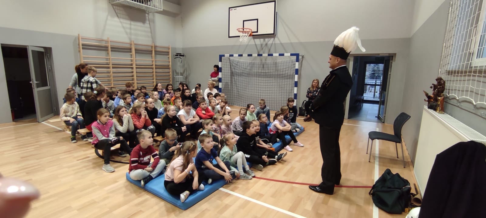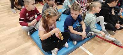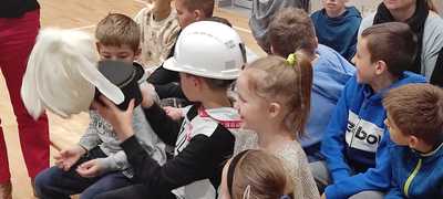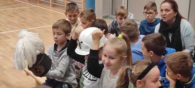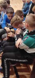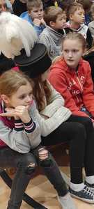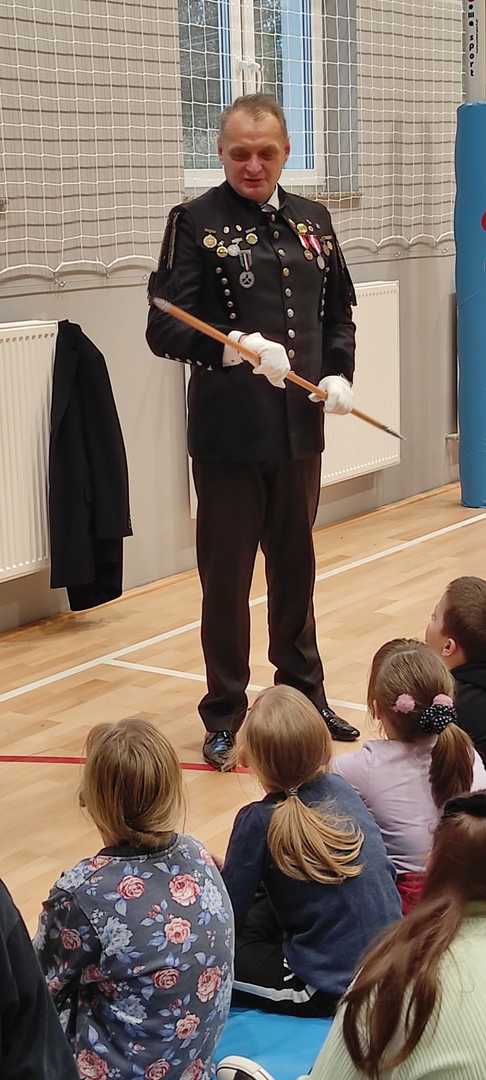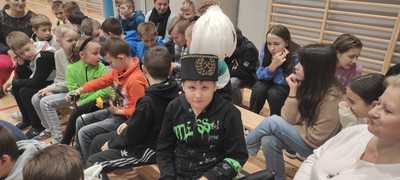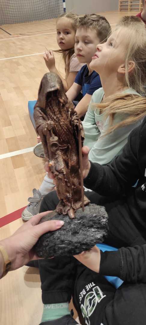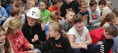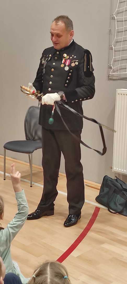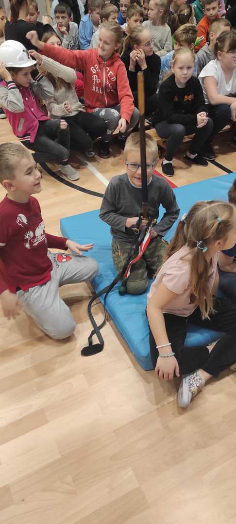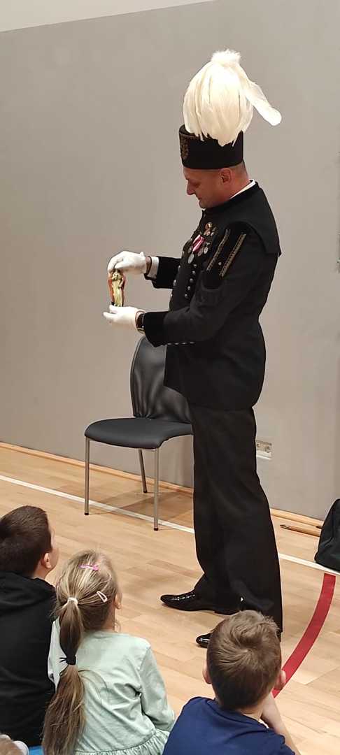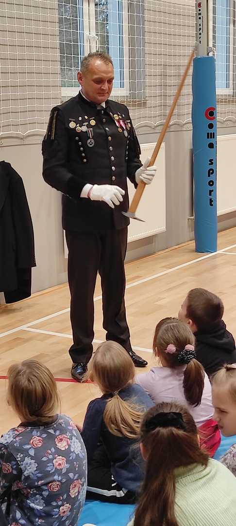 Nasz gość w bardzo ciekawy sposób opowiedział dzieciom o tym kim jest górnik i na czym polega jego praca. Uczniowie dowiedzieli się m.in. jak wygląda strój górnika, od czego zależy kolor pióropusza , co górnicy wydobywają w kopalniach, jakich narzędzi używają i dlaczego ich praca jest niebezpieczna. Nie zabrakło również szeregu ciekawostek oraz historycznych wiadomości na temat pracy górnika. Dodatkową atrakcją były różne przedmioty, które przyniósł nasz gość np. lampy, latarki górnicze, kaski, kilofy, figurki patronów i postaci z legend związanych z kopalnią „Anna”. Sprawiło to dzieciom dużo radości, które nie tylko słuchały, ale z zainteresowaniem oglądały i dotykały przyniesione akcesoria. Dodatkowy entuzjazm wzbudziła słodka niespodzianka, którą nasz gość przygotował dla uczniów.