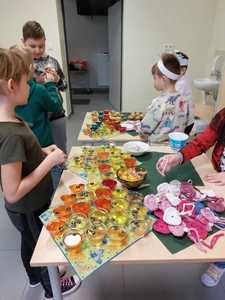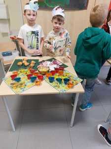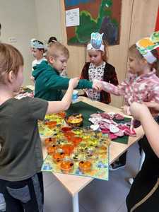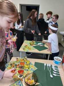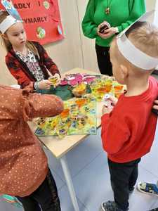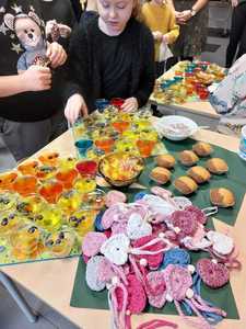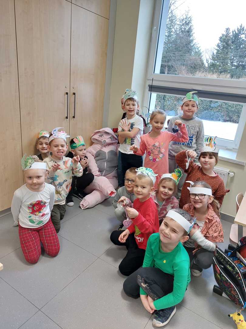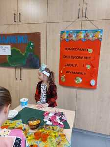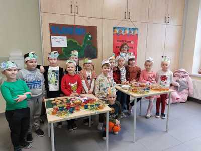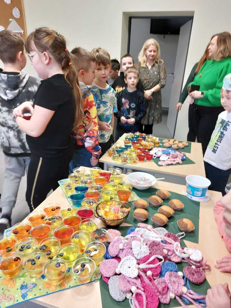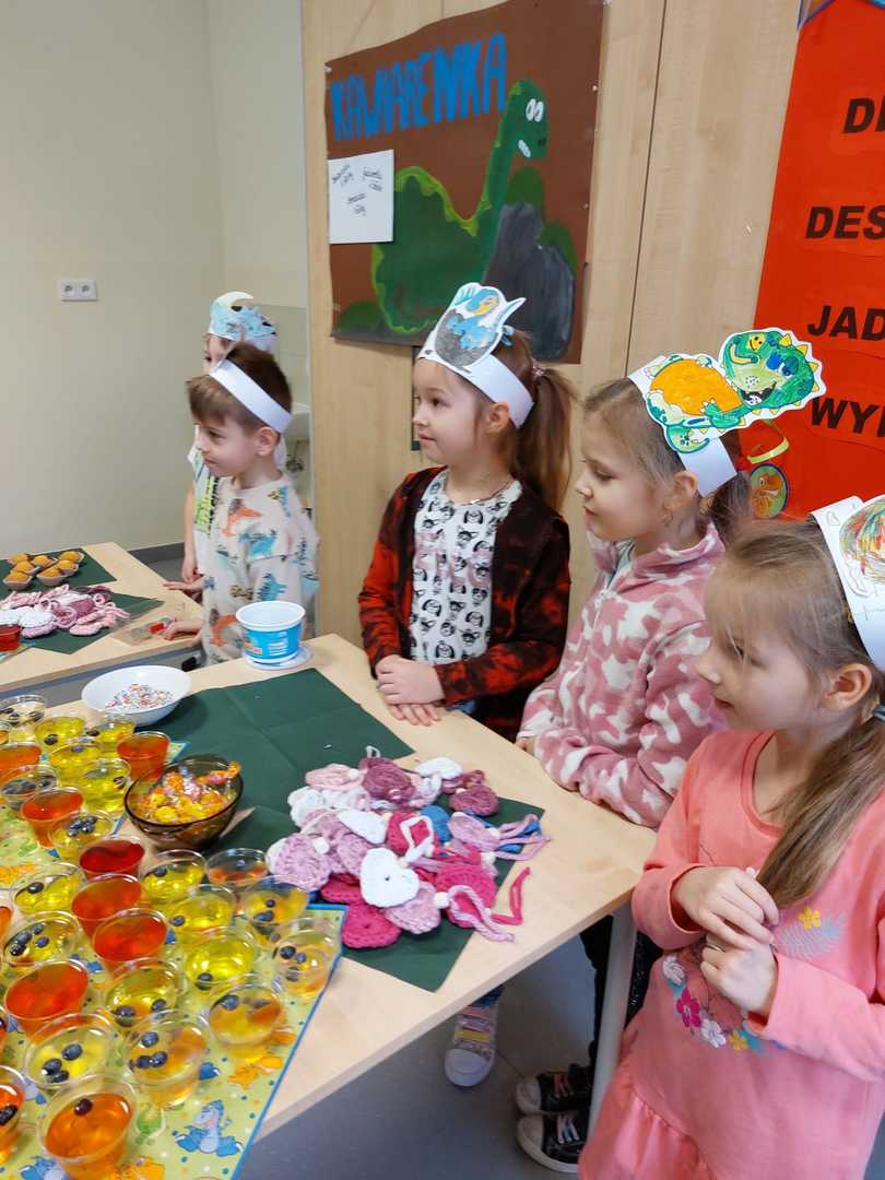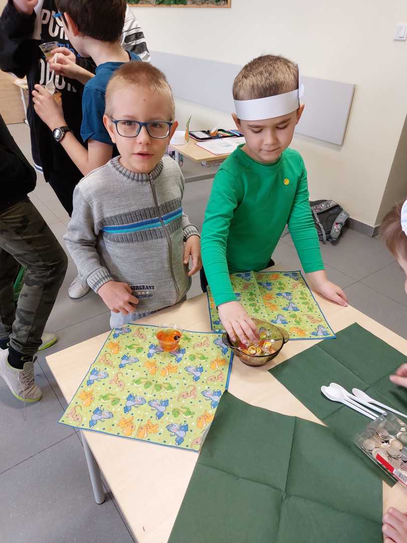 Dnia 8.02.2023r. uczniowie klasy I wraz z rodzicami i wychowawcą przygotowali kawiarenkę, której przewodnim hasłem było -,,DINOZAURY DESERÓW NIE JADŁY I UMARŁY”. O wystrój sali i promocję akcji postarali się rodzice, wykonując kolorowe plakaty nawiązujące do tematu ,,słodkiego wydarzenia”. Aby umilić pobyt w kawiarence, dzieci przyniosły ze sobą maskotki dinozaurów, a na głowy założyły własnoręcznie wykonane opaski z wizerunkiem zwierzaków. Na stołach pojawiły się słodkie galaretki z owocami, babeczki, ,,uśmiechnięte” cukierki, a w nawiązaniu do zbliżających się Walentynek szydełkowe serduszka - breloczki. Smakowita i kolorowa oferta produktów przyciągnęła kupujących. Uczniowie klasy I z ochotą podjęli zadania gospodarza akcji - nabywali umiejętność współpracy i integracji w grupie, uczyli się obsługi klienta, obliczania ceny kupowanych towarów i wydawania reszty. Akcja cieszyła się dużym zainteresowaniem, dzieci były zadowolone i chętne do organizowania kolejnych przedsięwzięć.