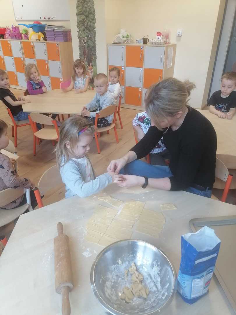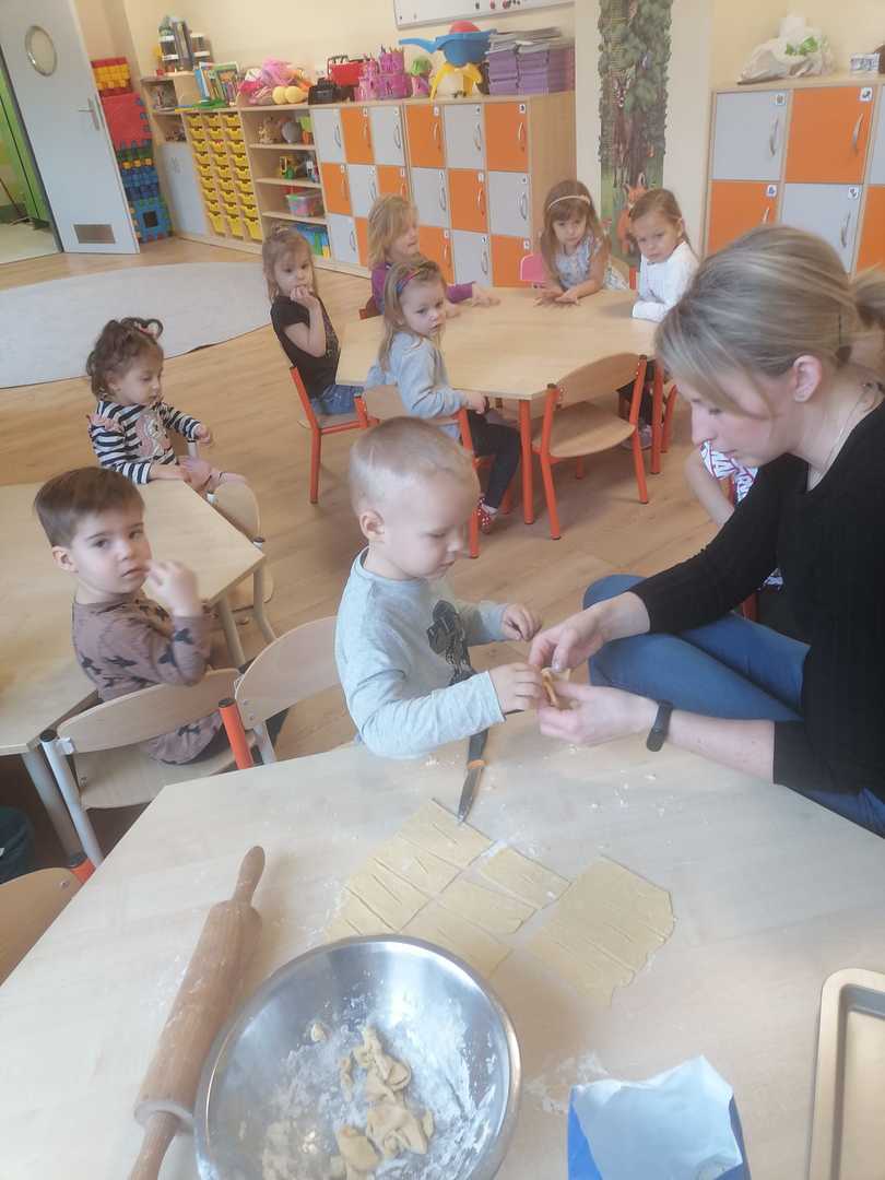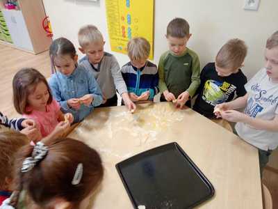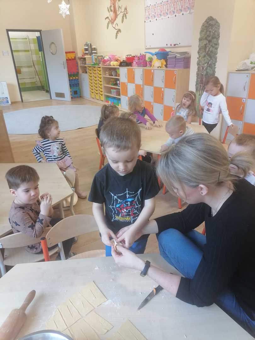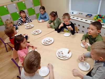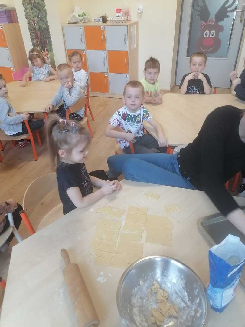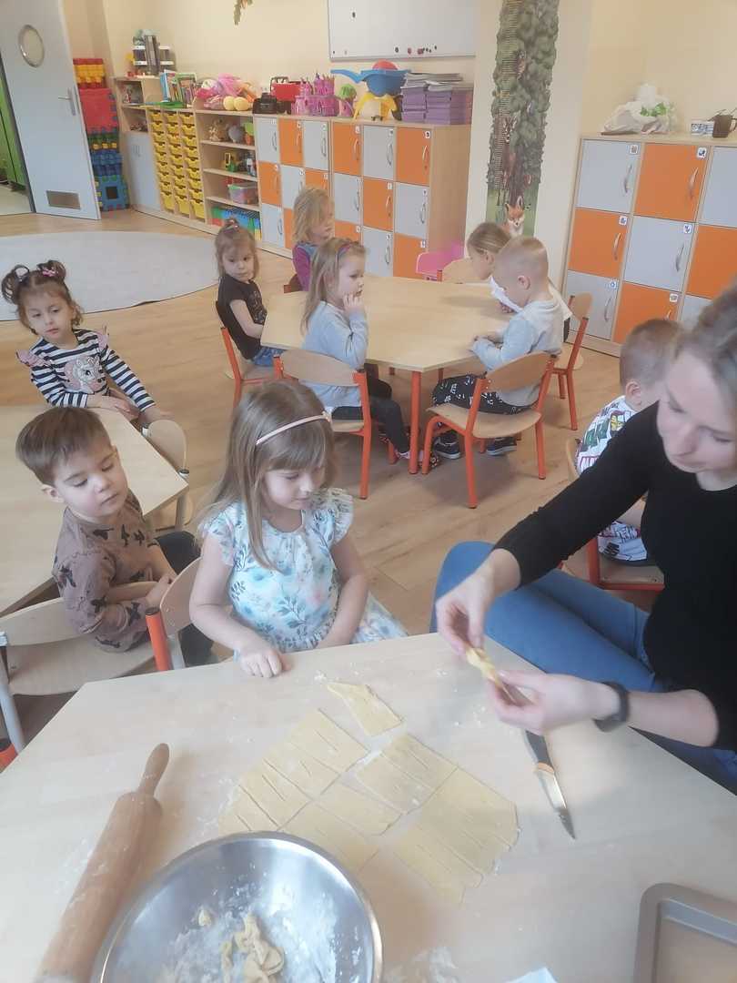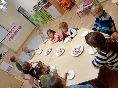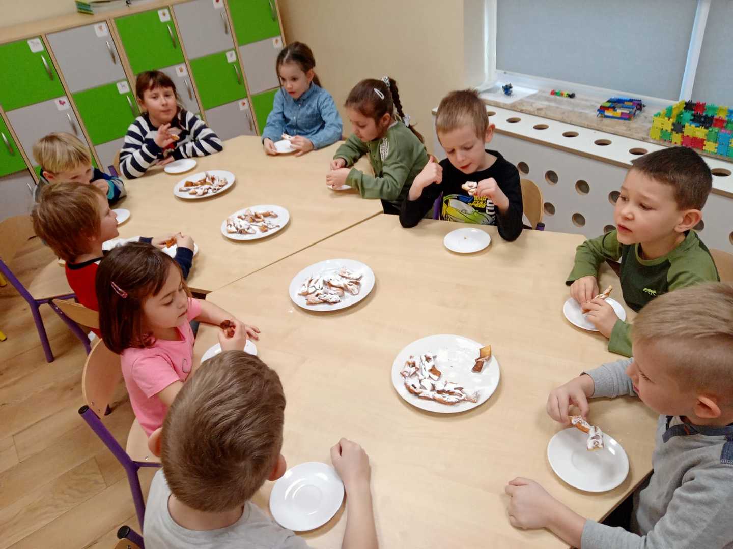Karnawał to czas uczt i zabaw. Najhuczniej i najweselej obchodzimy „ostatki”, a przede wszystkim „Tłusty Czwartek”, który w naszym przedszkolu obchodziliśmy 16 lutego. Ten radosny dzień rozpoczęliśmy od przygotowywania składników na faworki. Następnie przedszkolaki z wielką radością wsypywały mąkę, wbijały jajka, wyrabiały ciasto oraz wałkowały. Gotowe faworki zaniosły do kuchni, gdzie pani Ilona usmażyła je. Na koniec posypaliśmy faworki cukrem pudrem i podczas drugiego śniadania rozpoczęliśmy degustację. Zadowoleni i z pełnymi brzuszkami uczestniczyliśmy w zajęciach dotyczących „Tłustego Czwartku”. Na zajęciach rozmawialiśmy o zdrowych i niezdrowych produktach oraz ustaliliśmy, że słodycze jedzone w nadmiarze są niezdrowe. Starsza grupa stworzyła pączka z papieru zaś młodsze dzieci kolorowały na kartce swoje ulubione pączki. Na koniec każde dziecko zjadło jeszcze pysznego pączka na podwieczorek. Cały dzień był doskonałą okazją do świetnej zabawy oraz do przypomnienia i kultywowania naszych narodowych tradycji i zwyczajów.