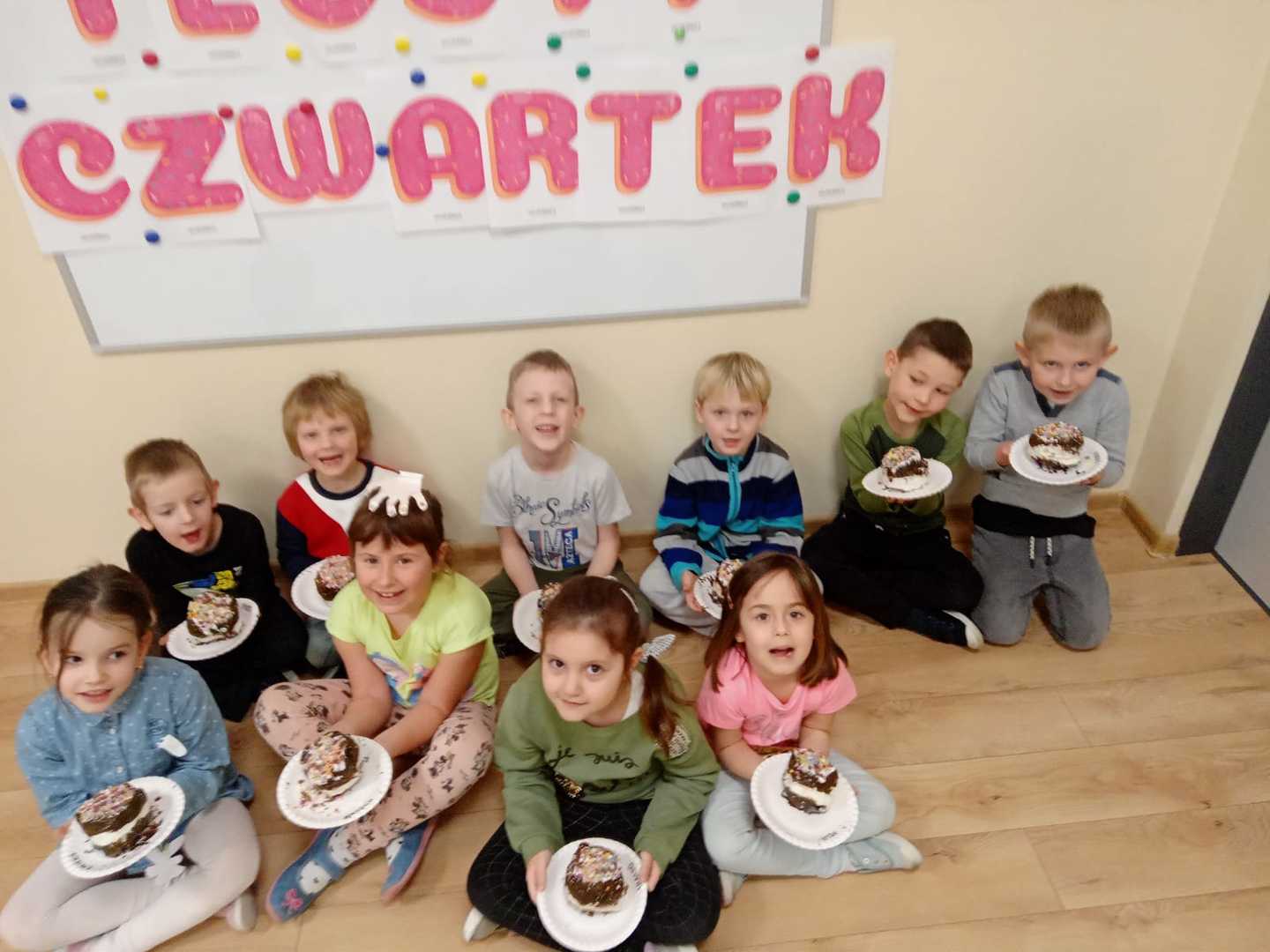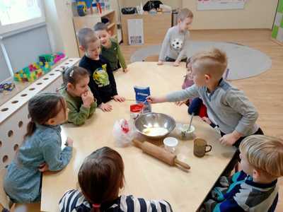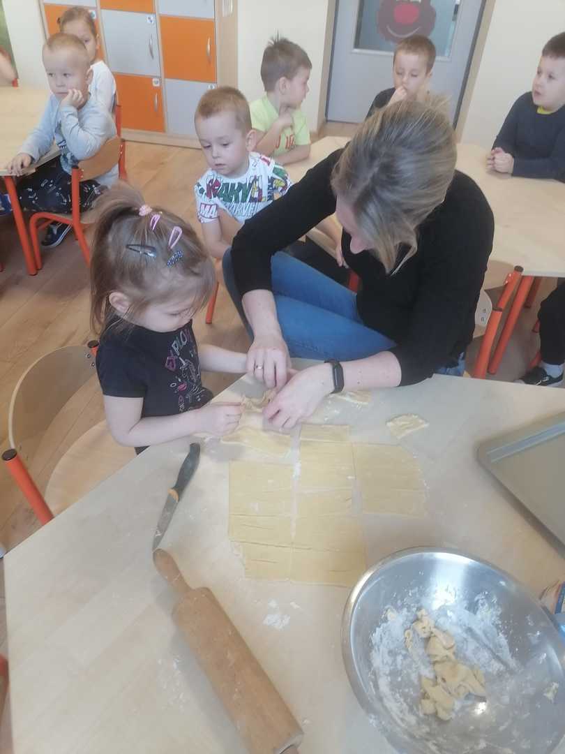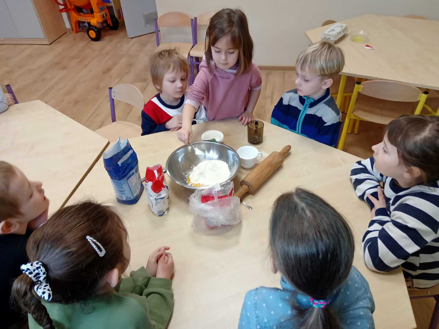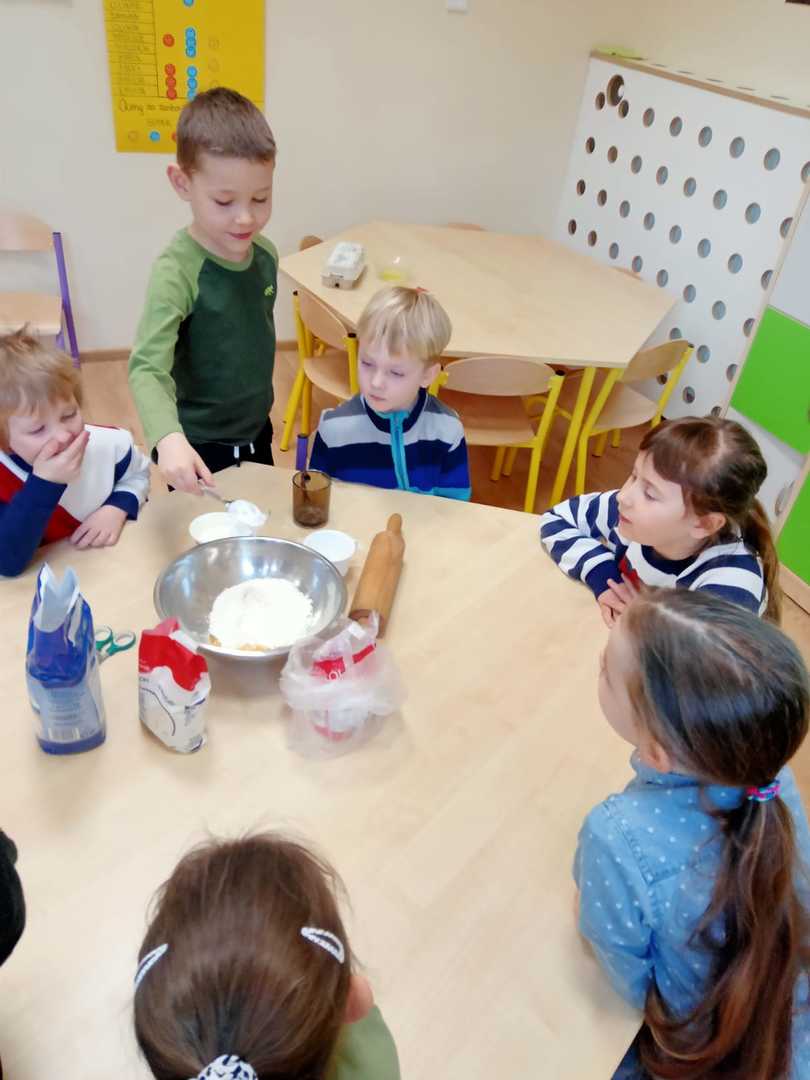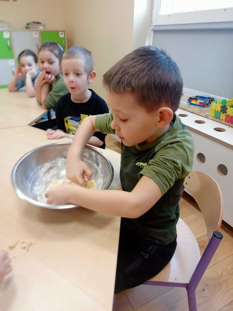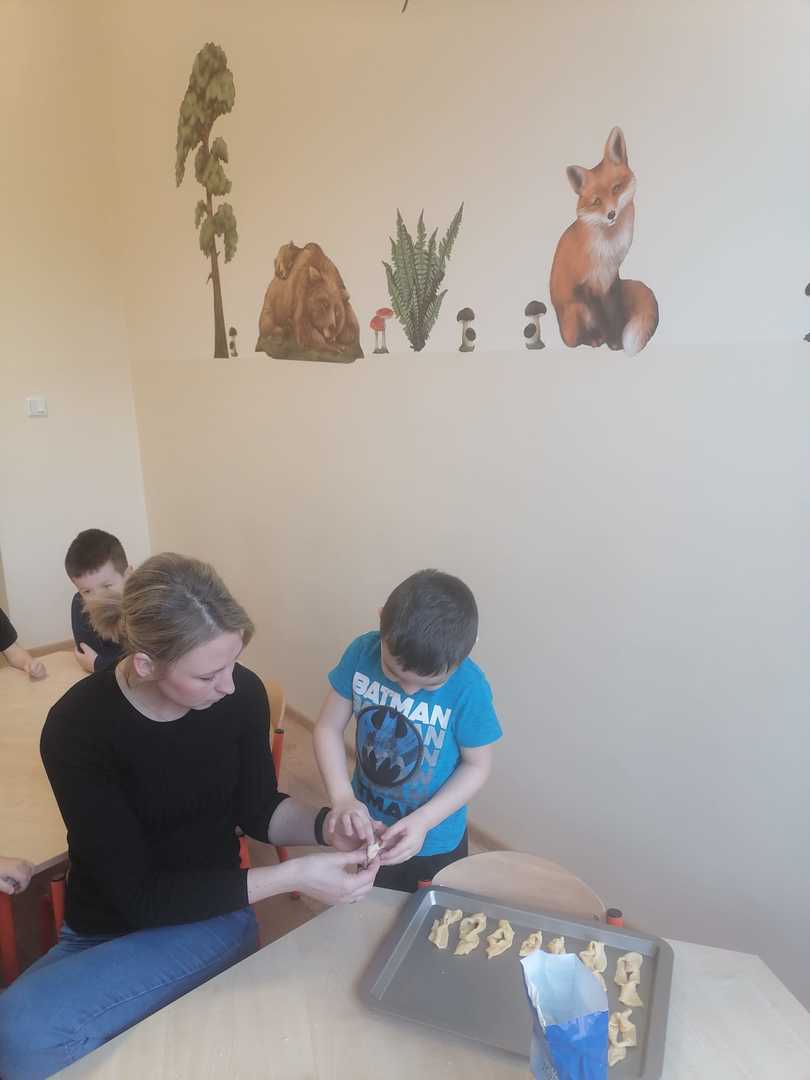 Karnawał to czas uczt i zabaw. Najhuczniej i najweselej obchodzimy „ostatki”, a przede wszystkim „Tłusty Czwartek”, który w naszym przedszkolu obchodziliśmy 16 lutego. Ten radosny dzień rozpoczęliśmy od przygotowywania składników na faworki. Następnie przedszkolaki z wielką radością wsypywały mąkę, wbijały jajka, wyrabiały ciasto oraz wałkowały. Gotowe faworki zaniosły do kuchni, gdzie pani Ilona usmażyła je. Na koniec posypaliśmy faworki cukrem pudrem i podczas drugiego śniadania rozpoczęliśmy degustację. Zadowoleni i z pełnymi brzuszkami uczestniczyliśmy w zajęciach dotyczących „Tłustego Czwartku”. Na zajęciach rozmawialiśmy o zdrowych i niezdrowych produktach oraz ustaliliśmy, że słodycze jedzone w nadmiarze są niezdrowe. Starsza grupa stworzyła pączka z papieru zaś młodsze dzieci kolorowały na kartce swoje ulubione pączki. Na koniec każde dziecko zjadło jeszcze pysznego pączka na podwieczorek. Cały dzień był doskonałą okazją do świetnej zabawy oraz do przypomnienia i kultywowania naszych narodowych tradycji i zwyczajów.