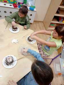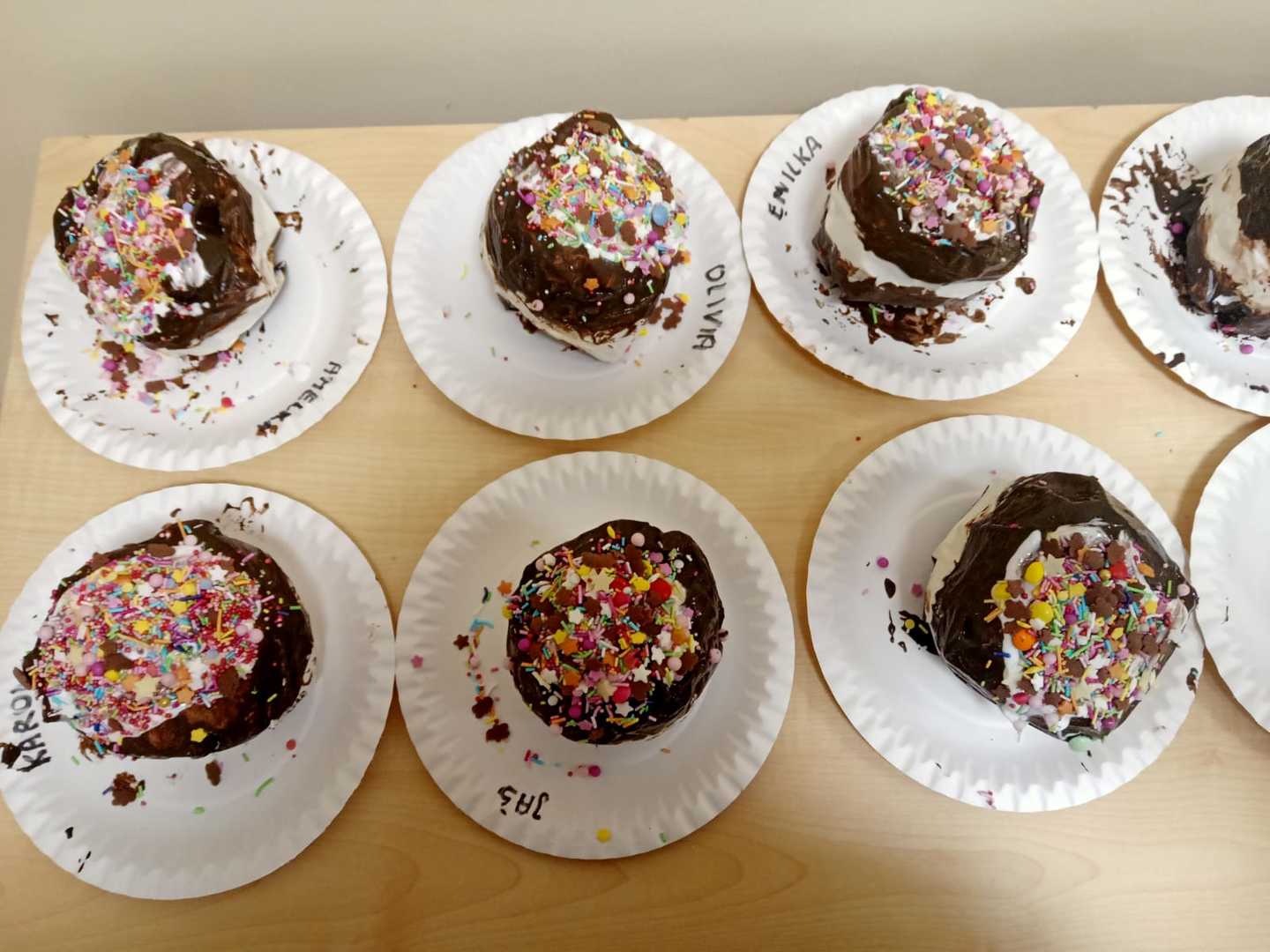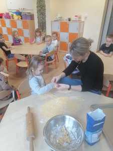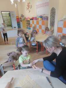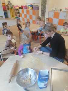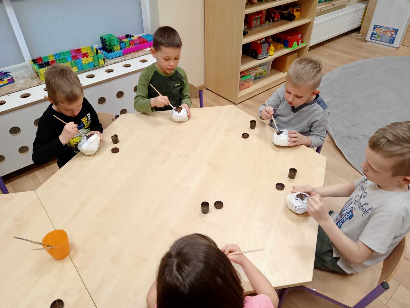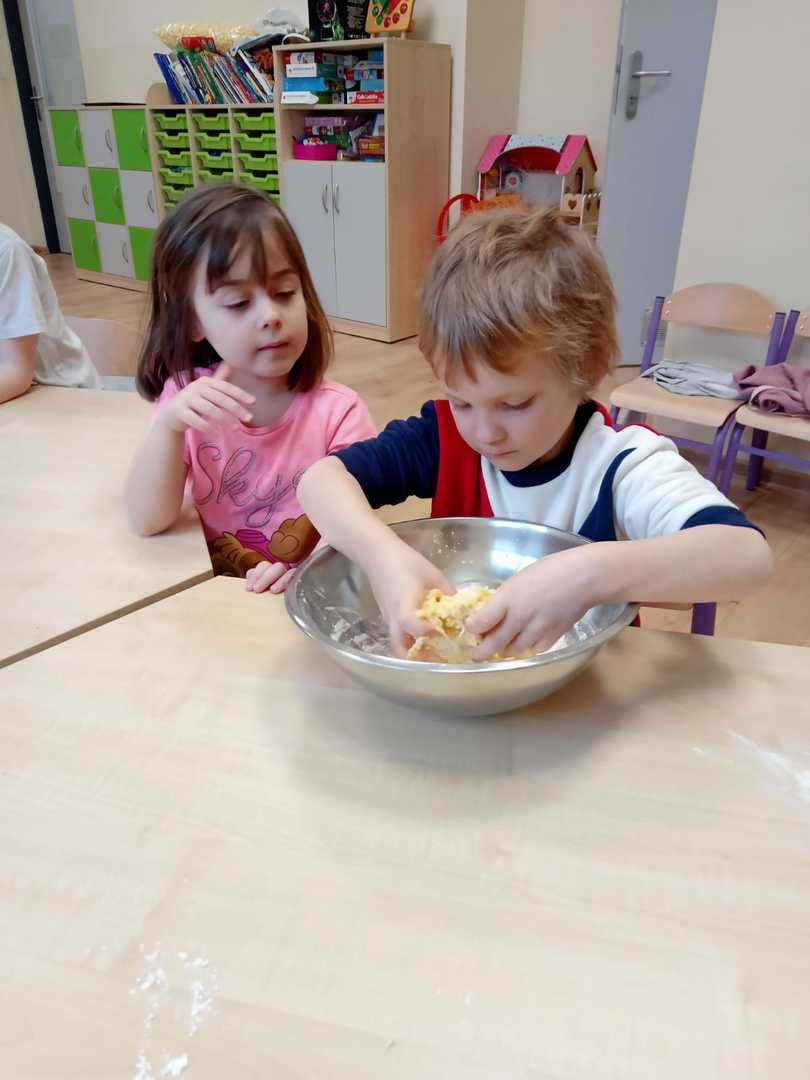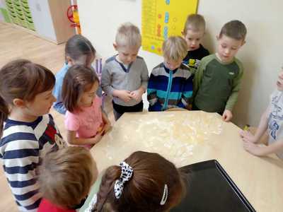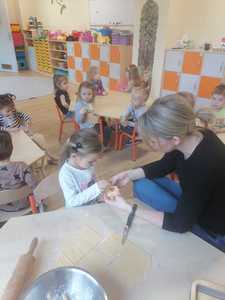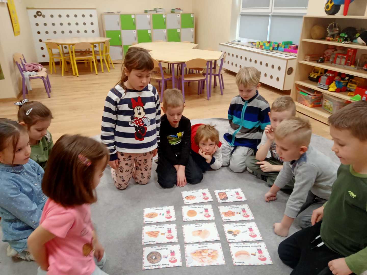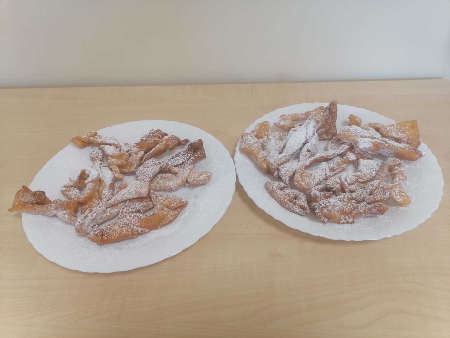 Karnawał to czas uczt i zabaw. Najhuczniej i najweselej obchodzimy „ostatki”, a przede wszystkim „Tłusty Czwartek”, który w naszym przedszkolu obchodziliśmy 16 lutego. Ten radosny dzień rozpoczęliśmy od przygotowywania składników na faworki. Następnie przedszkolaki z wielką radością wsypywały mąkę, wbijały jajka, wyrabiały ciasto oraz wałkowały. Gotowe faworki zaniosły do kuchni, gdzie pani Ilona usmażyła je. Na koniec posypaliśmy faworki cukrem pudrem i podczas drugiego śniadania rozpoczęliśmy degustację. Zadowoleni i z pełnymi brzuszkami uczestniczyliśmy w zajęciach dotyczących „Tłustego Czwartku”. Na zajęciach rozmawialiśmy o zdrowych i niezdrowych produktach oraz ustaliliśmy, że słodycze jedzone w nadmiarze są niezdrowe. Starsza grupa stworzyła pączka z papieru zaś młodsze dzieci kolorowały na kartce swoje ulubione pączki. Na koniec każde dziecko zjadło jeszcze pysznego pączka na podwieczorek. Cały dzień był doskonałą okazją do świetnej zabawy oraz do przypomnienia i kultywowania naszych narodowych tradycji i zwyczajów.