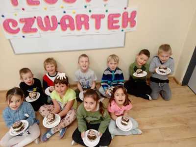 „Był sobie pączek, co nie miał rączek i okrąglutki był jak miesiączek. Miał lukrowaną, złocistą skórkę, a w środku dziurkę na konfiturę. Wszyscy go lubią, starsi i dzieci, na jego widok aż ślinka leci. Lecz co naprawdę pączki są warte, to wie najlepiej KTO - TŁUSTY CZWARTEK.”