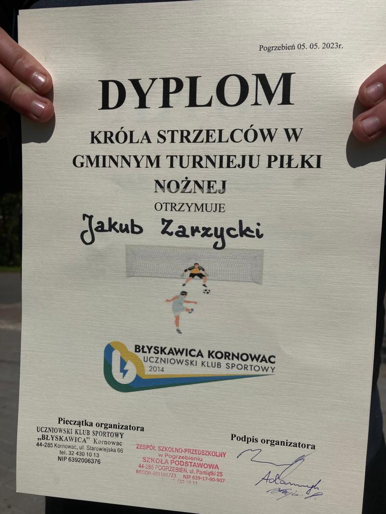 5 maja 2023r jedenastoosobowa drużyna reprezentująca Szkołę w Rzuchowie wyruszyła na rowerach do Pogrzebienia na gminny turniej piłki nożnej organizowany w ramach Uczniowskiego Klubu Sportowego. Turniej był zarazem eliminacjami do rozgrywek powiatowych. Pierwszy mecz turnieju to pojedynek Rzuchowa z Pogrzebieniem, w którym toczyła się wyrównana walka, a po pięknej indywidualnej akcji Jakuba Zarzyckiego drużyna wyszła na prowadzenie i nie oddała go już do końca meczu. Pierwszy mecz zakończył się wynikiem: ZSP Rzuchów 1:0 ZSP Pogrzebień. W drugim meczu z Kobylą walka była wyrównana, jednak finalnie wygrała szkoła z Kobyli po trafieniu Patryka Metela. Trzeci mecz, to walka zawodników Kobyli z Pogrzebieniem, w którym bramki strzelili: Wojtek Helis i Michał Porębski. Mecz zakończył się wynikiem 1:1 dla Pogrzebienia i Kobyli. Klasyfikacja końcowa: